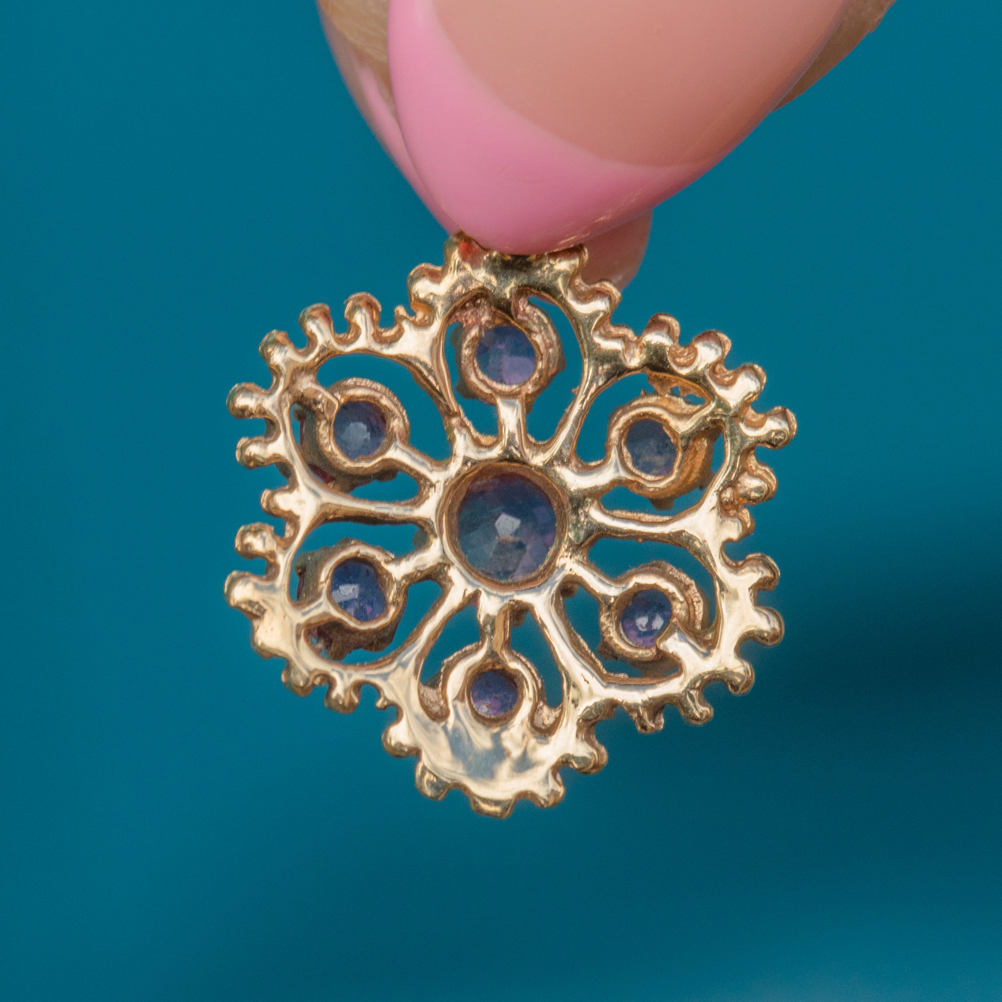 EXCELLENT. With all her Sapphires secure and free from any wear, the Gold buttery and the body of the pendant having remained well formed, this 14ct Gold pink Sapphire flower pendant is in excellent condition and can be worn with confidence with the use of its robust bale!