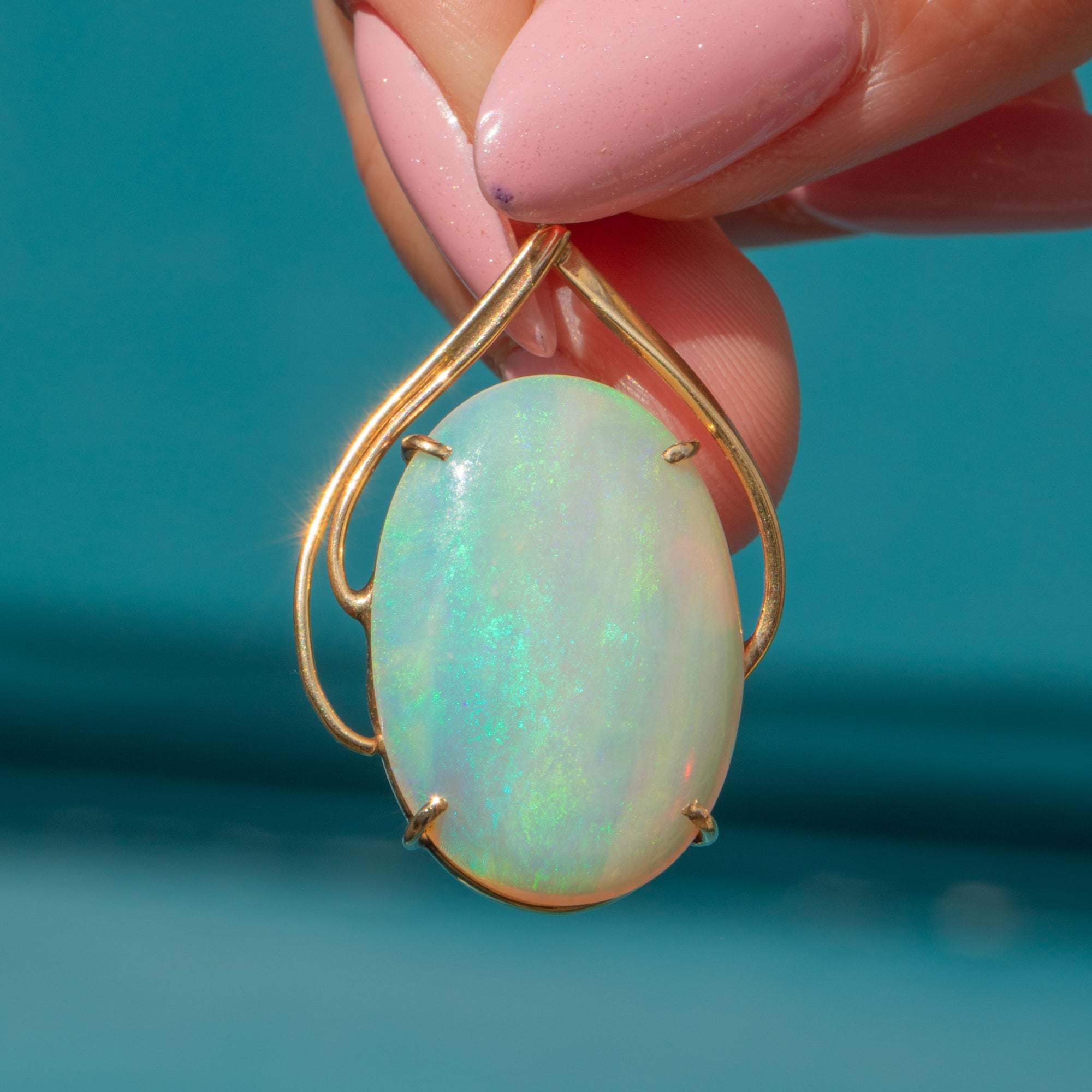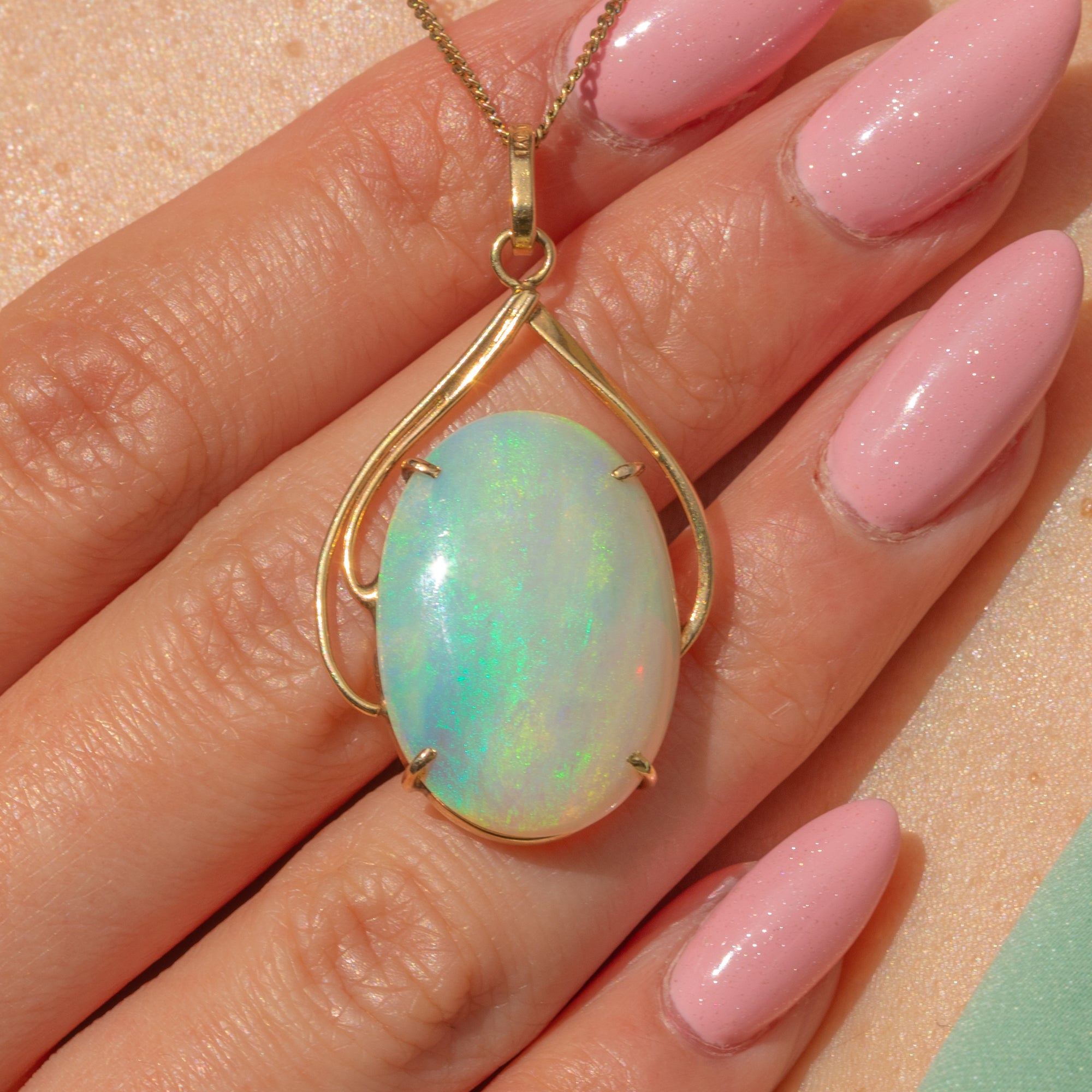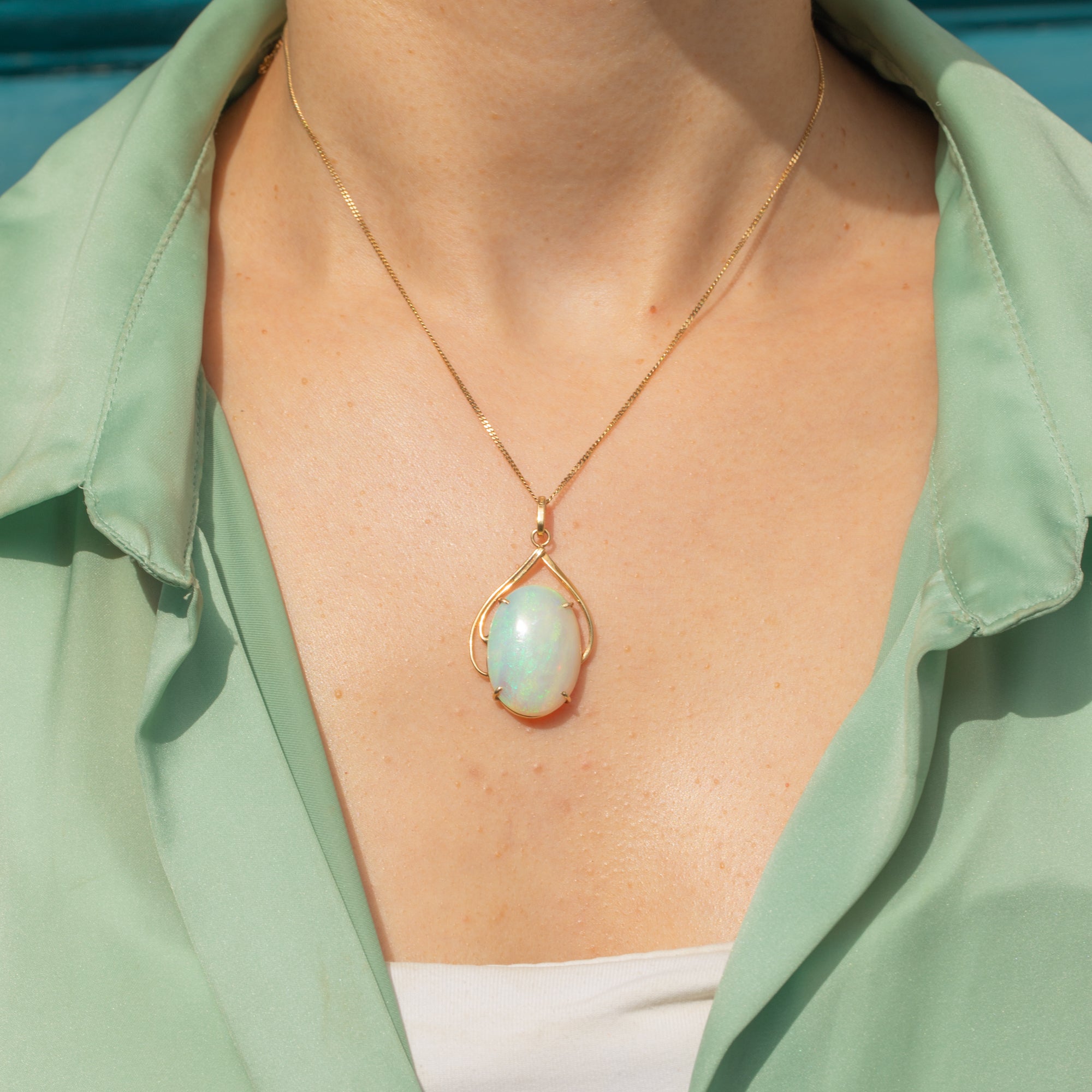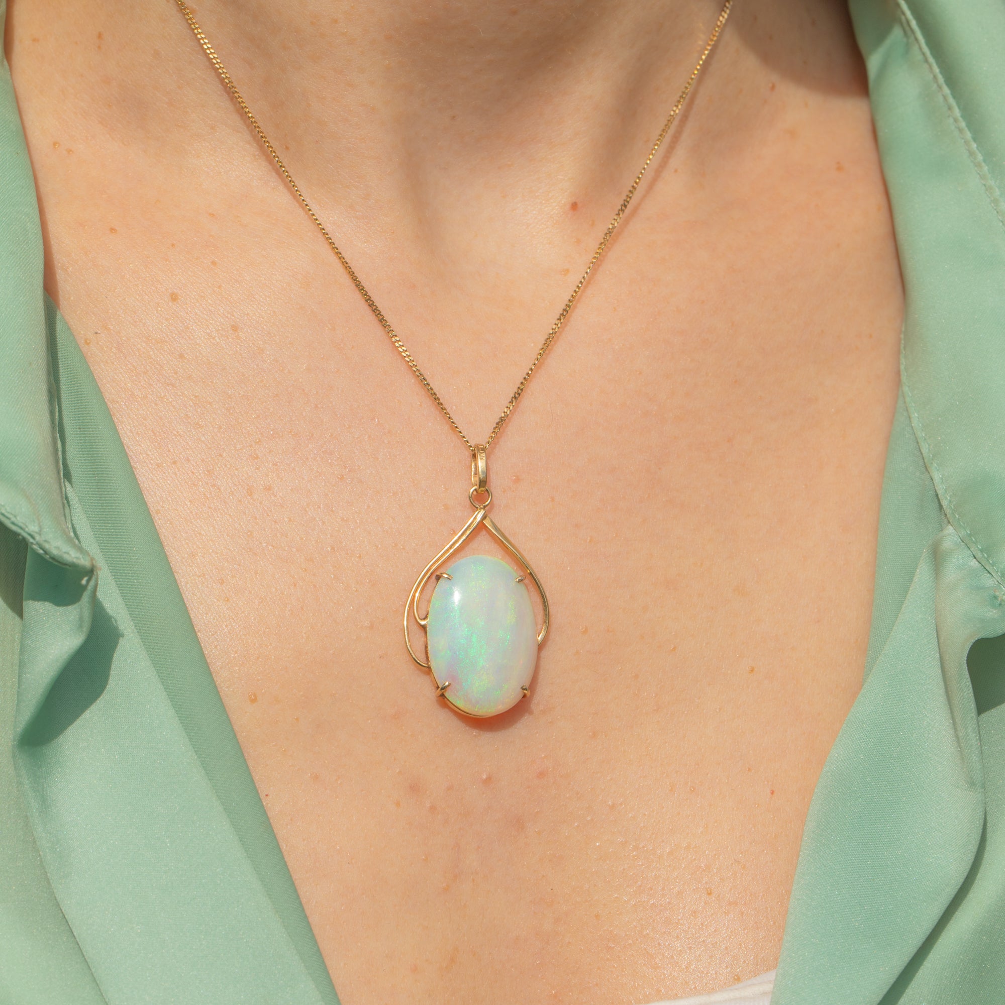 The large oval Opal cabochon is displayed within elegant claws and crowned by curvaceous 14ct Gold wirework, giving this mid-century vintage pendant a gorgeous fluid silhouette.