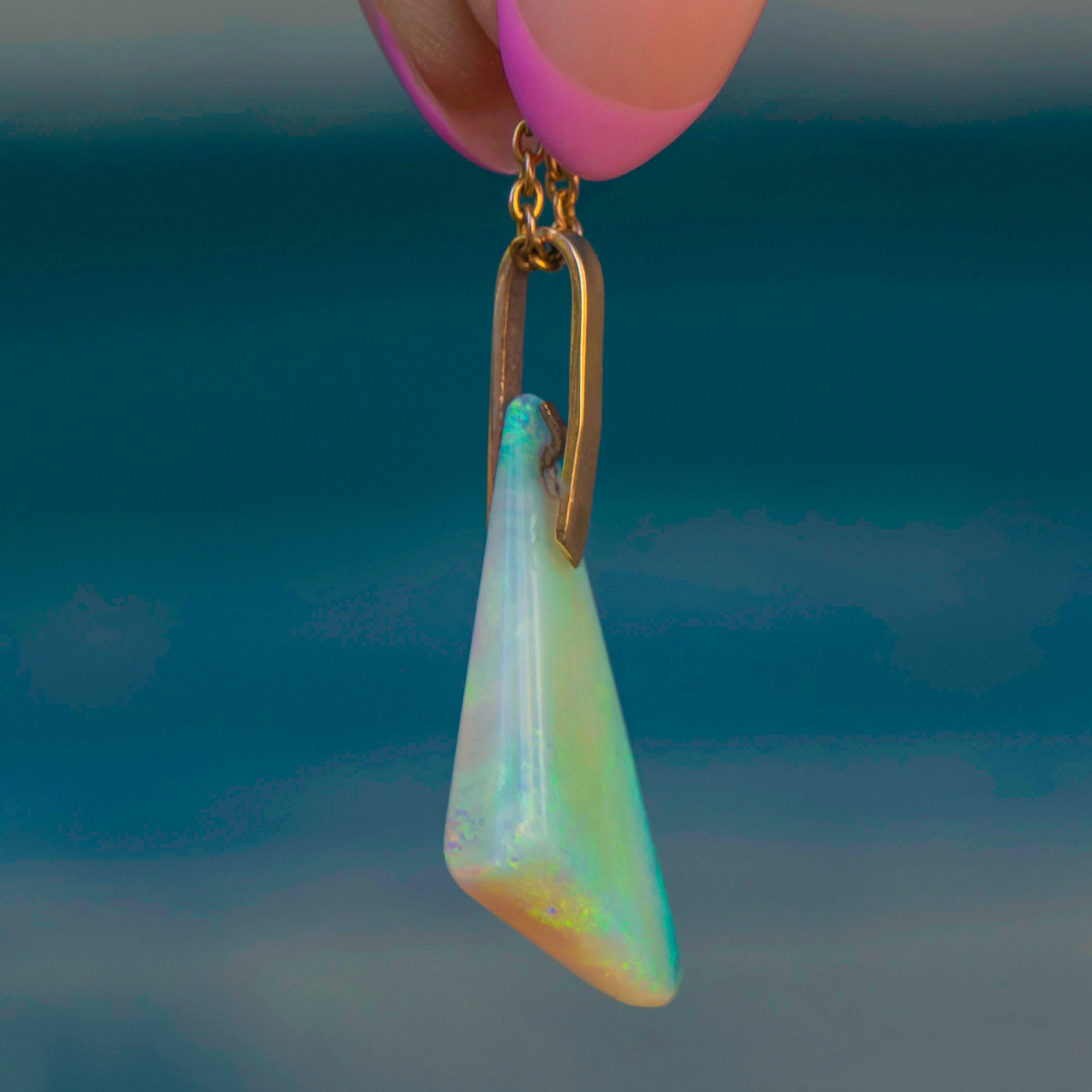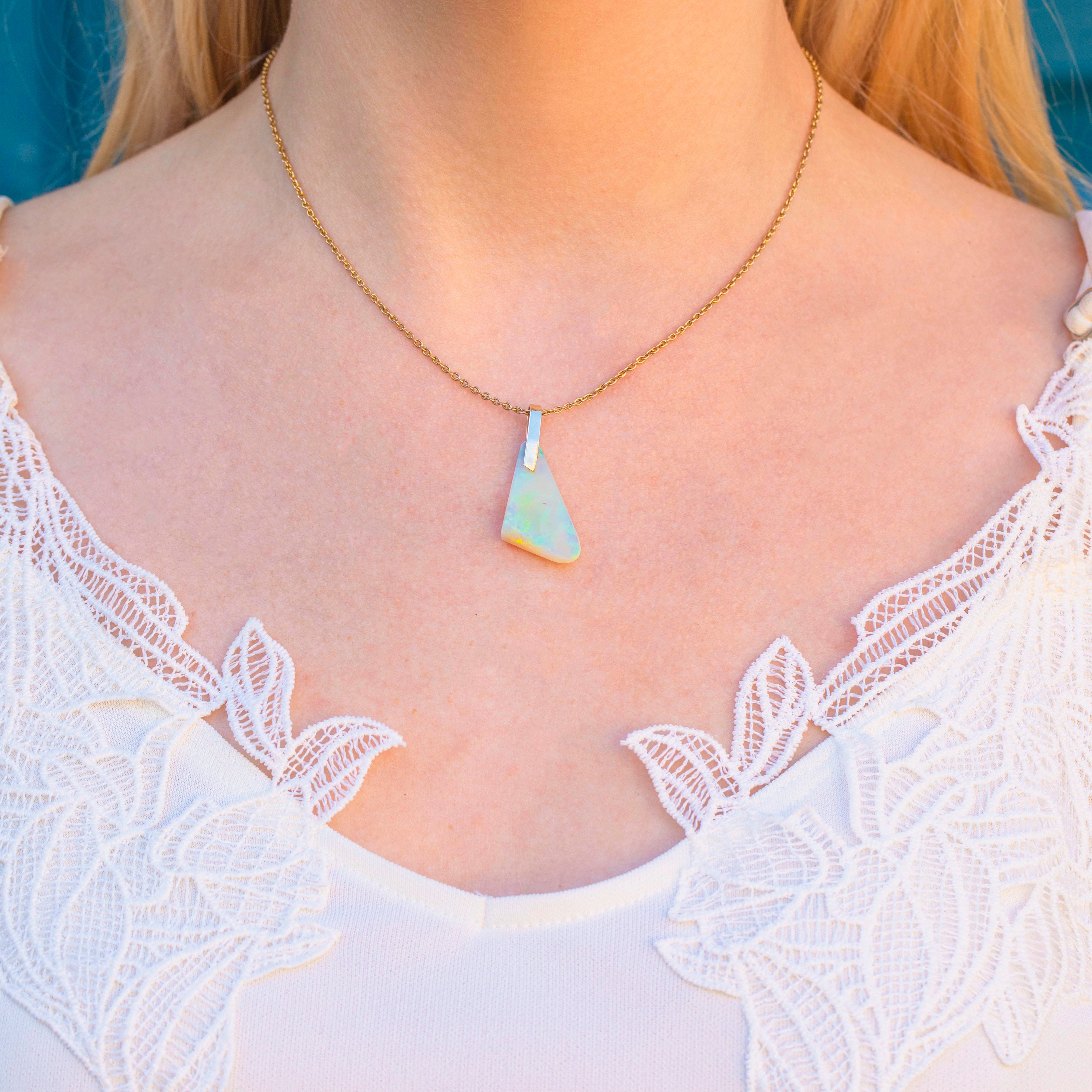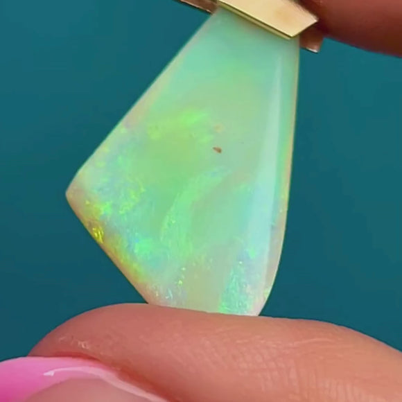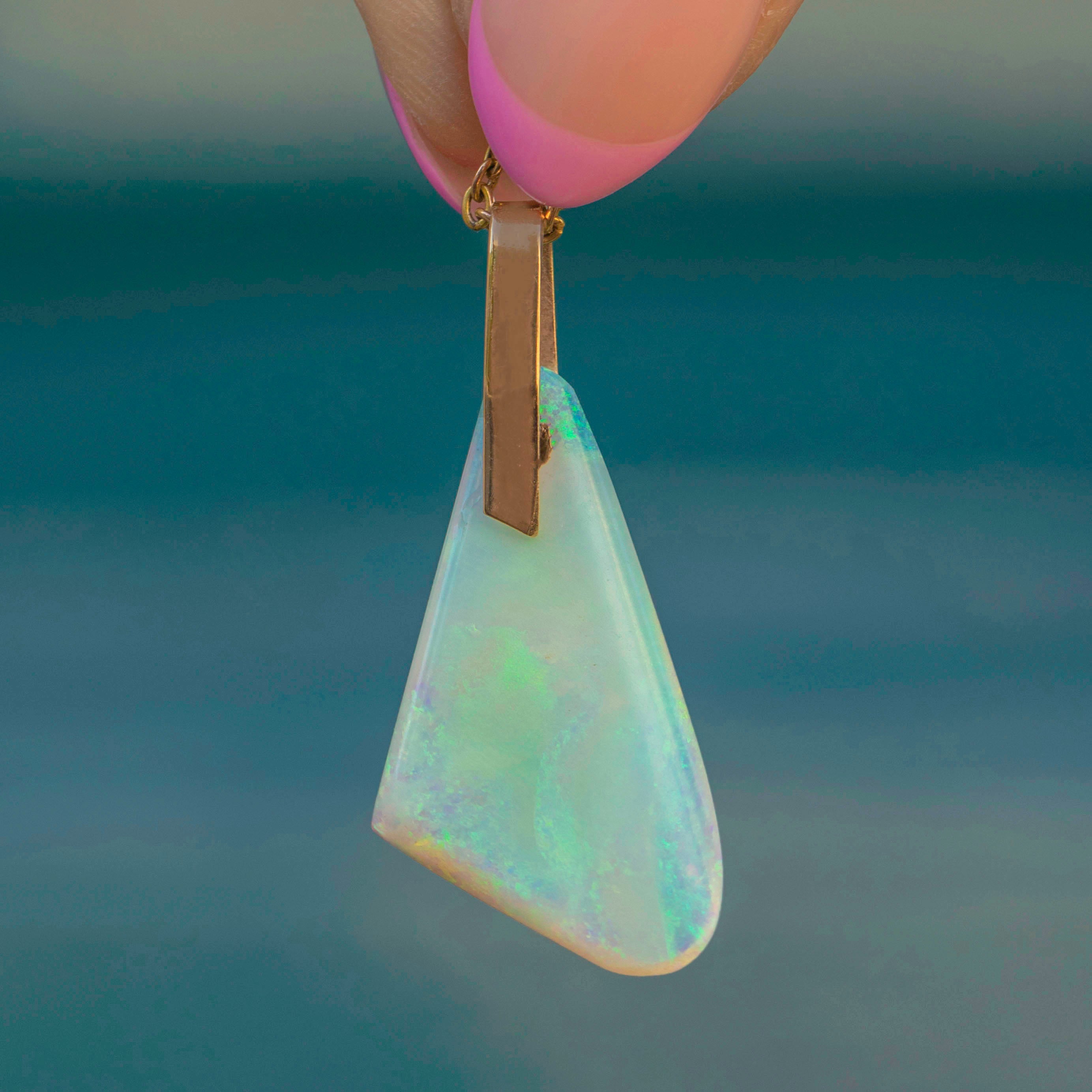 VERY GOOD. This 14ct Gold solid Opal pendant is in very good condition. The Opal is gorgeously bright with only a few surface marks, commensurate with age. Her 14ct Gold bale is brightly saturated and although she has a few discolourations and scuffs, this is only noticeable under close inspection and not visible when worn. She is a splendid piece of mid-century jewellery to have in your collection.