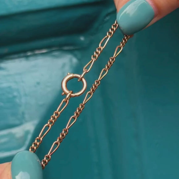 EXCELLENT. This 15.5" antique 9ct Gold Figaro chain is in excellent condition. Her links are securely connected with a rich tone running evenly through every link. The bolt ring is in fine working order allowing you to wear her with the utmost confidence!
