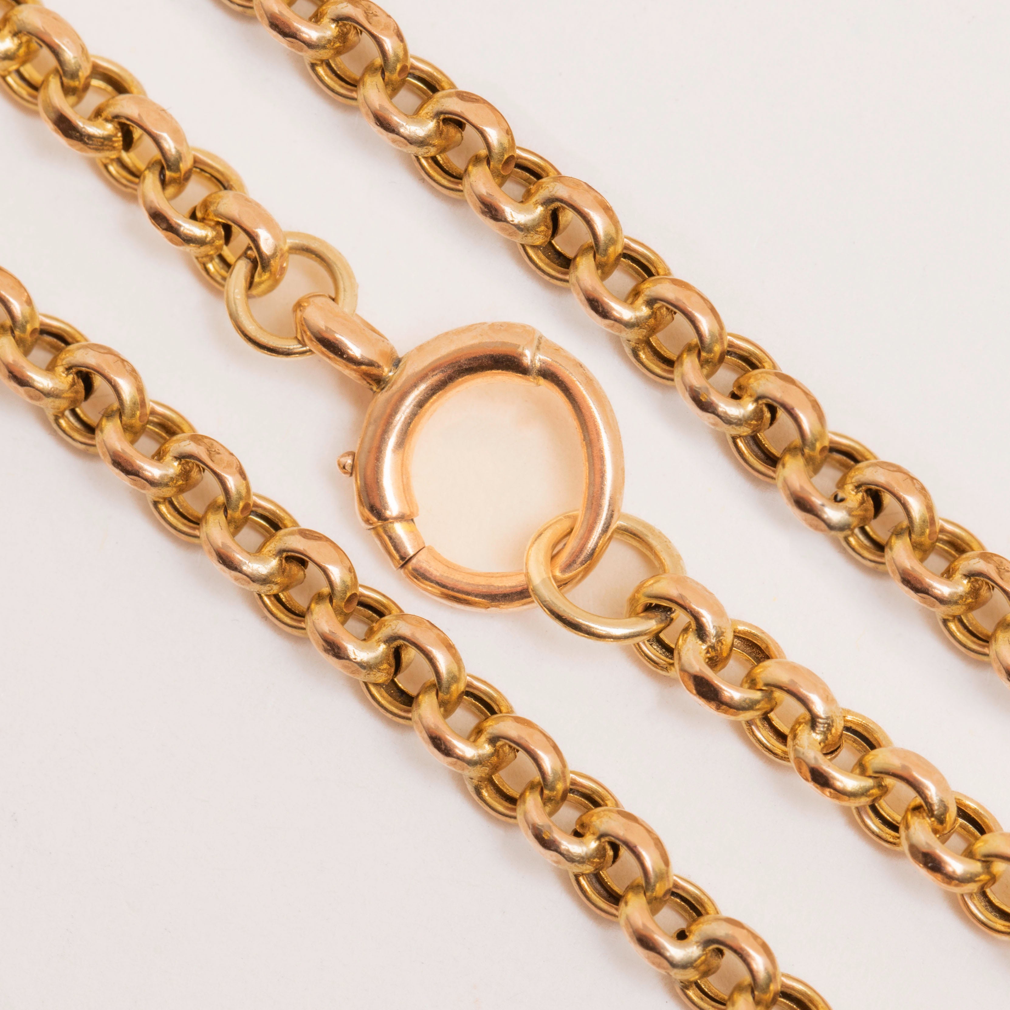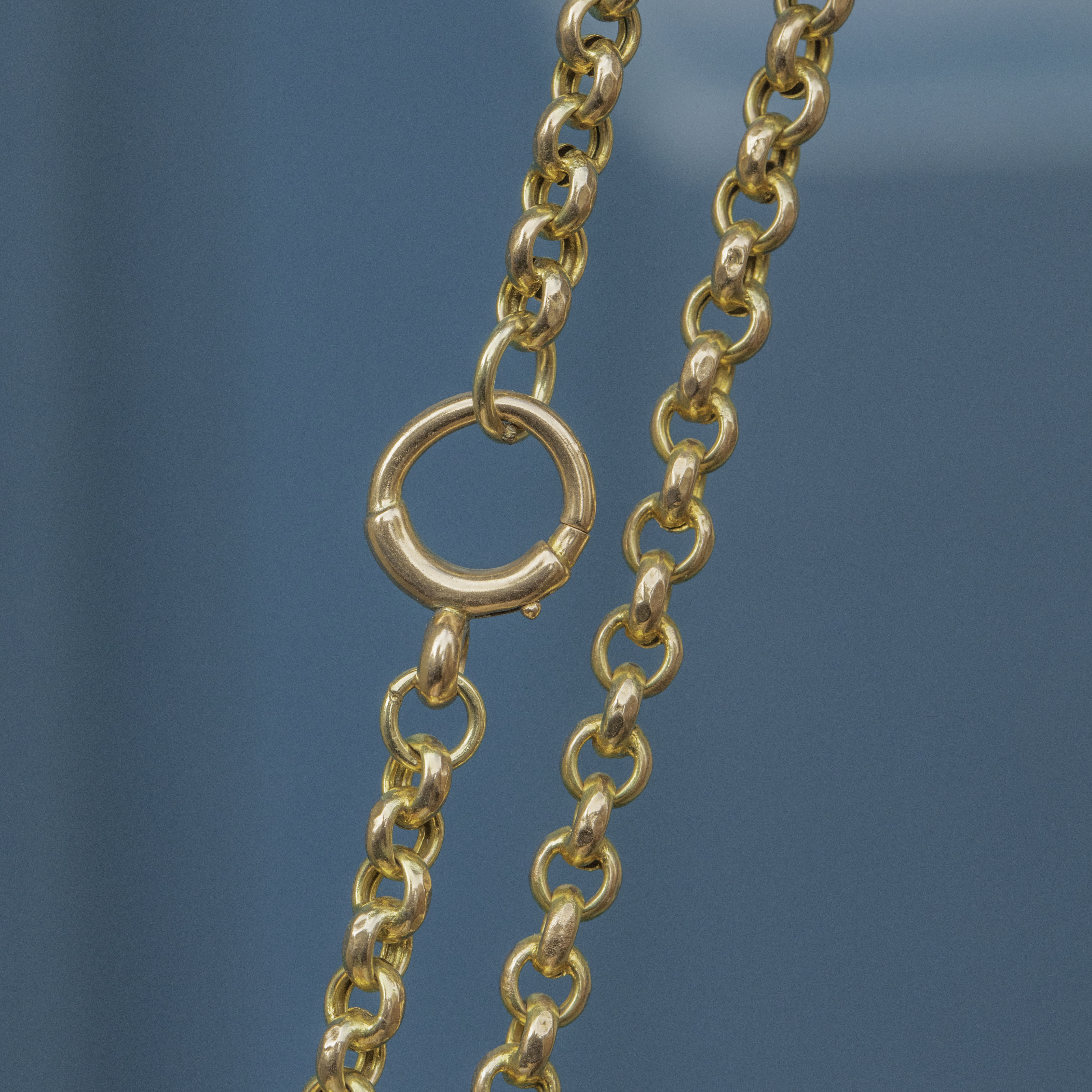 This striking 9ct Gold belcher chain is bursting with character! With chunky, saturated belcher links and a large antique bolt-ring, this Victorian Gold chain is a real conversation starter.