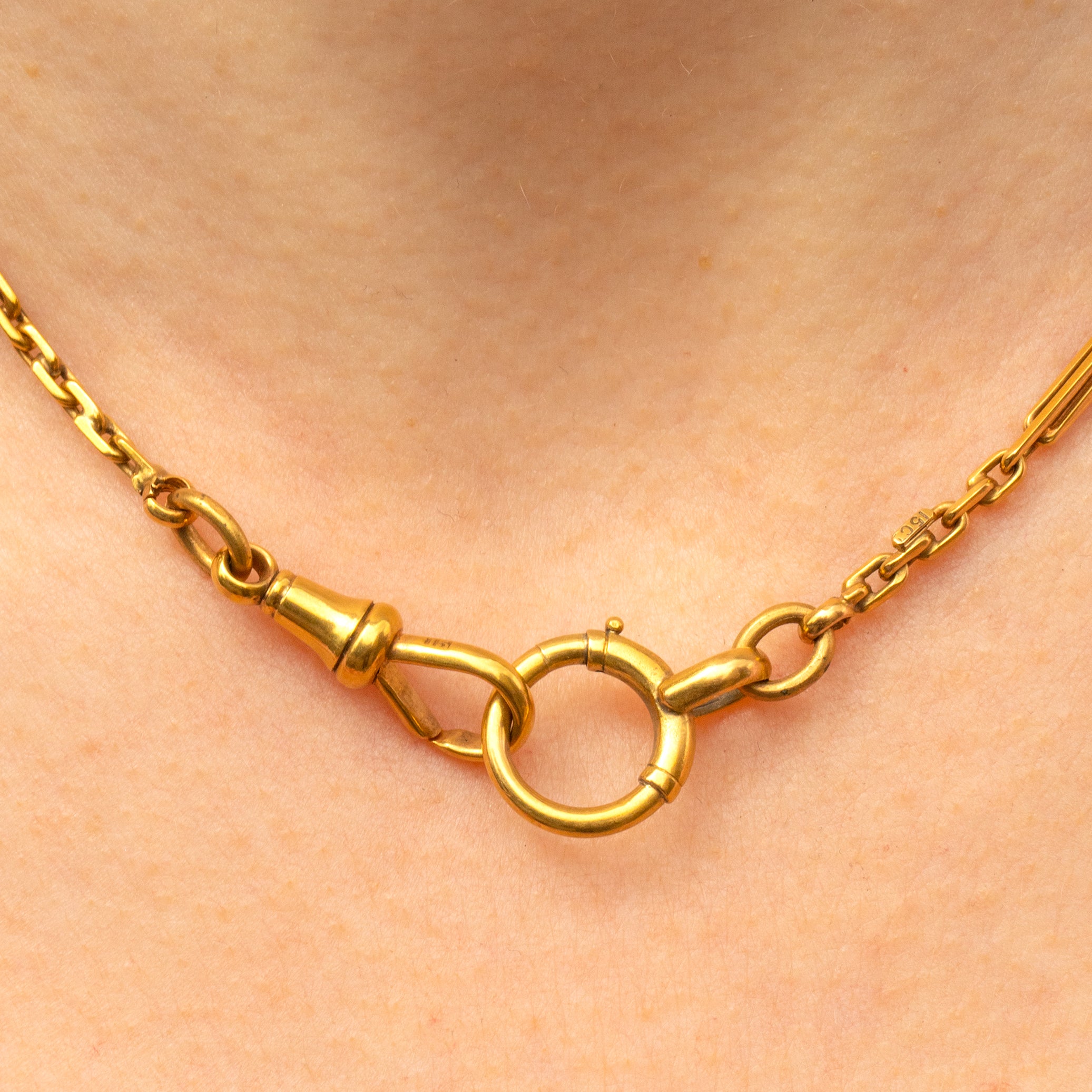 A rare treat, not only does she come with a sumptuous T-Bar drop, but this solid Gold chain has a dog-clip and bolt-ring providing you with ample styling opportunities! Either wear this Victorian necklace with the T-Bar suspended across your clavicle or make use of the clasps and affix your favourite charm or pendant for a personal touch.