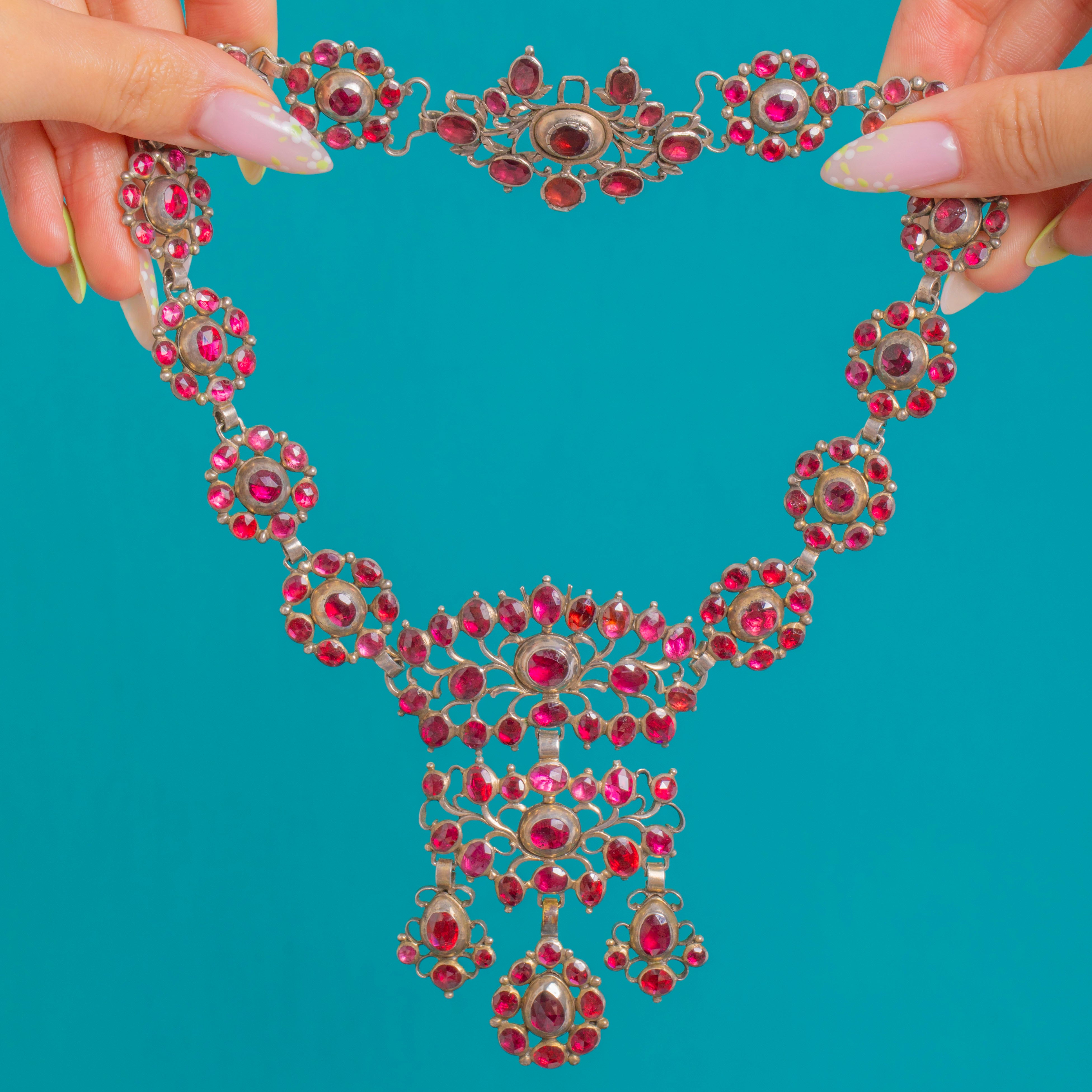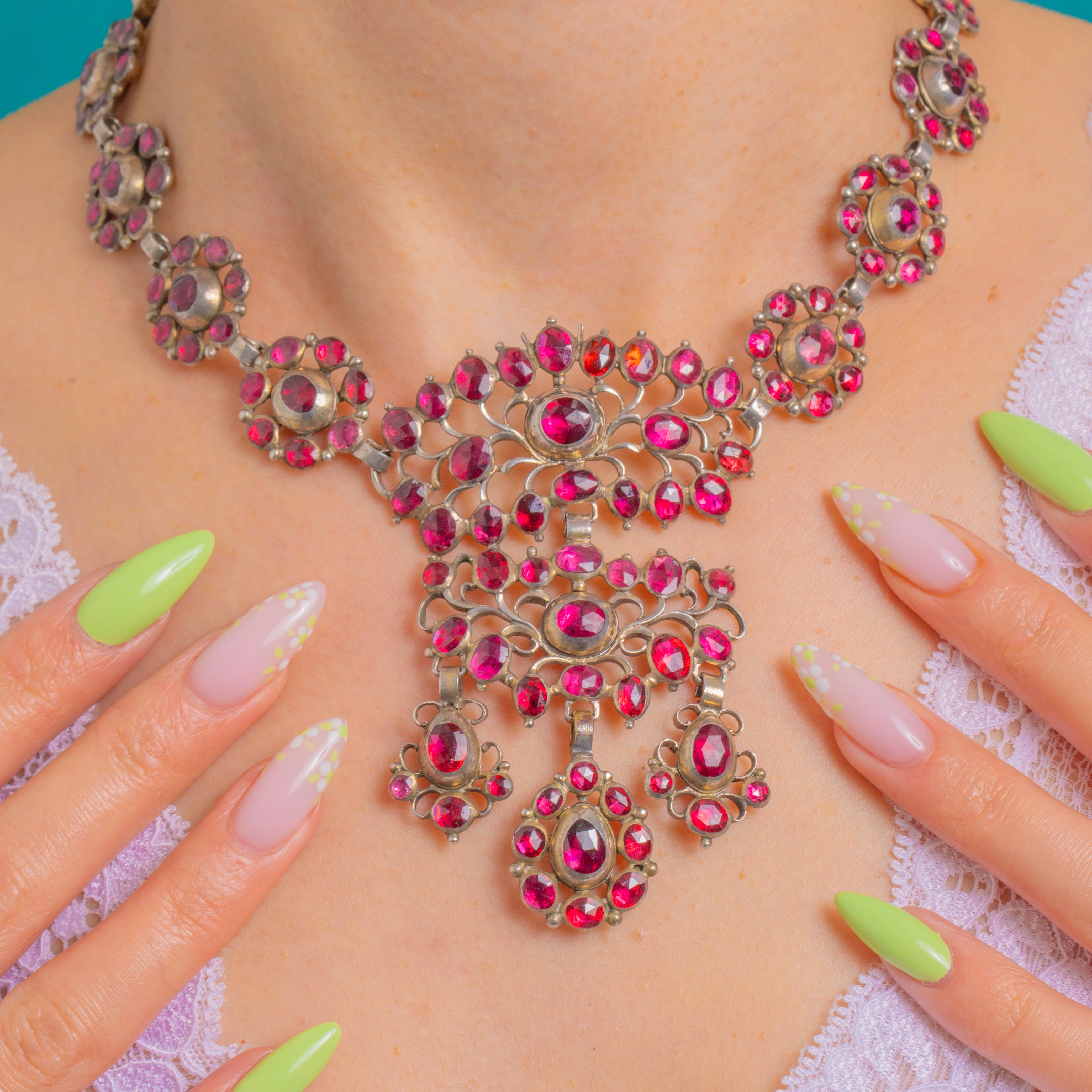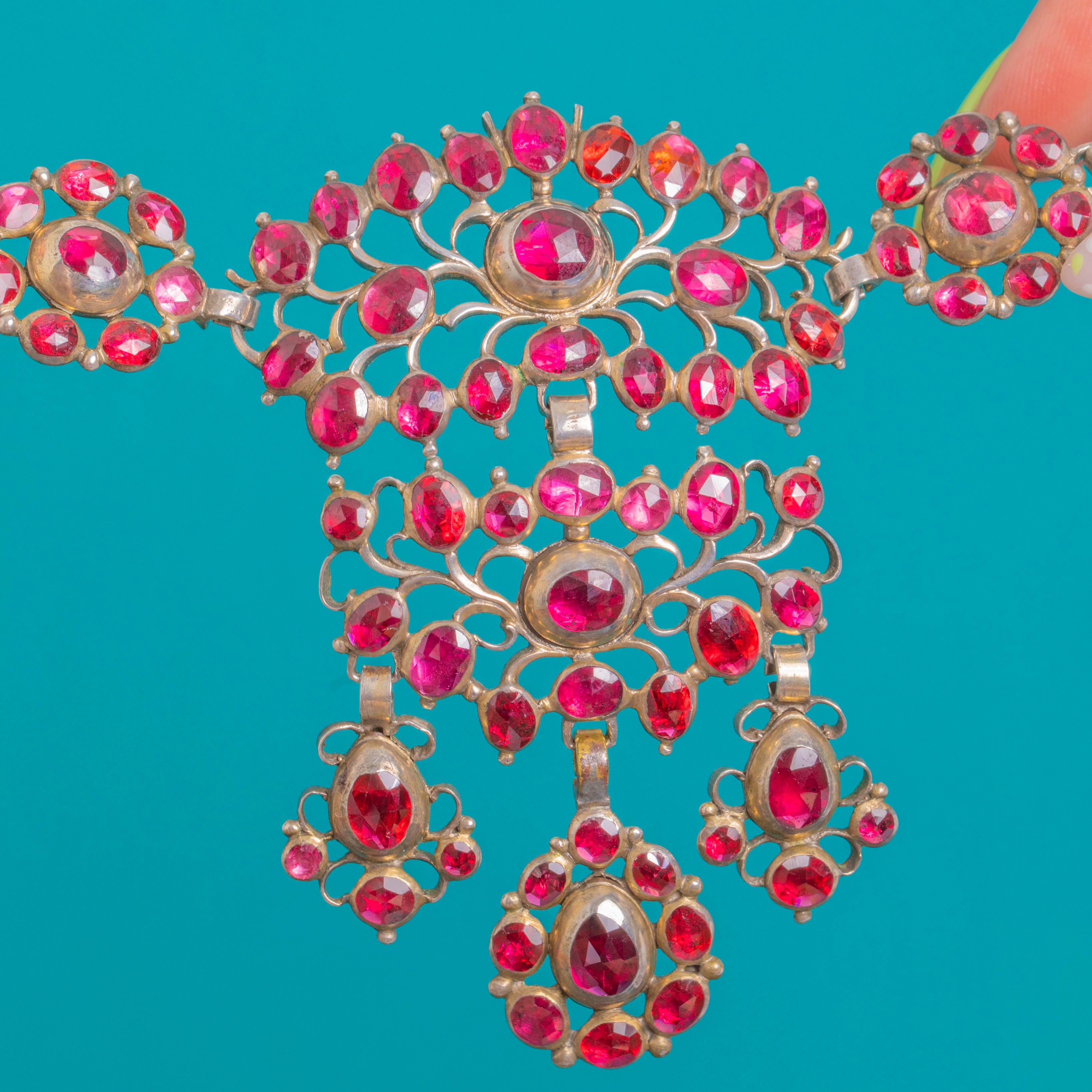 この壮麗なGeorgianガーネットネックレスは、ロゼットクラスターとオープンワークの中央プラーク、さらに3つのアーティキュレートドロップから成る、贅沢なビブタイプのネックレスです。ガーネットは豊かなワインレッドに輝き、ラウンド、オーバル、ペアシェイプのドロップが華やかなハロー状に配され、デコルテにドラマティックでロマンティックな存在感をもたらします。総カラット数は約65.00ctです。