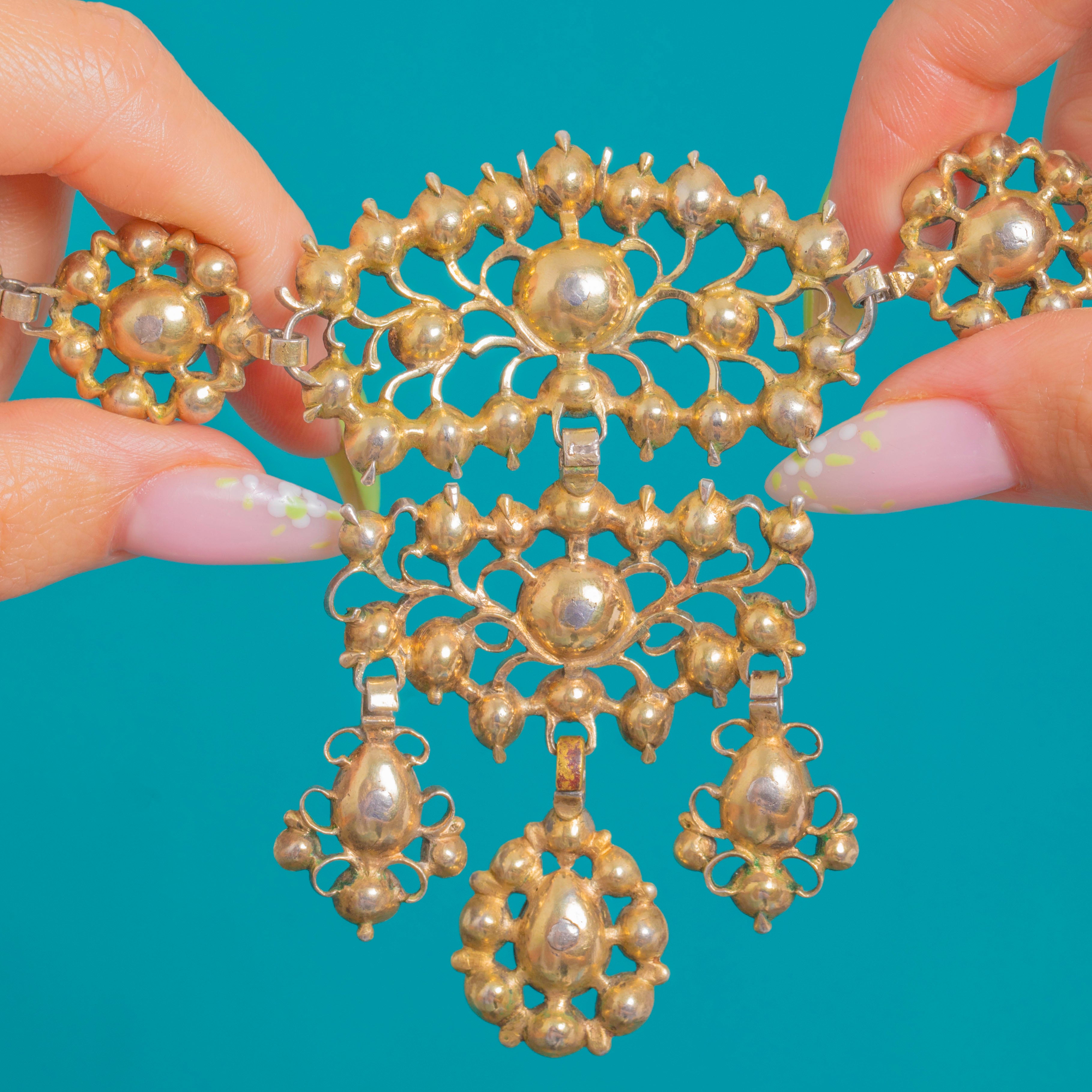 各ストーンはクローズドバックでしっかりとシルバーのコレットセッティングに収められ、裏側は9ctゴールドで補強されています。複数のパーツが連結されているため、ネックレスは美しくしなやかに動きます。フォリッジスクロール、フローラルロゼット、そしてクラシックなジランドールシルエットが、洗練されたGeorgian期の壮麗さと時を超えたイブニングエレガンスを体現しています。