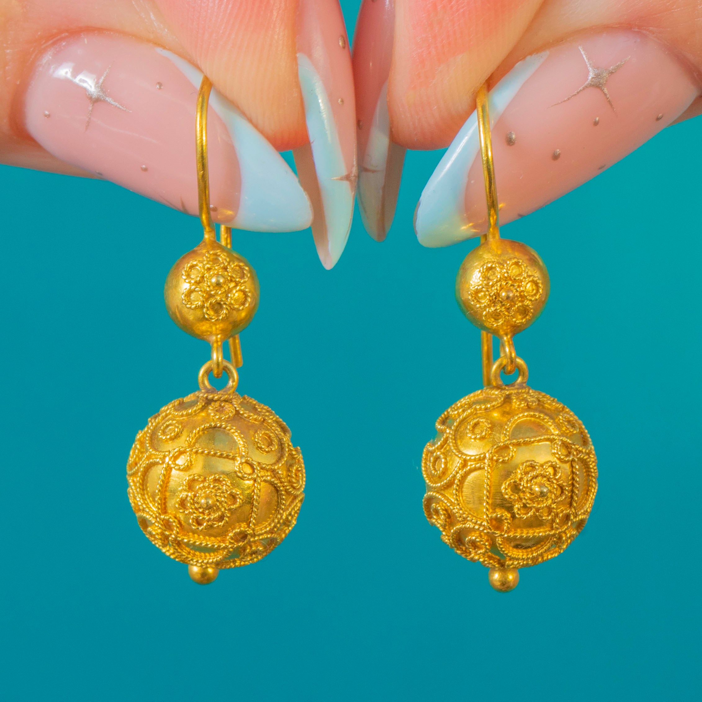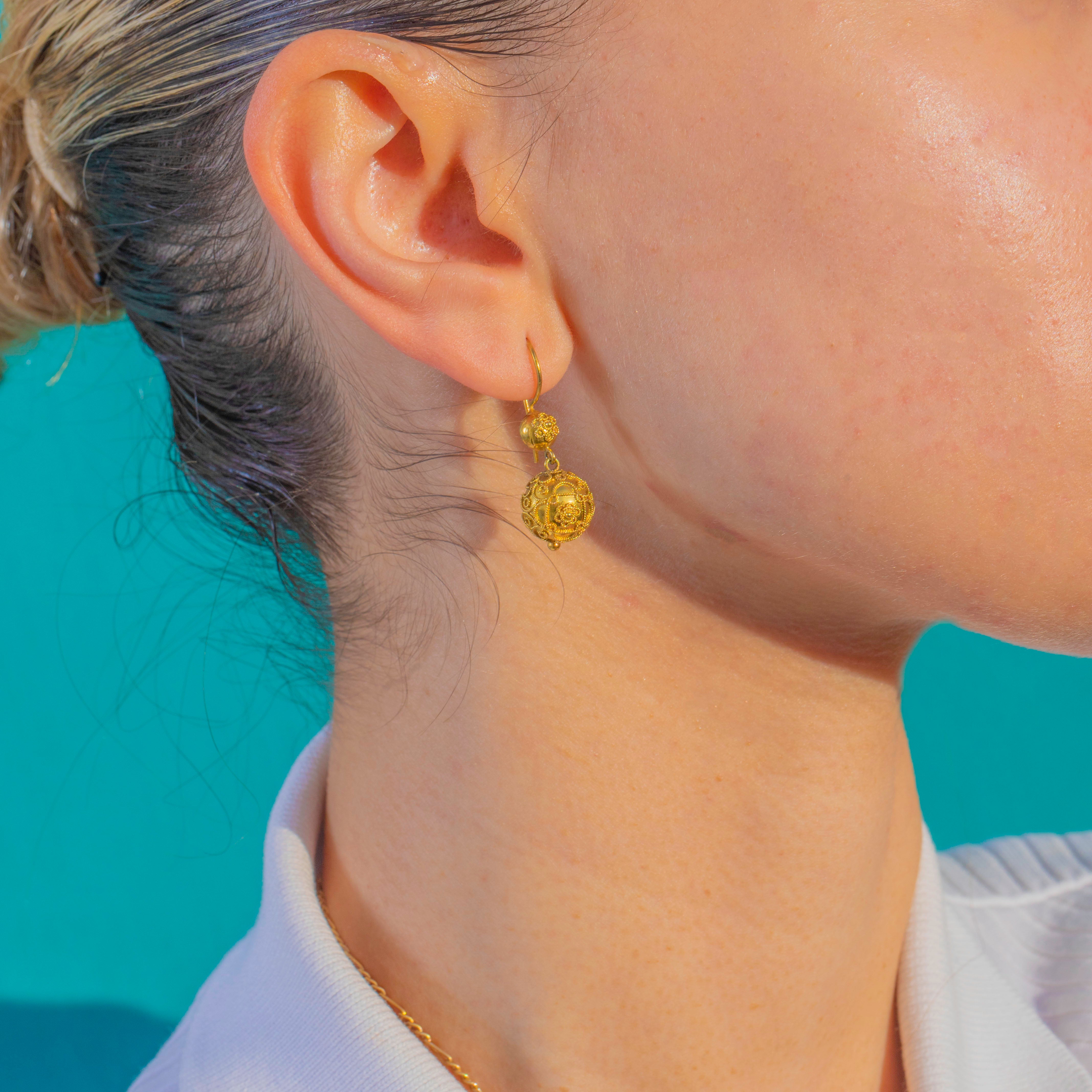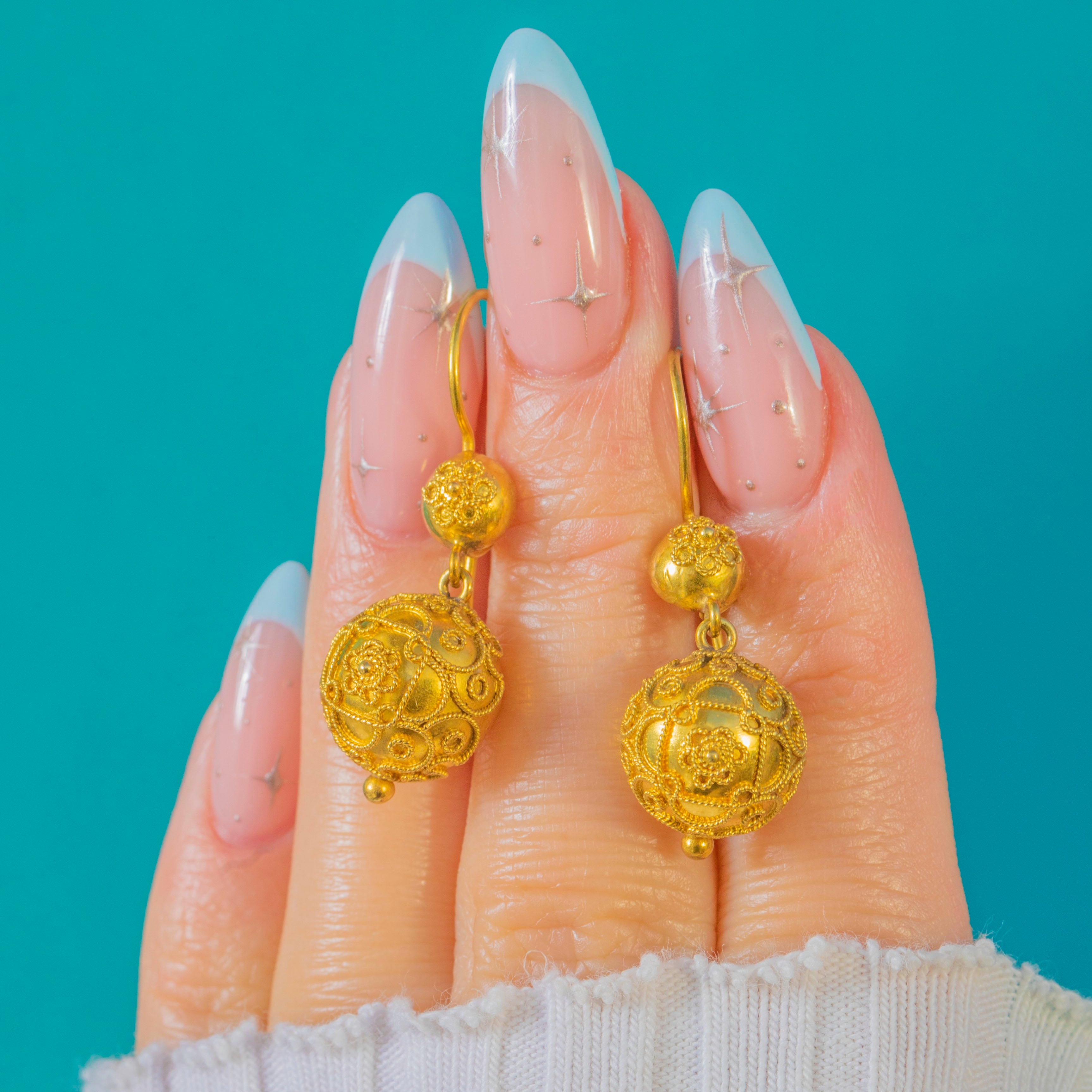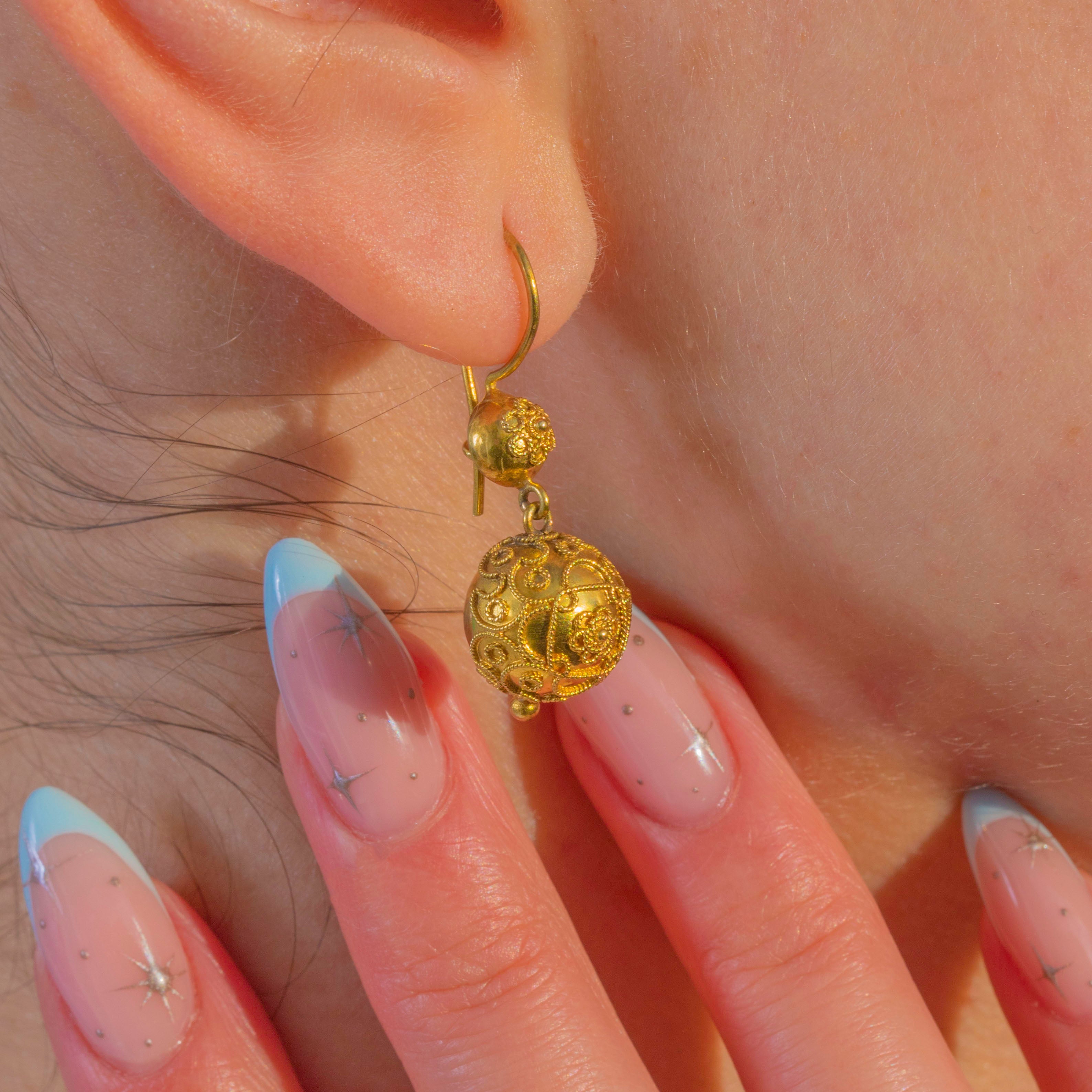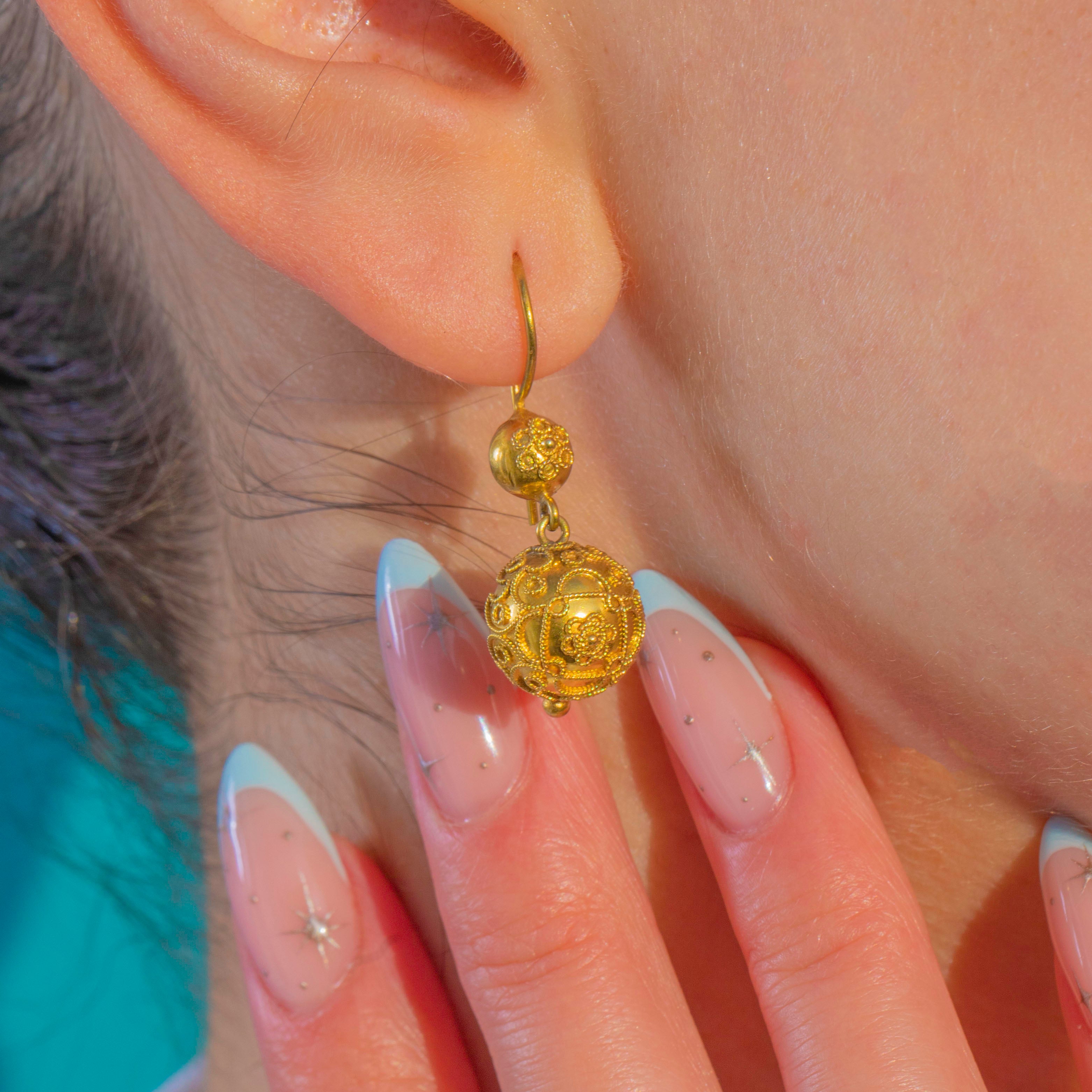 贅沢な質感と美しい均衡を備えた、Victorian エトルリア復興様式のオーブ型ドロップイヤリングです。15カラット金の豊かな輝きを湛え、中空の球体には繊細な花模様のカンティーユ装飾が施され、端には小さな粒飾りが優雅な趣を添えています。