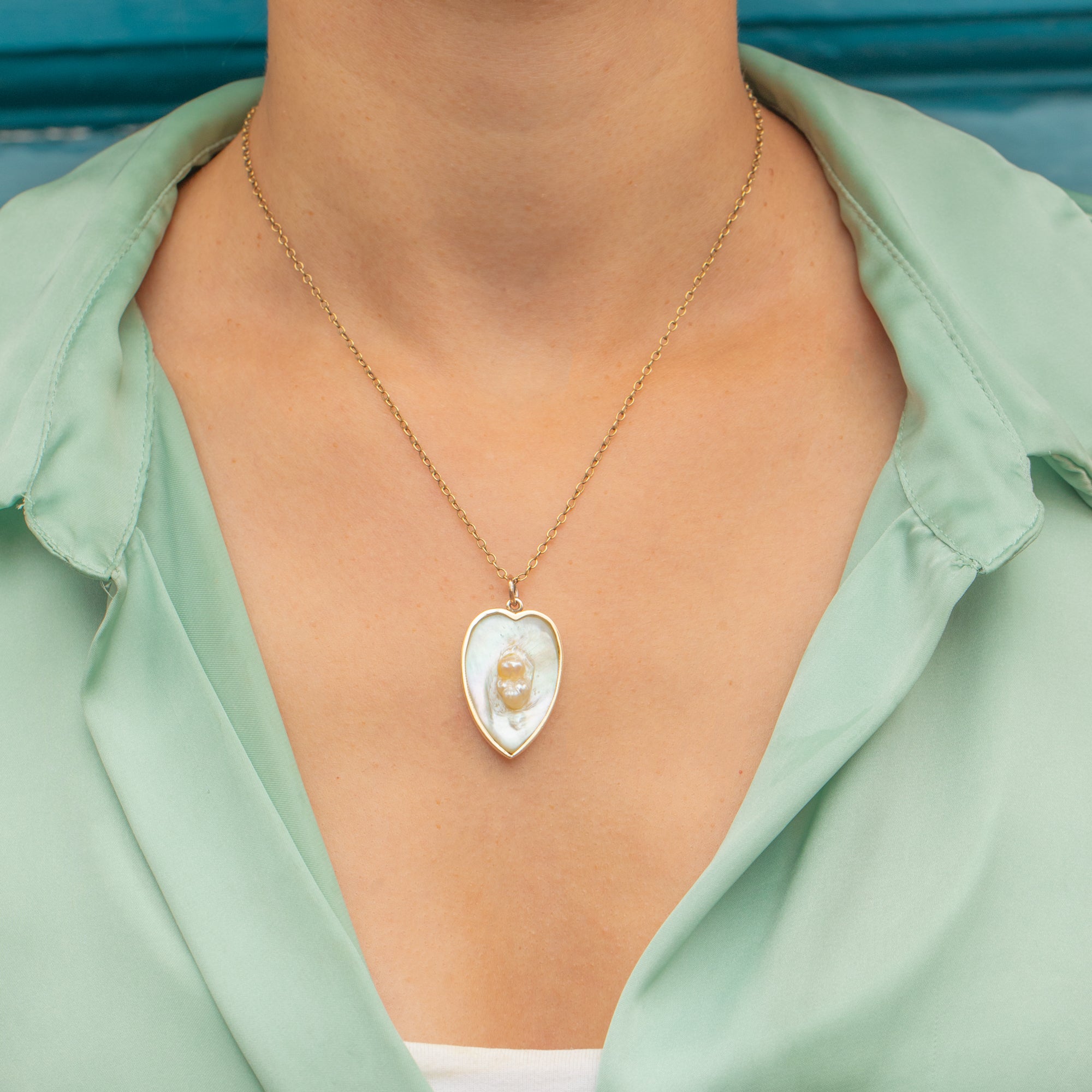 A romantic Victorian pendant, this piece is crafted in 15ct Gold and set with a heart-shaped panel of luminous Mother of Pearl.