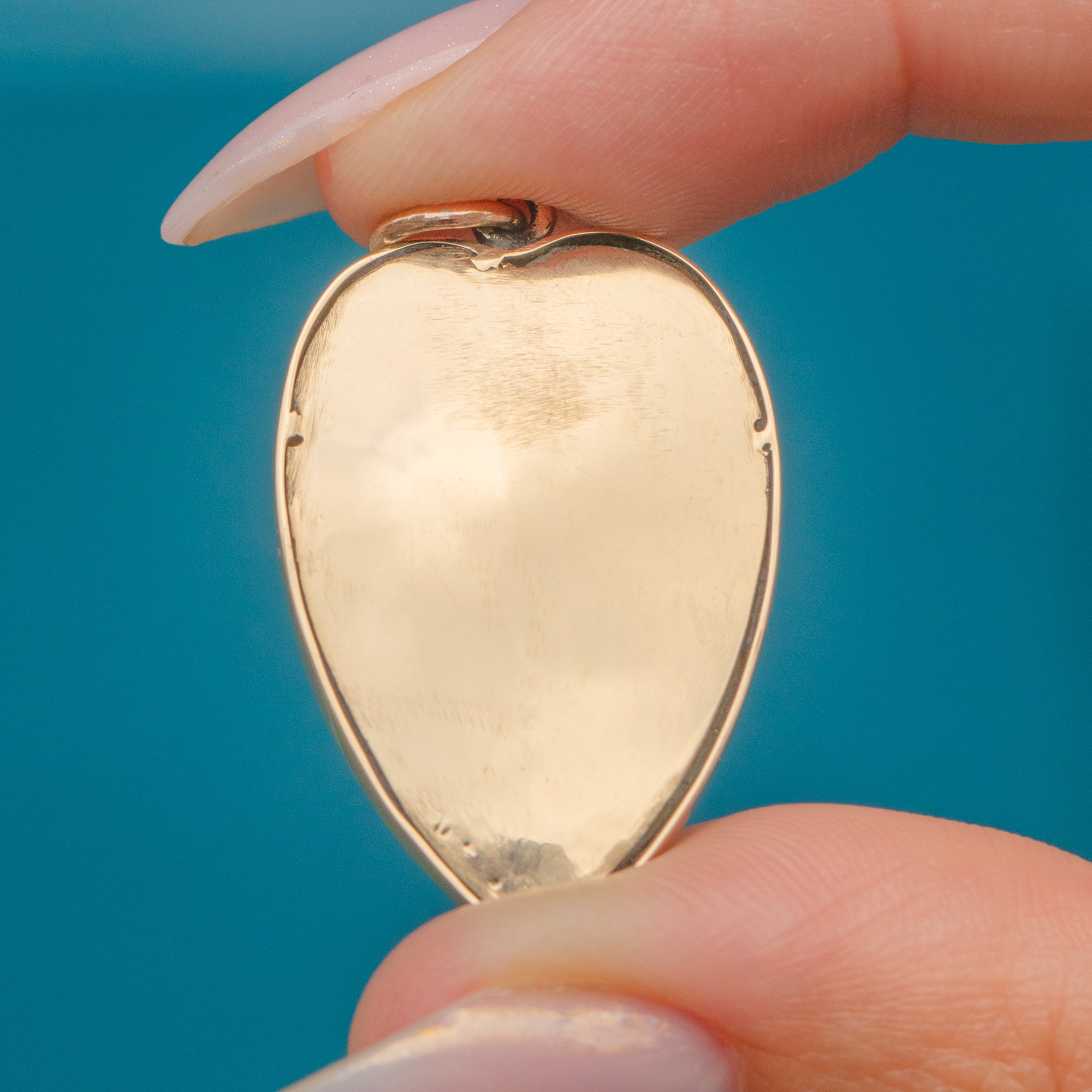 The surface displays a soft iridescence with gentle carved detail, enhanced beautifully by the warm Gold frame. A delicate and timeless jewel, perfect for wearing close to the heart.