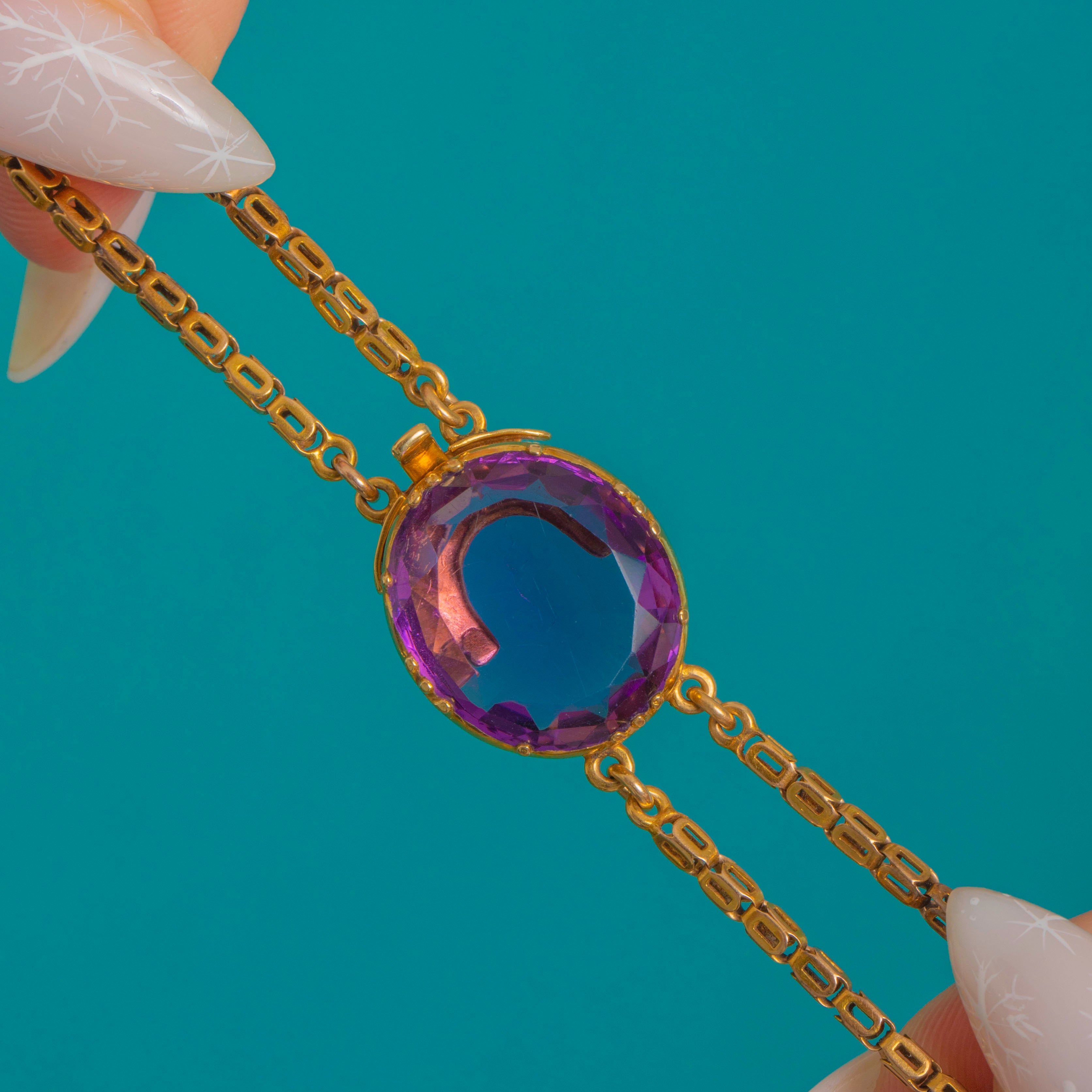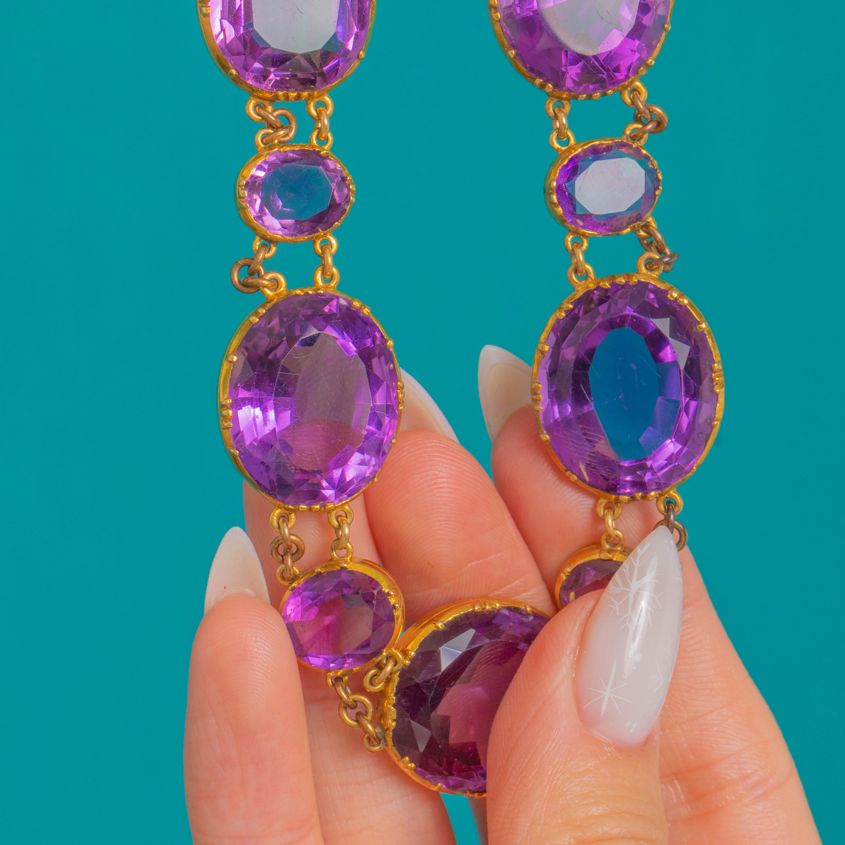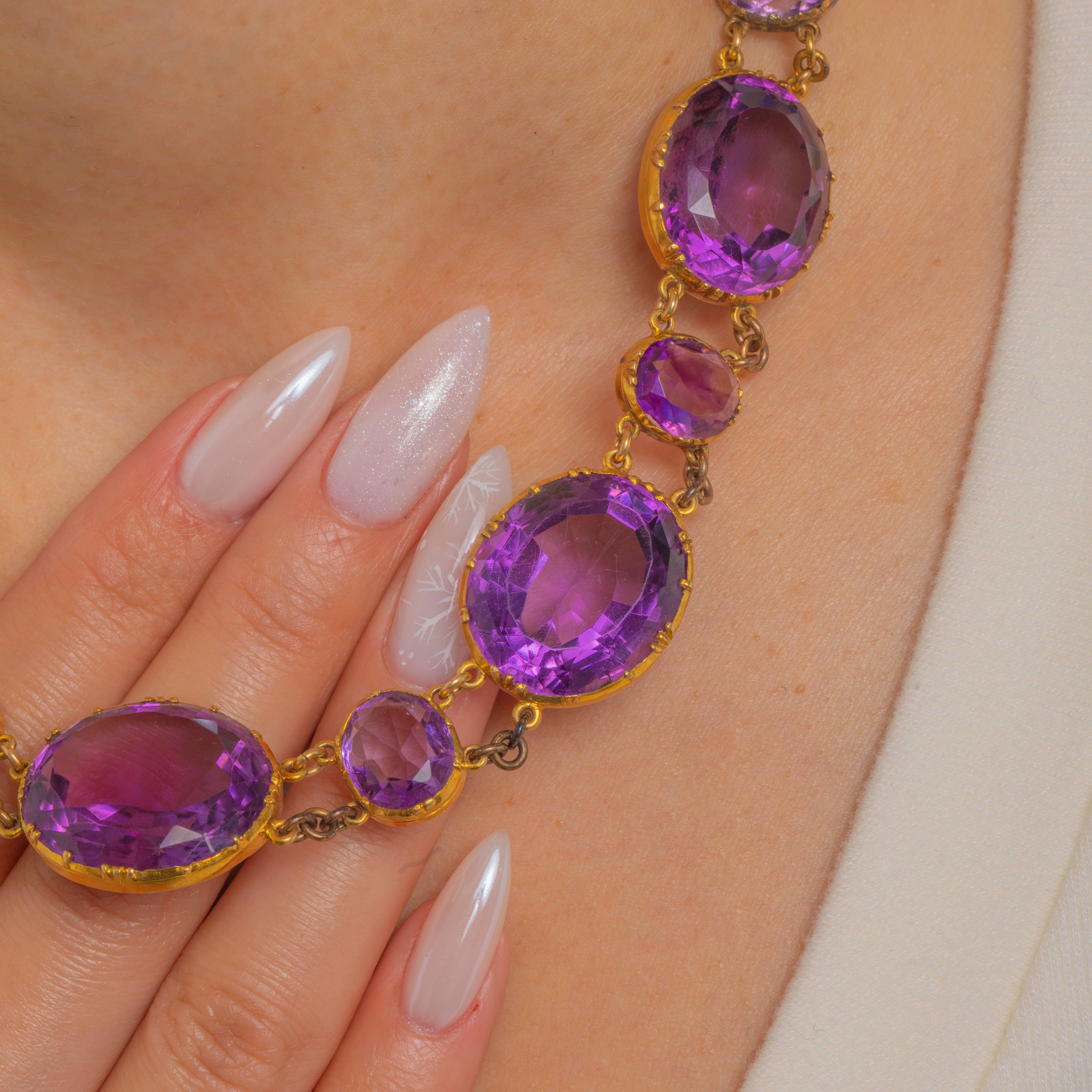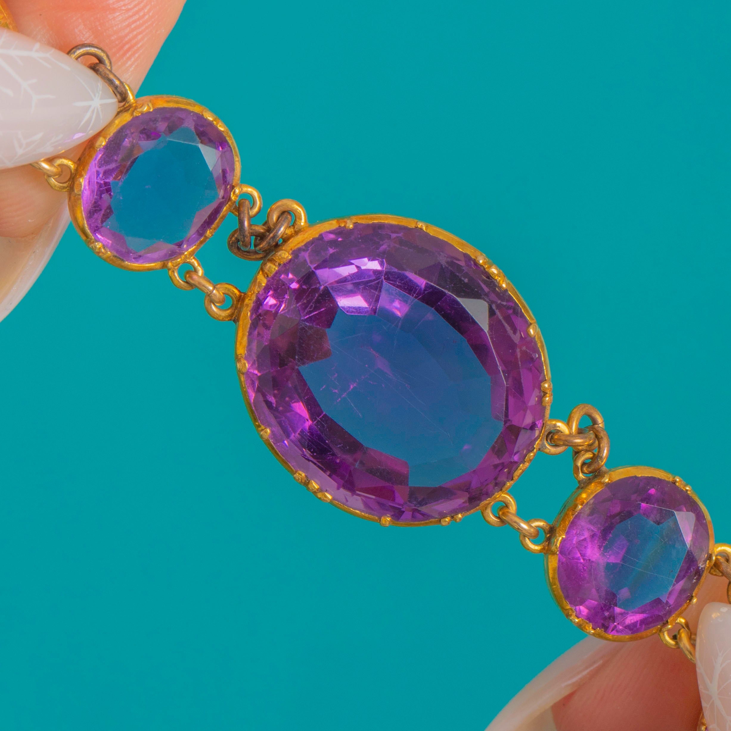 EXCELLENT: Amethysts are bright and well-matched with natural colour zoning and minor age-related facet/rim wear. Gold shows a pleasing warm patina; the cut-down collet settings and articulated links appear secure with no missing stones observed. Overall beautifully preserved with crisp, antique character.