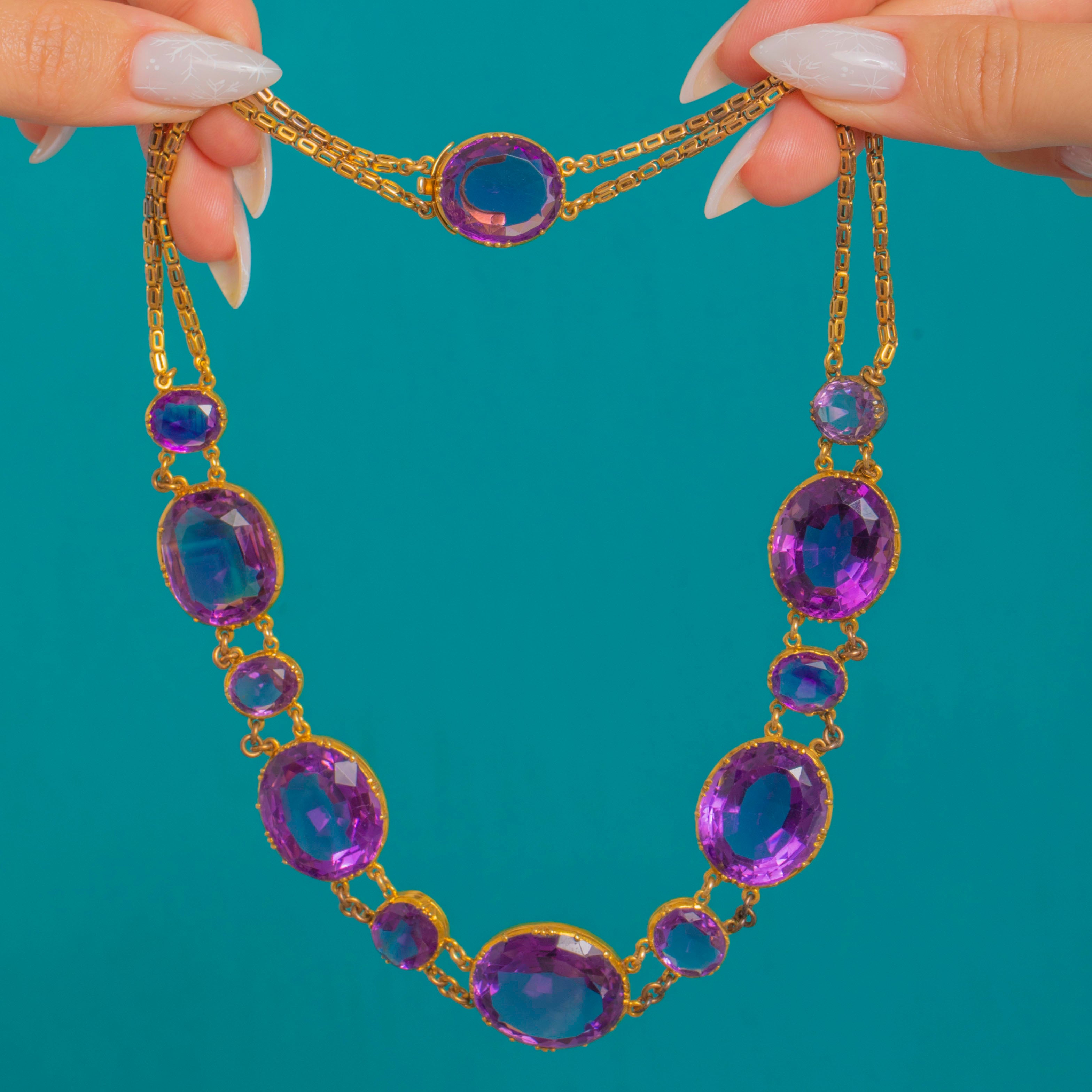 Set with Georgian Amethysts in gorgeous typical triple cut-down claws, circa 1820. It appears to have been re-imagined in the Victorian era, with a neat 15ct Gold pierced Gold chain at the shoulders, and the necklace is articulated for fluid movement.