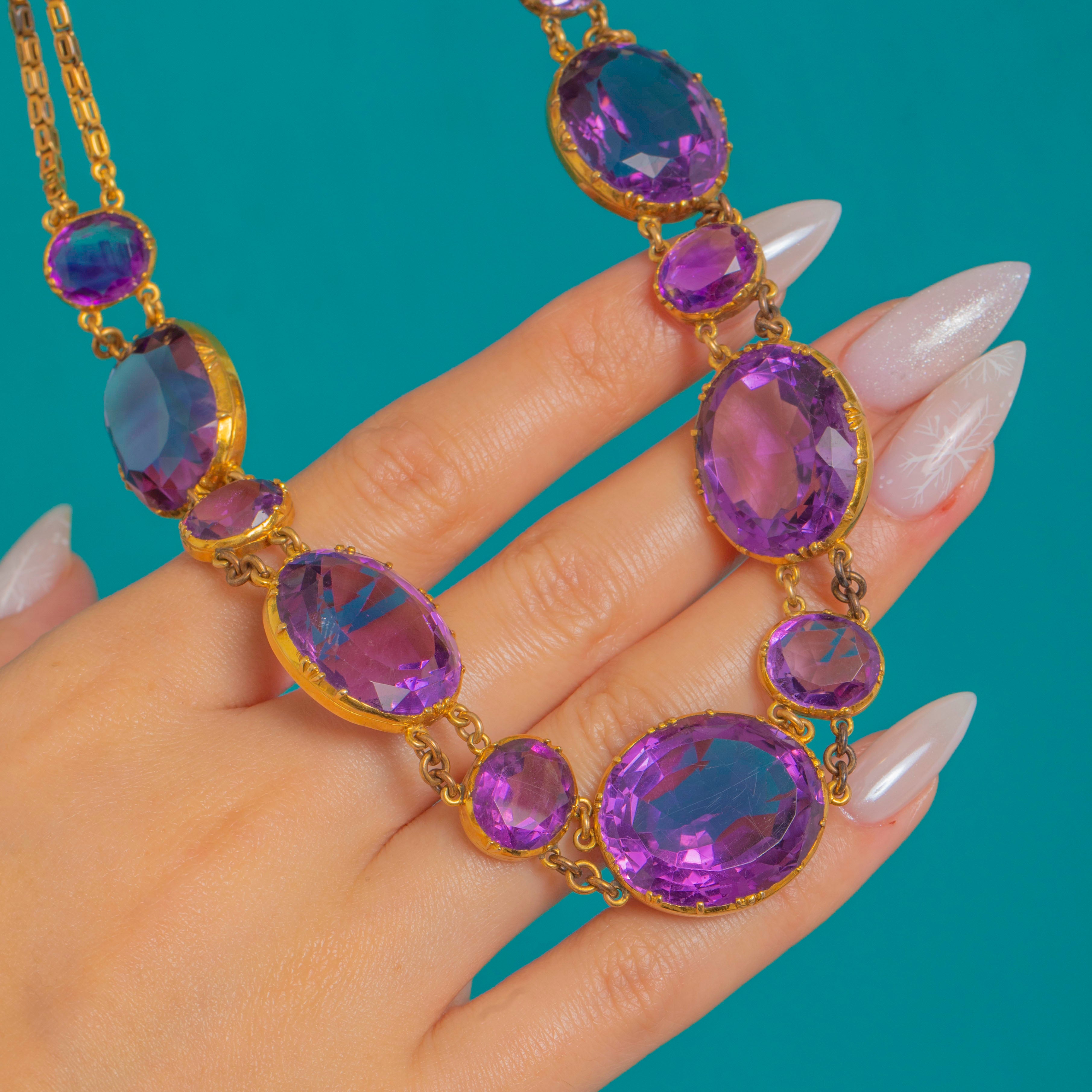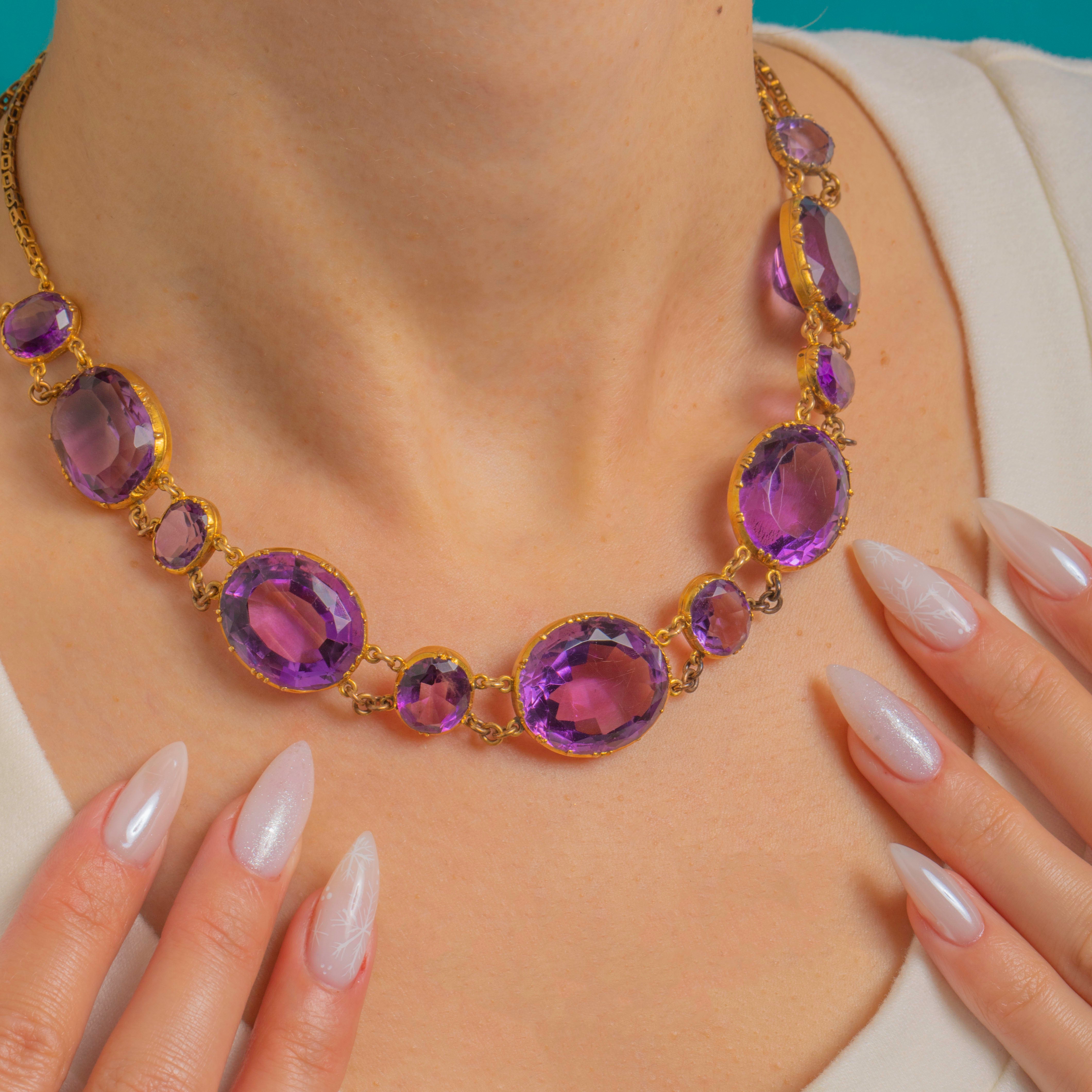 Regal and radiant, this antique rivière necklace showcases a sumptuous ribbon of Natural Amethysts set in glowing 15ct Gold. The gemstones graduate beautifully from smaller rounds to bold ovals, each cradled in hand-cut, serrated collet settings that lend an unmistakably antique allure. The rich, vivid purple hue takes centre stage, with the minimal metalwork allowing the colour to sing.