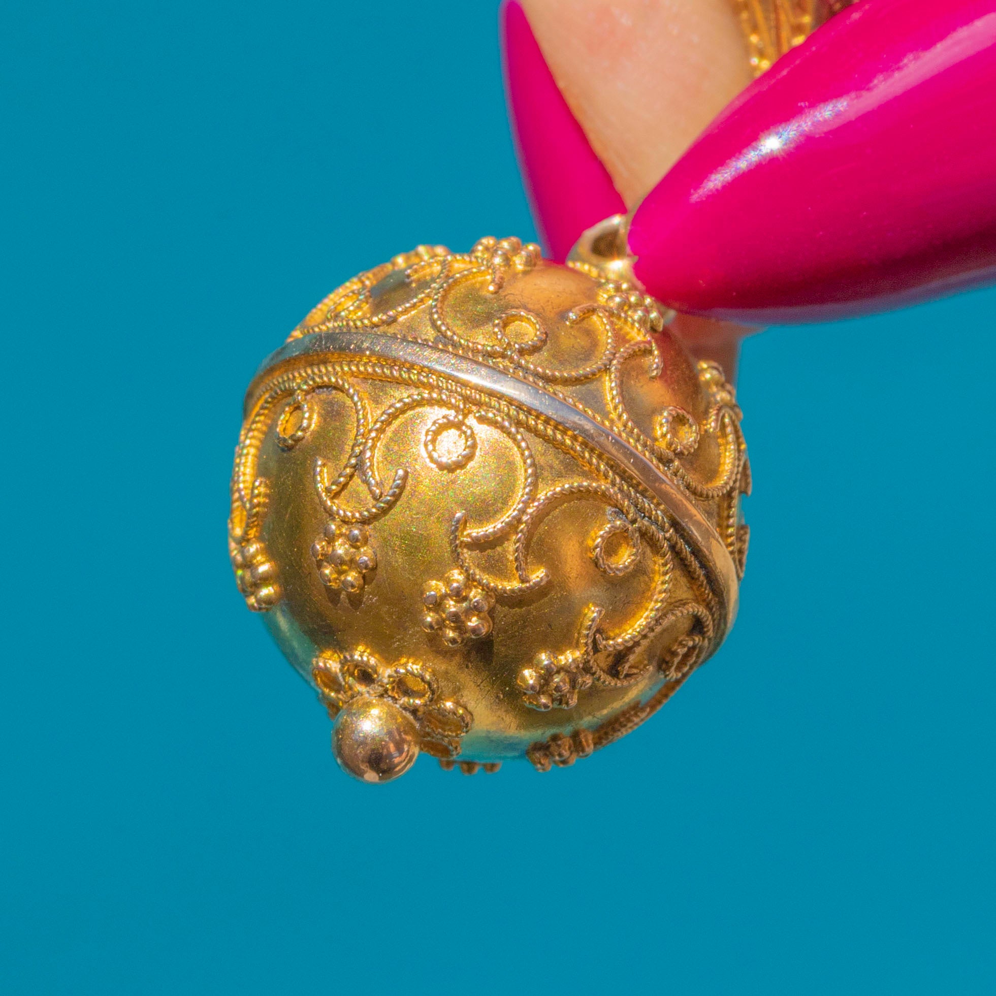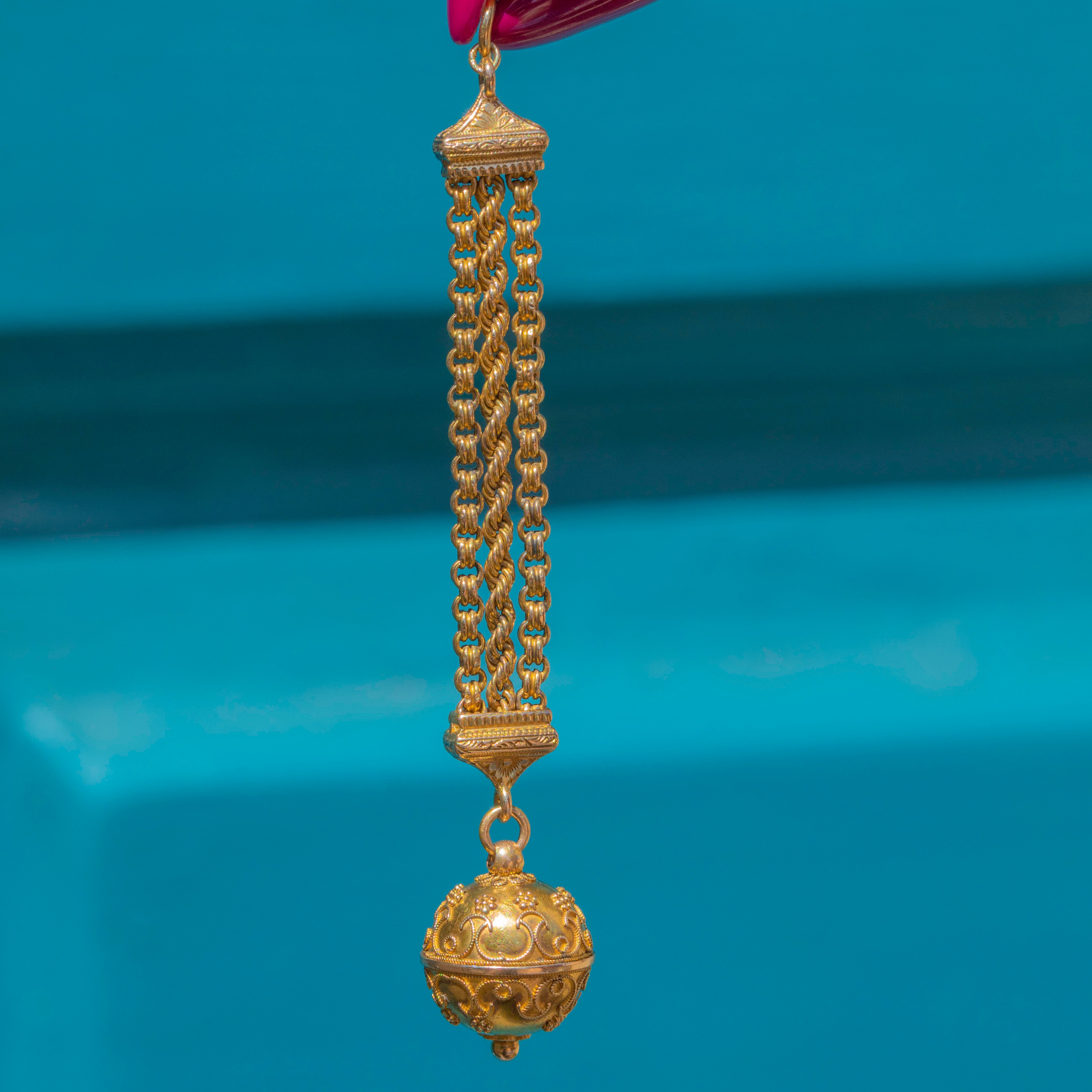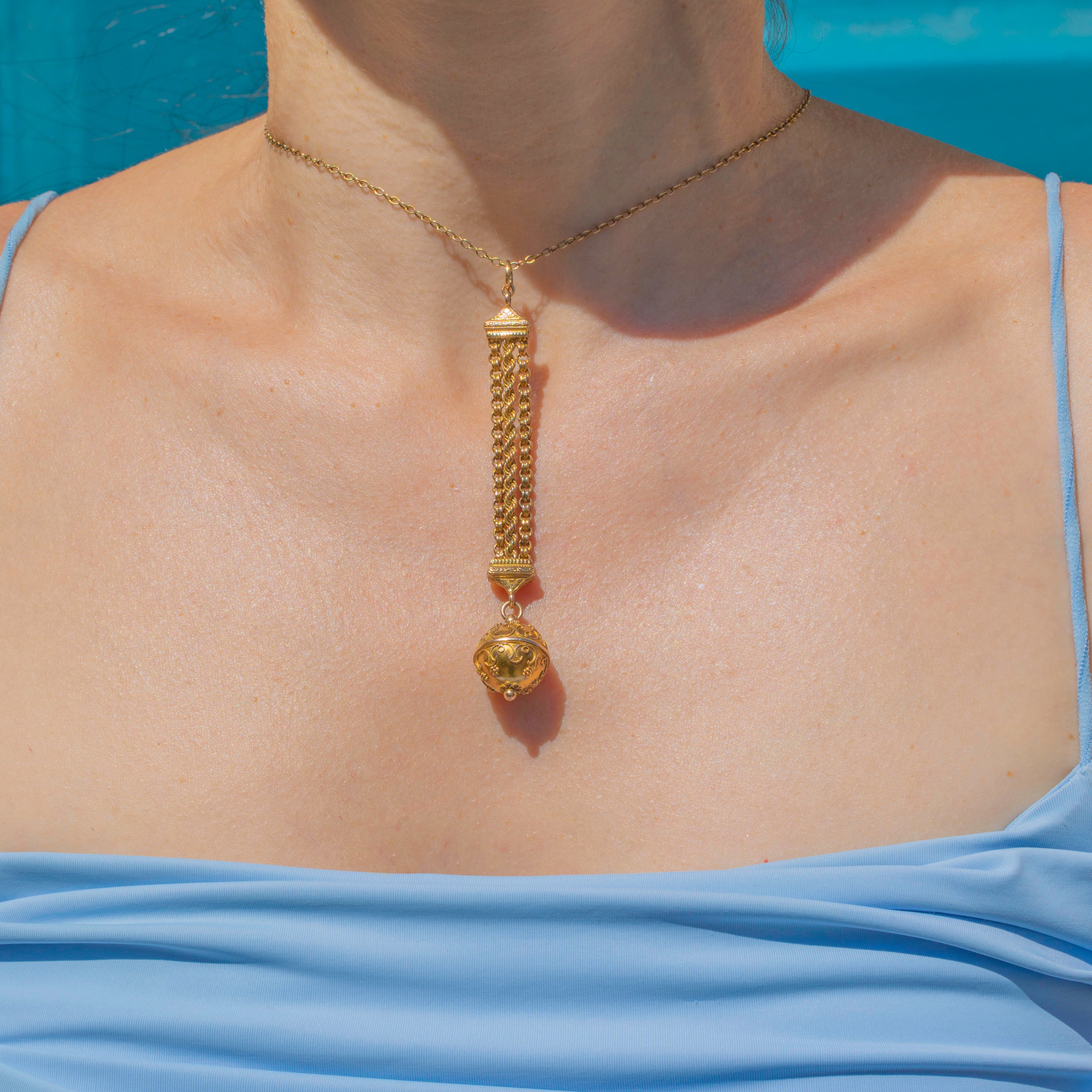 This 15ct Gold drop pendant exudes Victorian allure, featuring a large orb charm with detailed baroque-style engravings. It's a true celebration of Victorian craftsmanship!