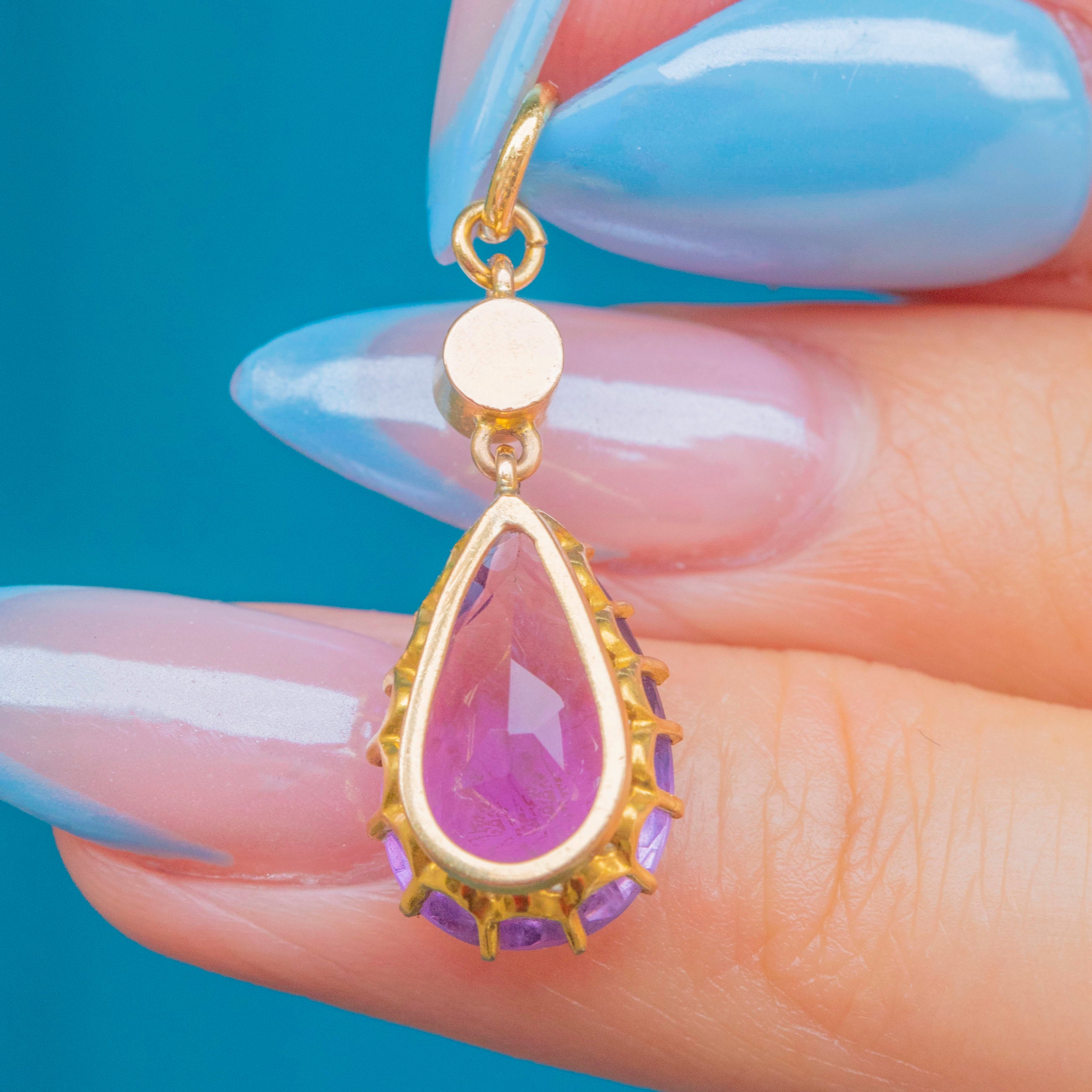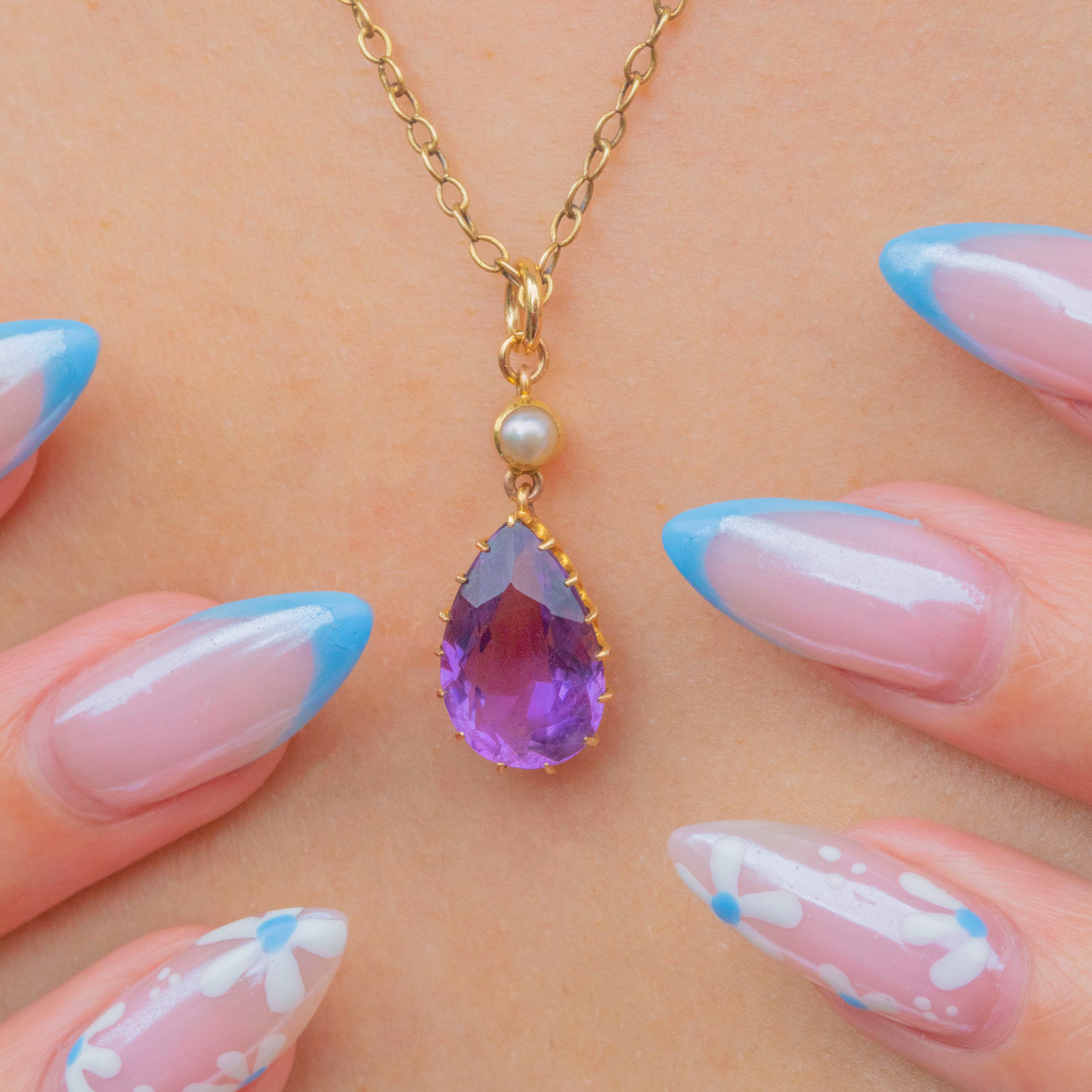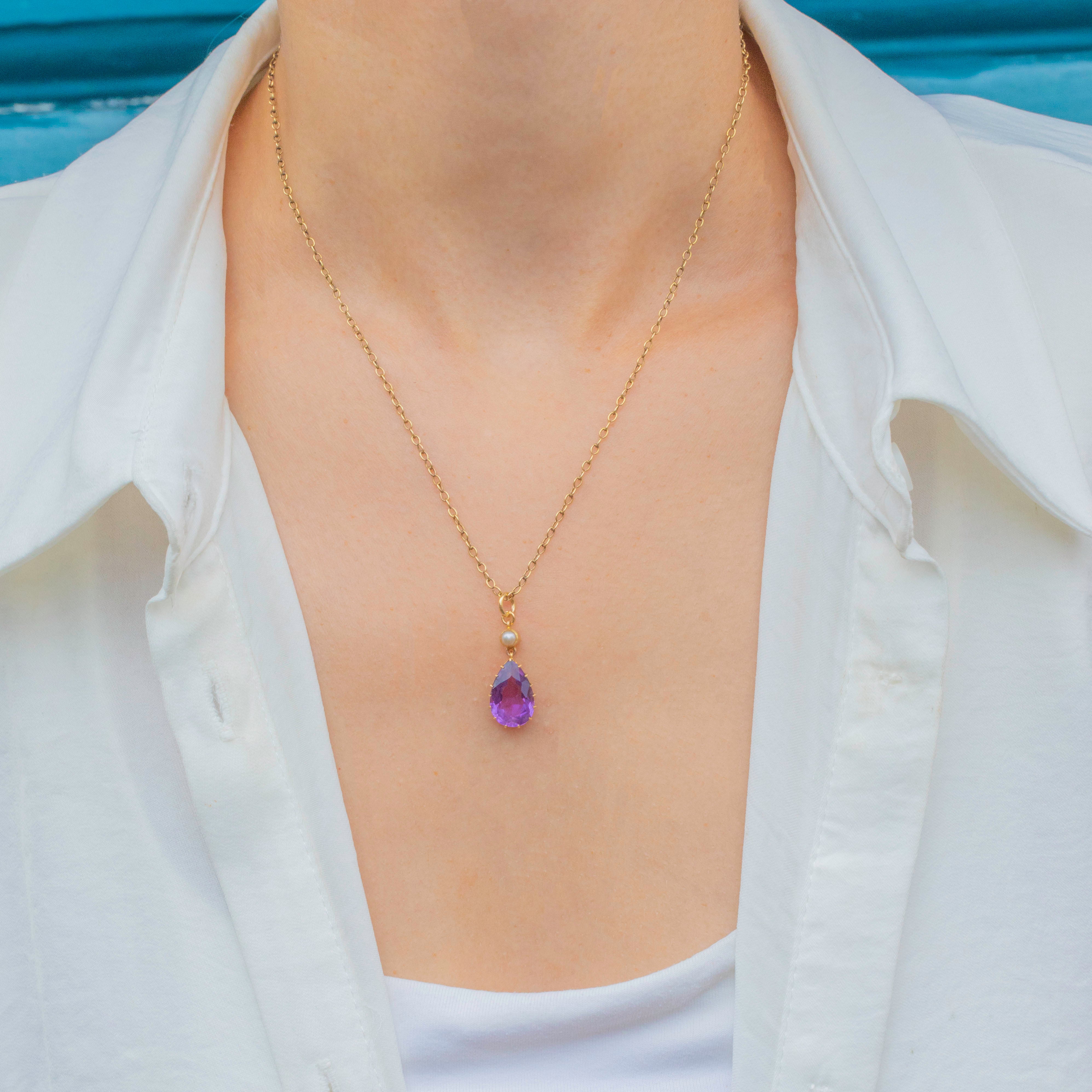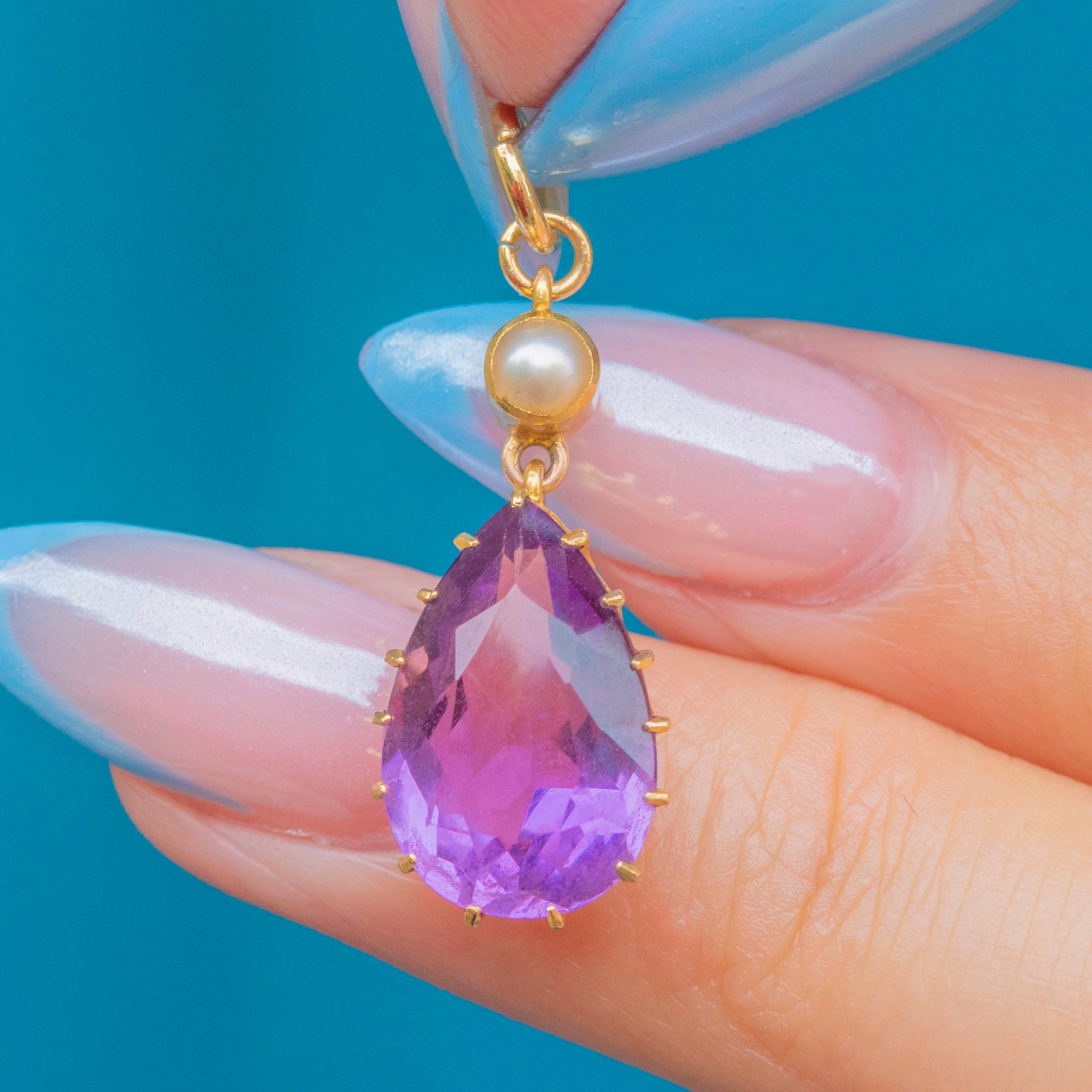 15ct ゴールド ペアドロップ アメジスト ペンダント パール付き