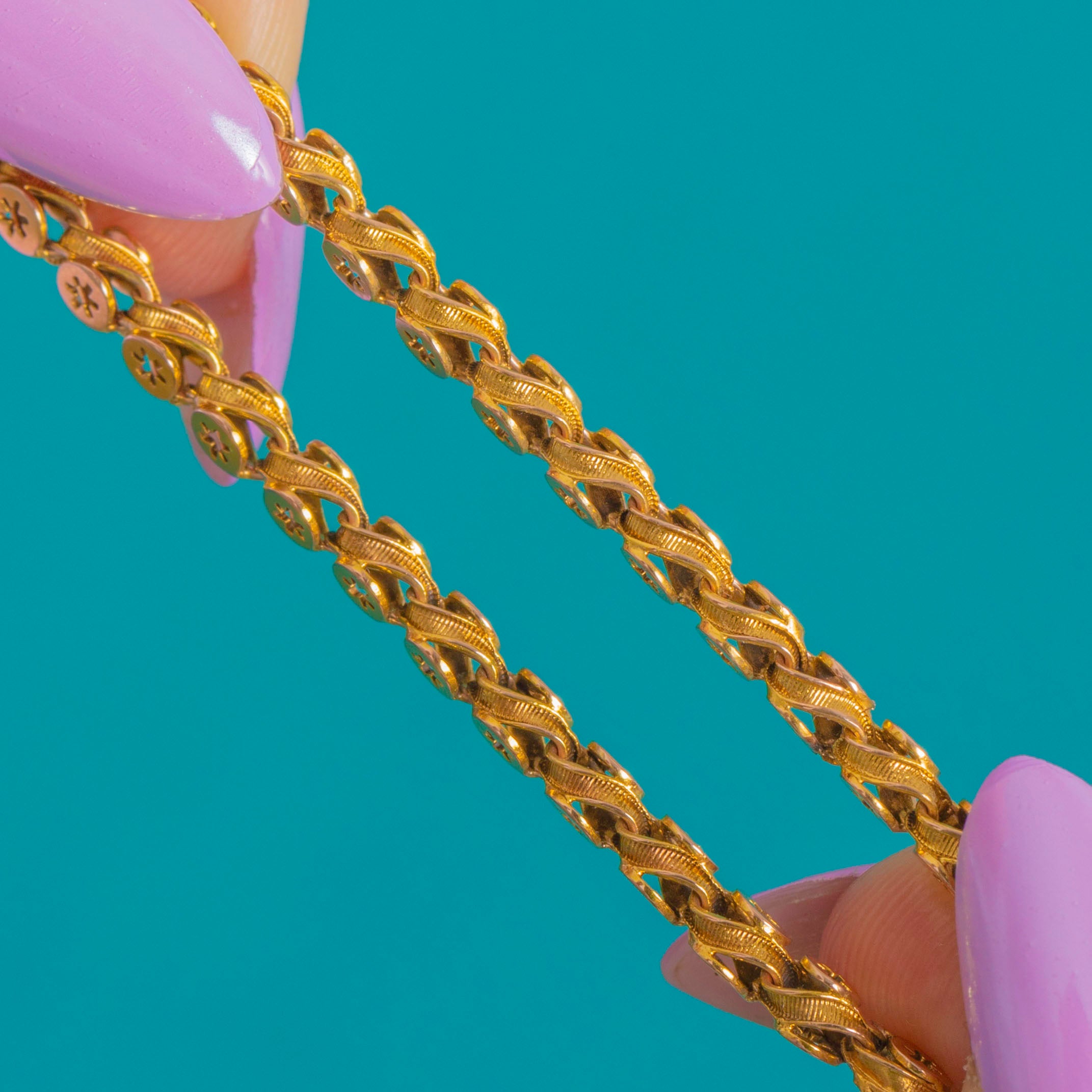 エクセレント:ゴールドリンクは、透かし星モチーフのディテールが鮮明に残り、経年にふさわしいごく僅かな表面の摩耗のみで、非常に良好な状態です。ブレスレットはしなやかで可動性も保たれており、後年に追加されたボルトリングクラスプも確実に留まります。
