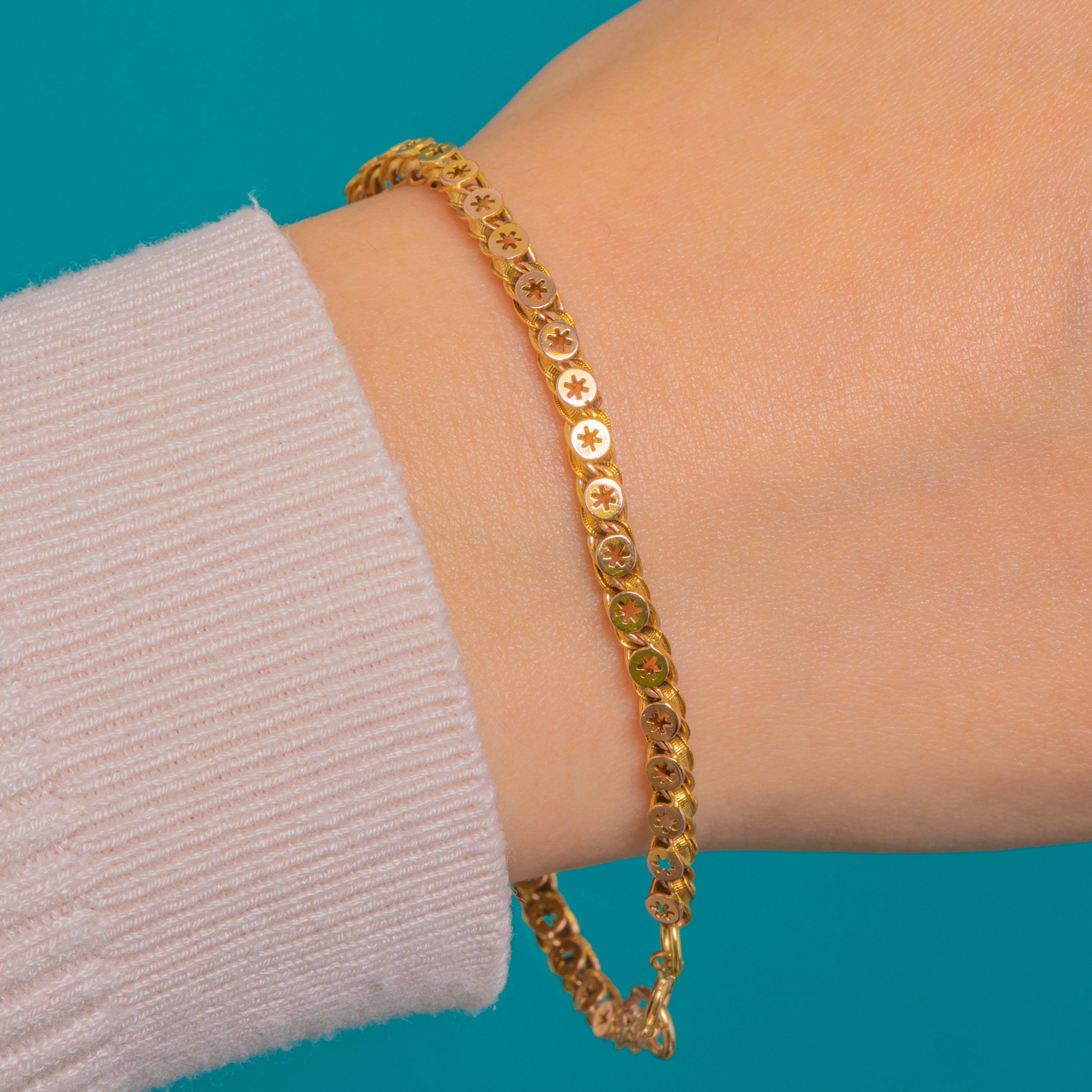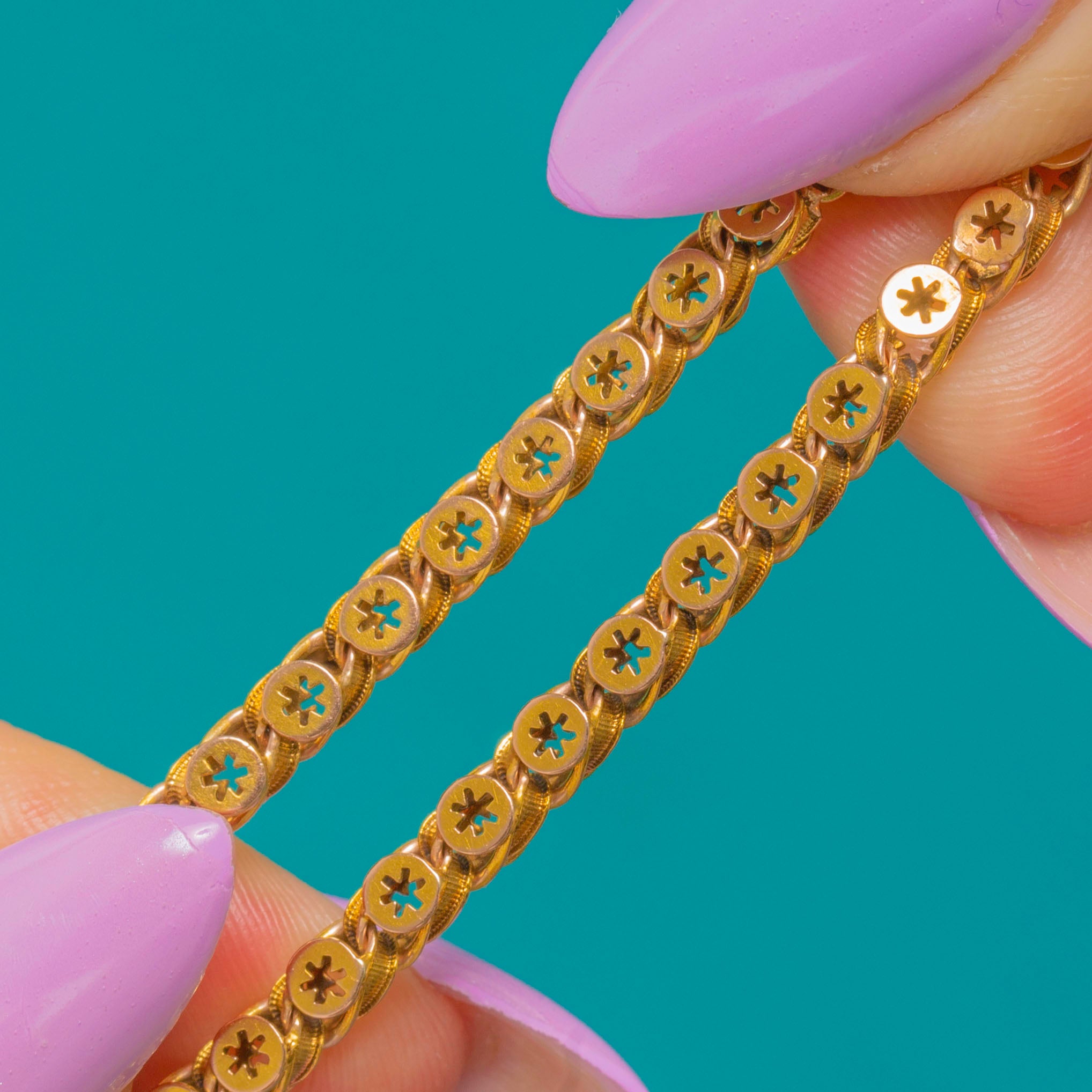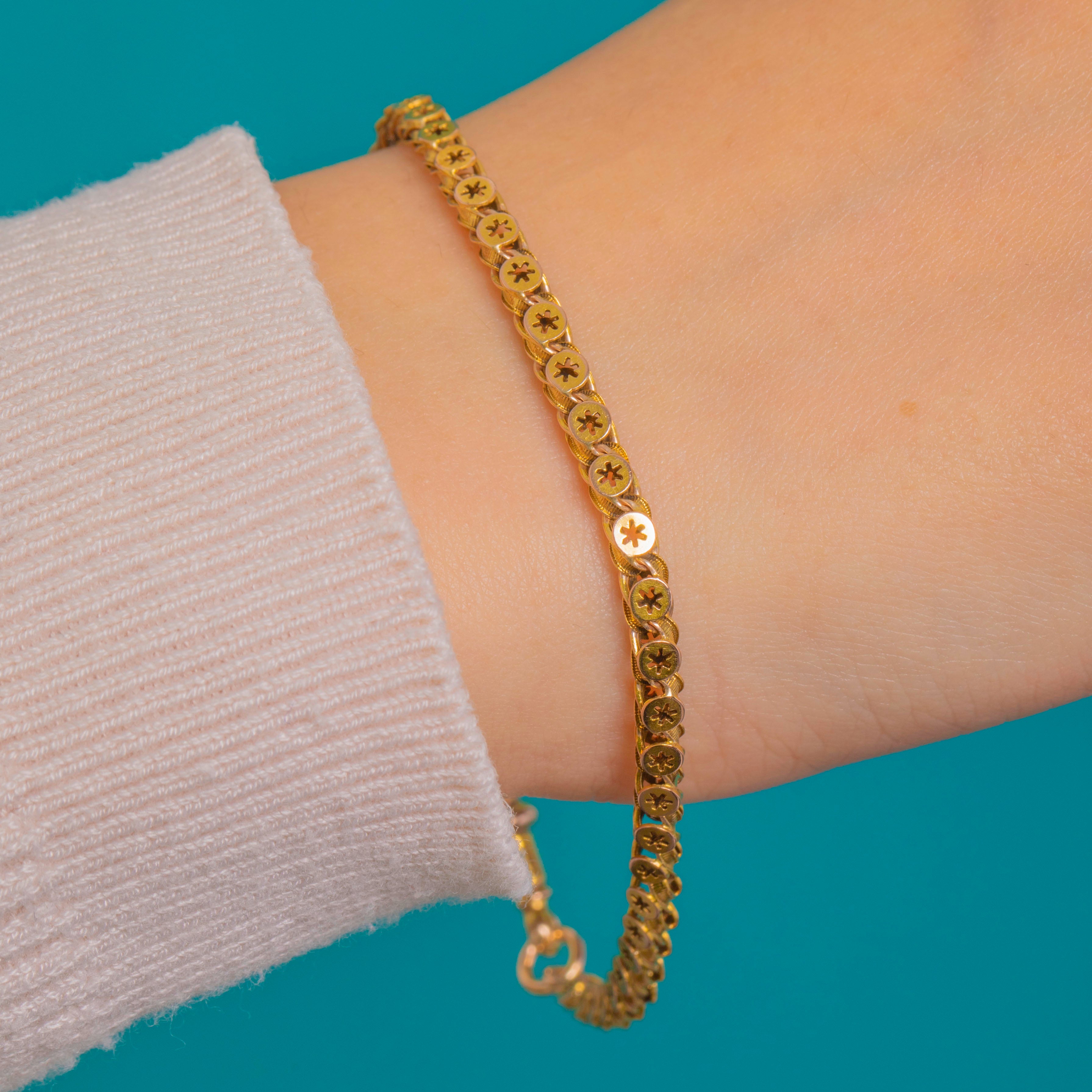 このアンティークVictorianブレスレットは、豊かな15ctゴールドで精巧に作られた美しい逸品です。各リンクに施された特徴的なピアスドスター(透かし星)デザインが全体を彩り、繰り返されるパターンがリズムと繊細さをもたらします。温かみのあるゴールドの色調が、アンティークならではの輝きを添えています。