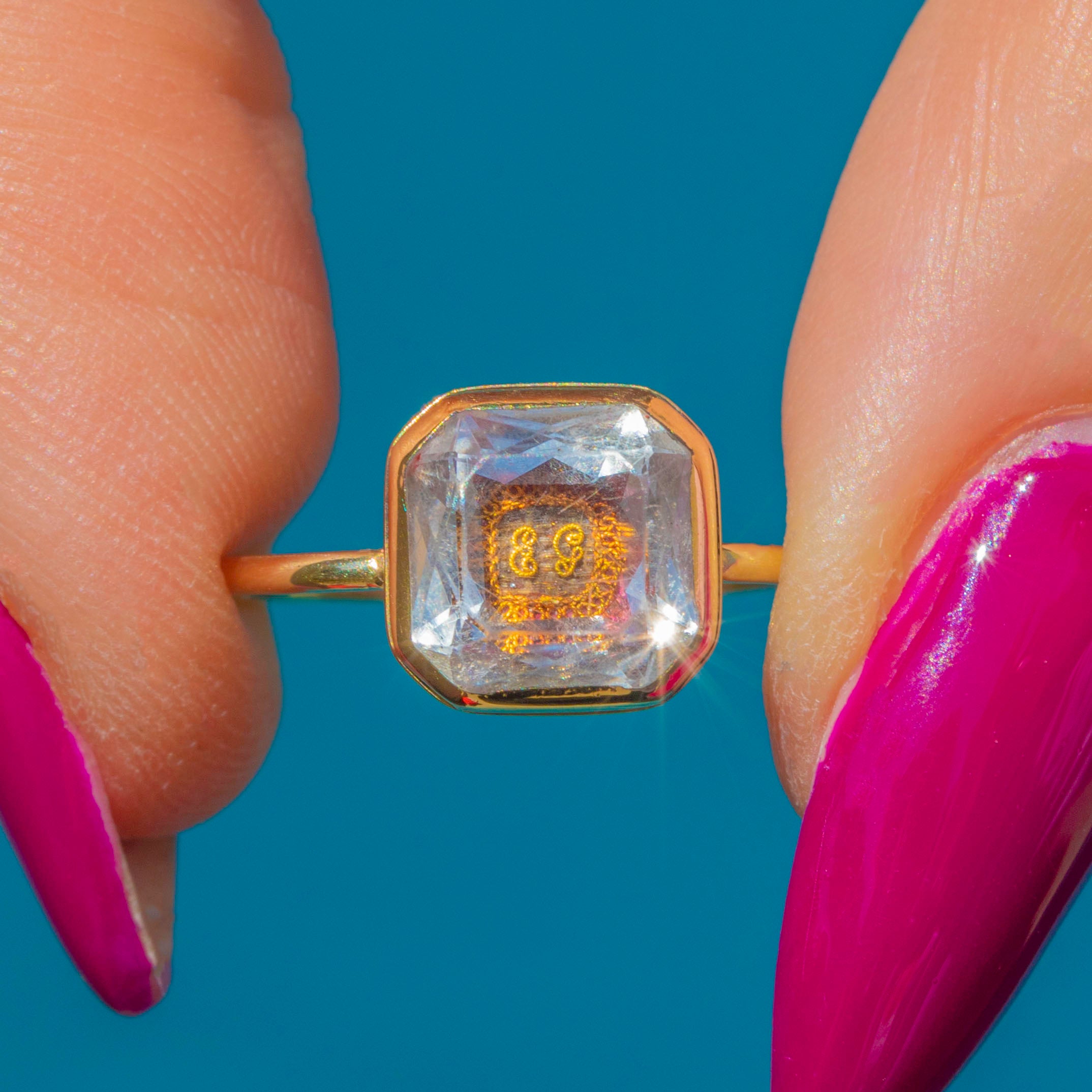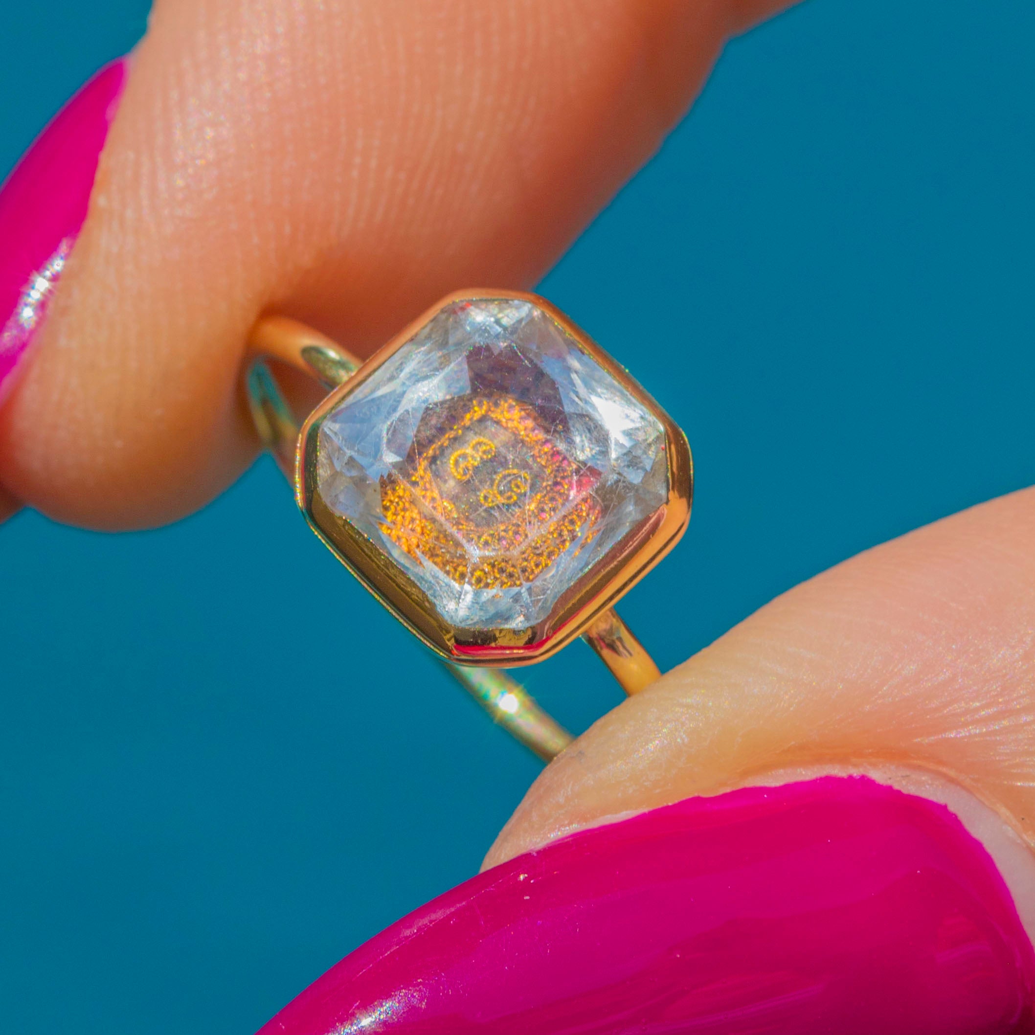 VERY GOOD: We think this piece was once a stick pin, and has been given a new lease of life as a much more wearable ring! The Rock Crystal is crisp and has only a few little scuffs on its edges. The Gold wire cypher has remained in good shape, and the pink foil still pops, although it has become slightly less vibrant over the years. The ring band is smooth, circular and glides onto the finger with ease, with the domed back setting of the Rock Crystal making her comfortable to wear.
