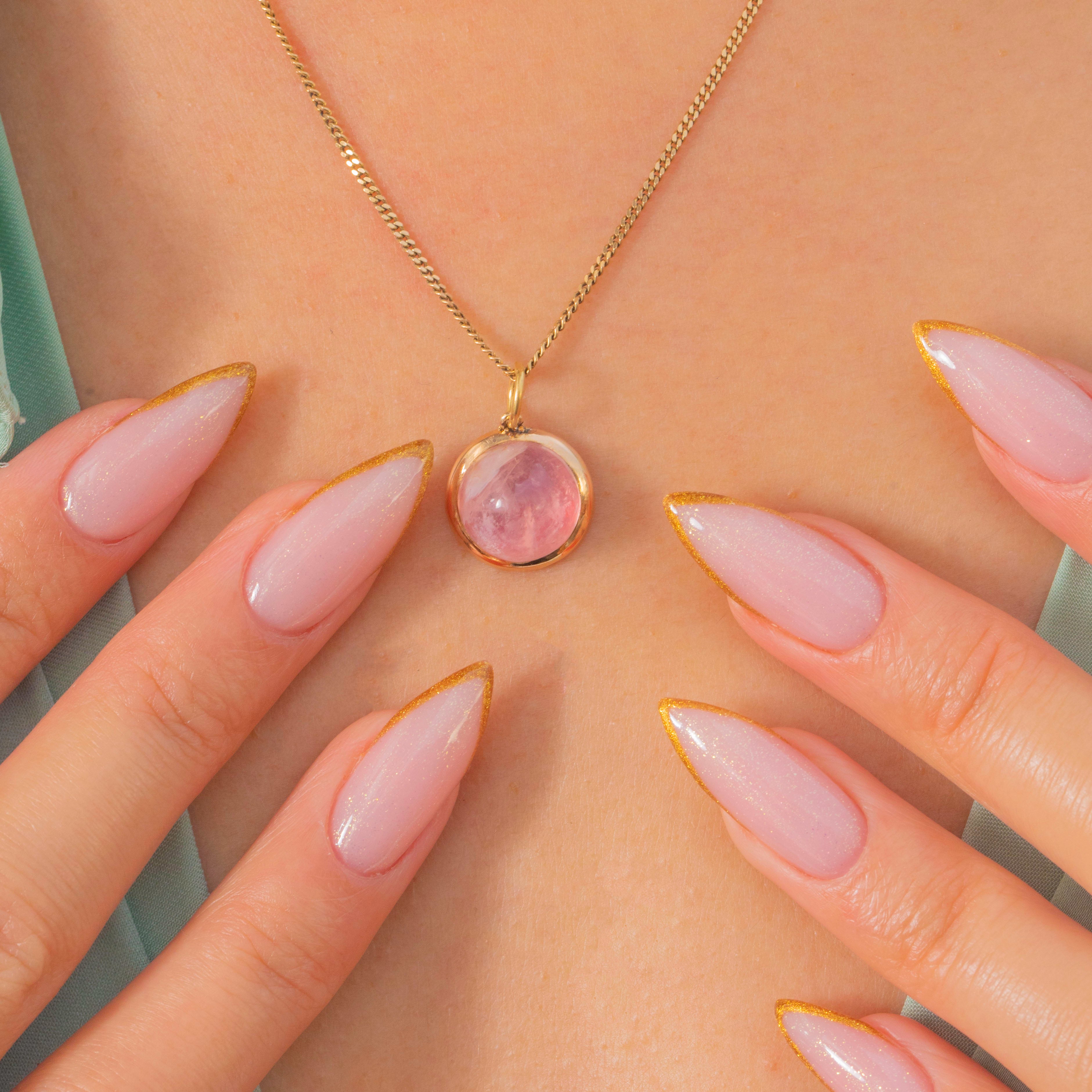 EXCELLENT: The Rose Quartz is glossy and smooth with no chips or cracks; natural internal inclusions are visible and attractive. The 15ct Gold bezel is clean and well-finished, and the jump-ring bale is soldered securely with minimal surface wear.