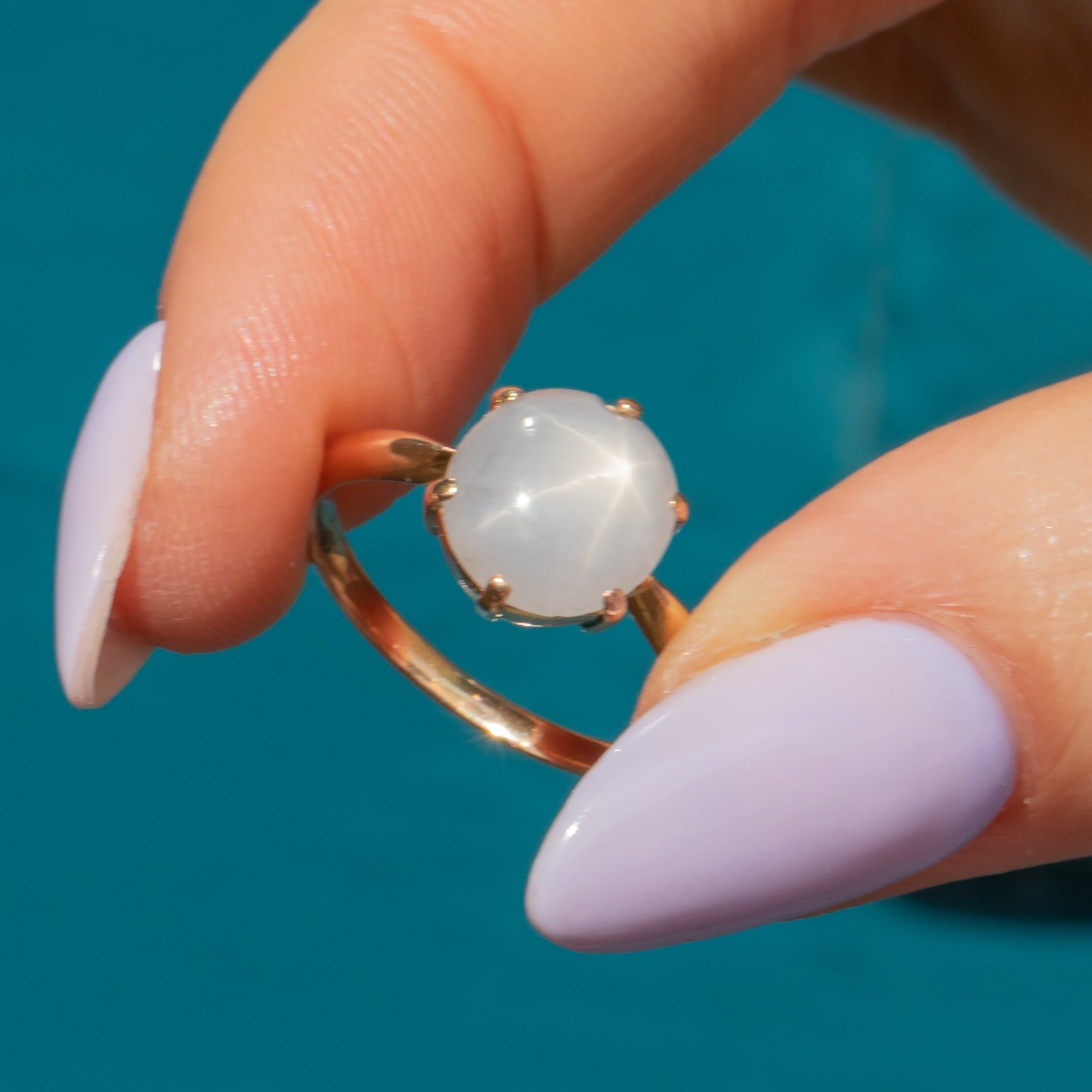 This 15ct Gold star Sapphire solitaire ring is super plump! With a stunning pastel centre boasting a 3.60ct pretty lilac-hued Sapphire, this Victorian ring exudes elegance.