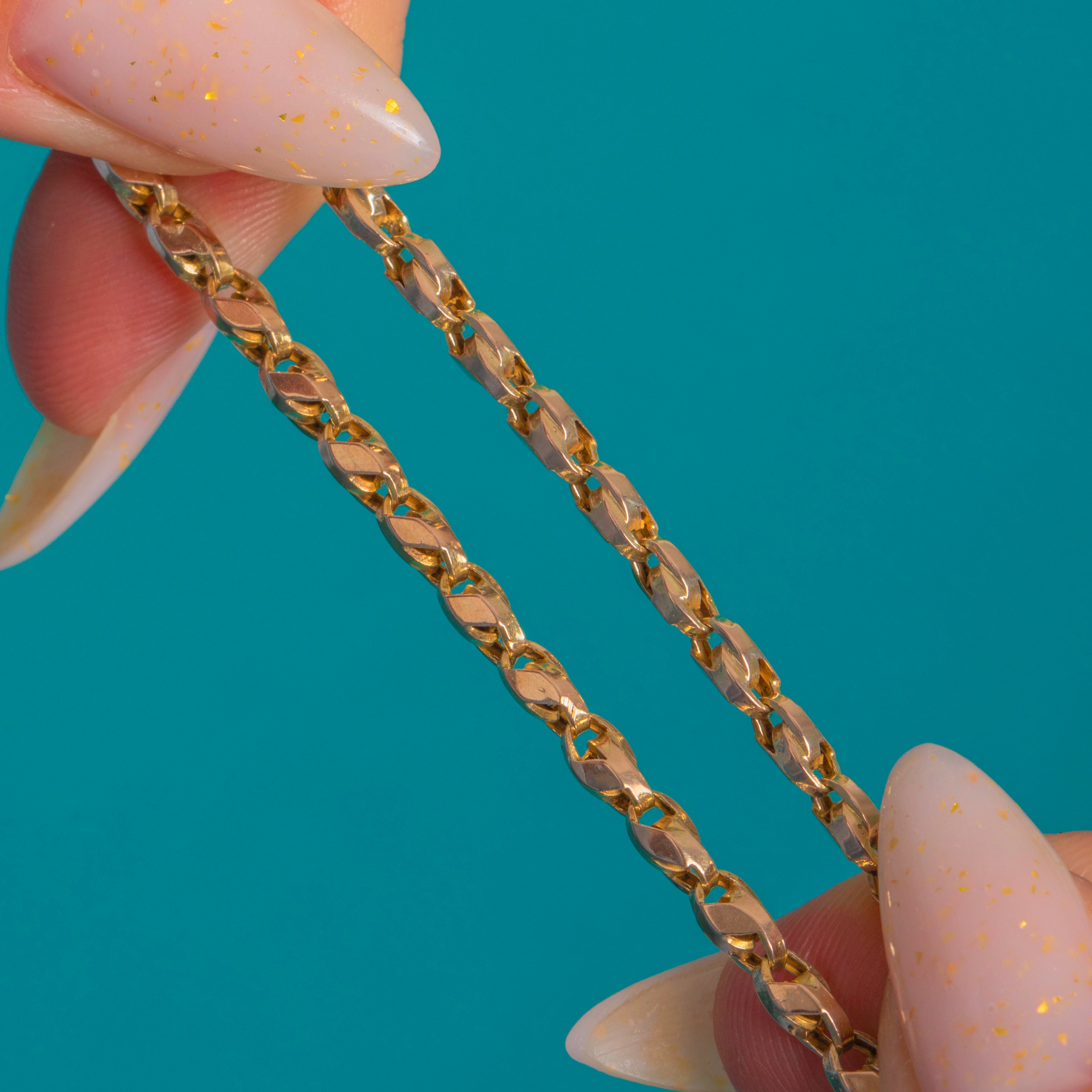 EXCELLENT: Brightly polished with light, even surface wear commensurate with age. The links are well-formed and securely soldered, and the dog clip opens and closes smoothly and securely. No visible repairs or alterations observed.