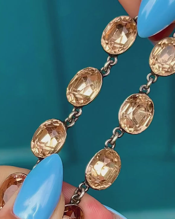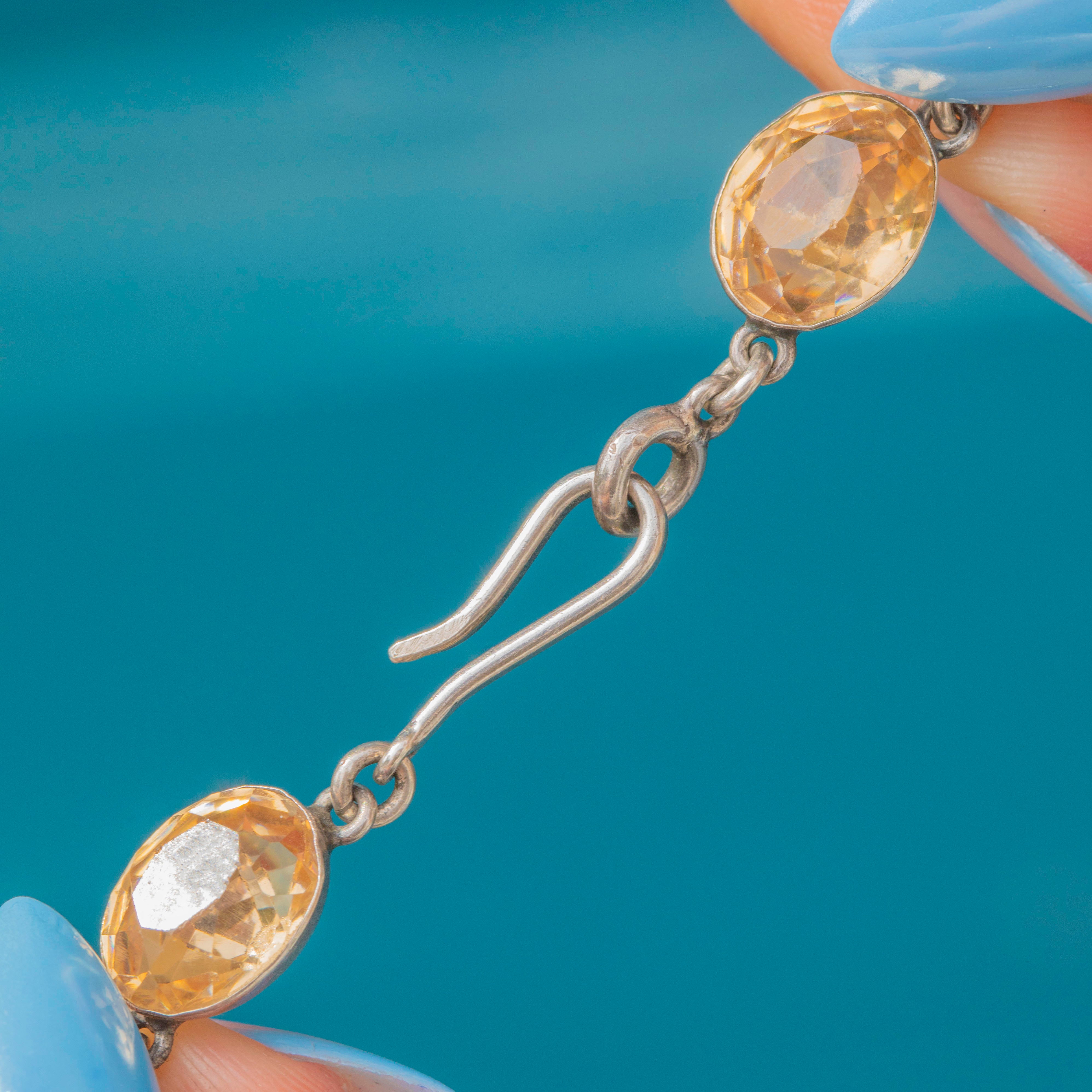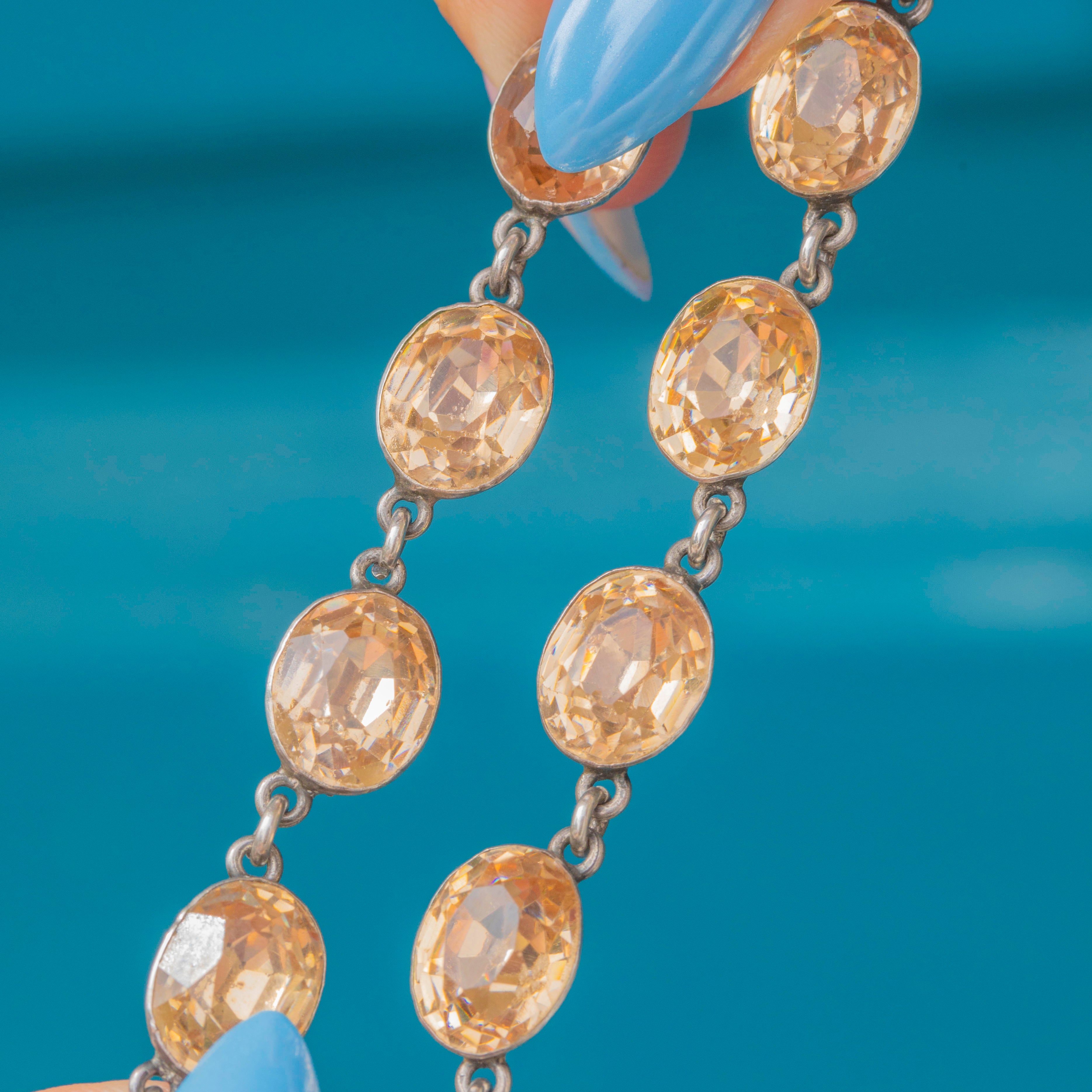 Each Paste gemstone is set in Sterling Silver, with their smooth backs ensuring comfortable wear, and are perfectly foiled to mimic the enigmatic warmth of rare Imperial Topaz. Measuring a desirable 16.5” long and complete with a hook clasp, this Georgian beauty simply radiates antique charm.