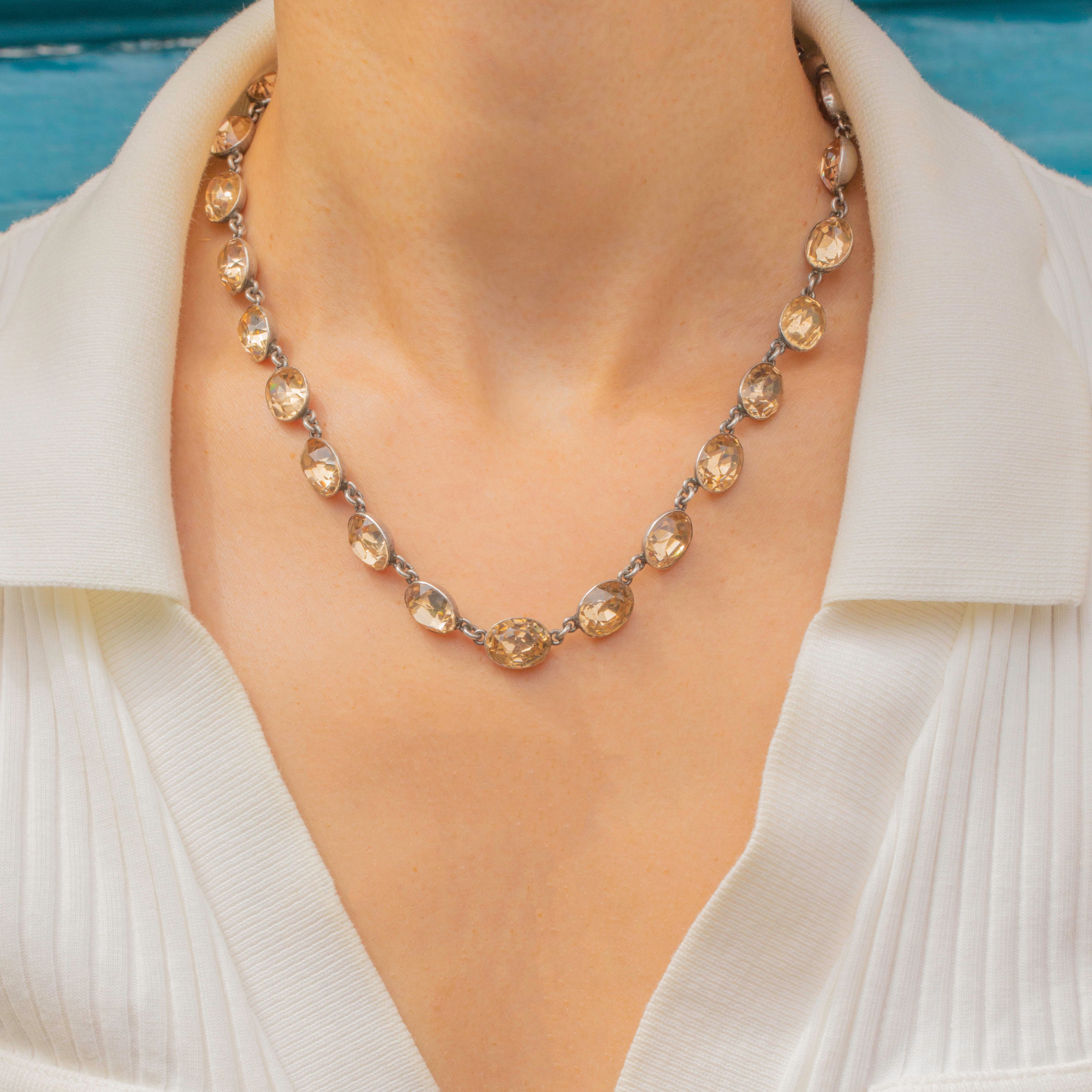 EXCELLENT: Each Paste stone is radiant, displaying a gorgeous pastel yellow tone and faceted wonderfully for added sparkle. The Silver settings are smooth and provide comfortable wear. The clasp is fully functioning and with little else to note, this necklace can be worn with utmost confidence.