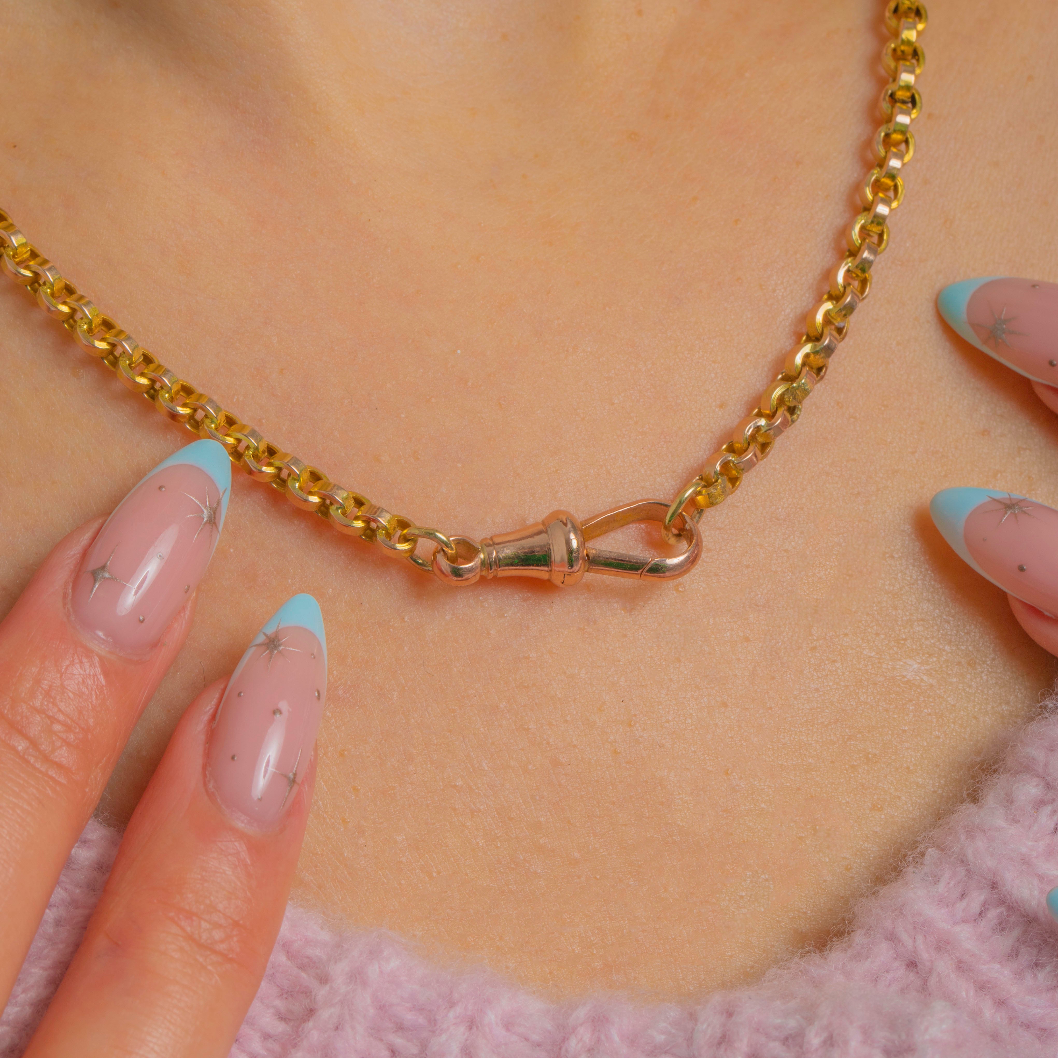 A classic Victorian 9ct Gold belcher chain with uniform rolo-style links, sleek and beautifully articulated. The spring dog-clip clasp gives a refined, watch-chain nod, reading a touch rosier against the yellow Gold for a subtle two-tone effect. At 16", it sits neatly at the base of the neck for a clean, minimalist look.