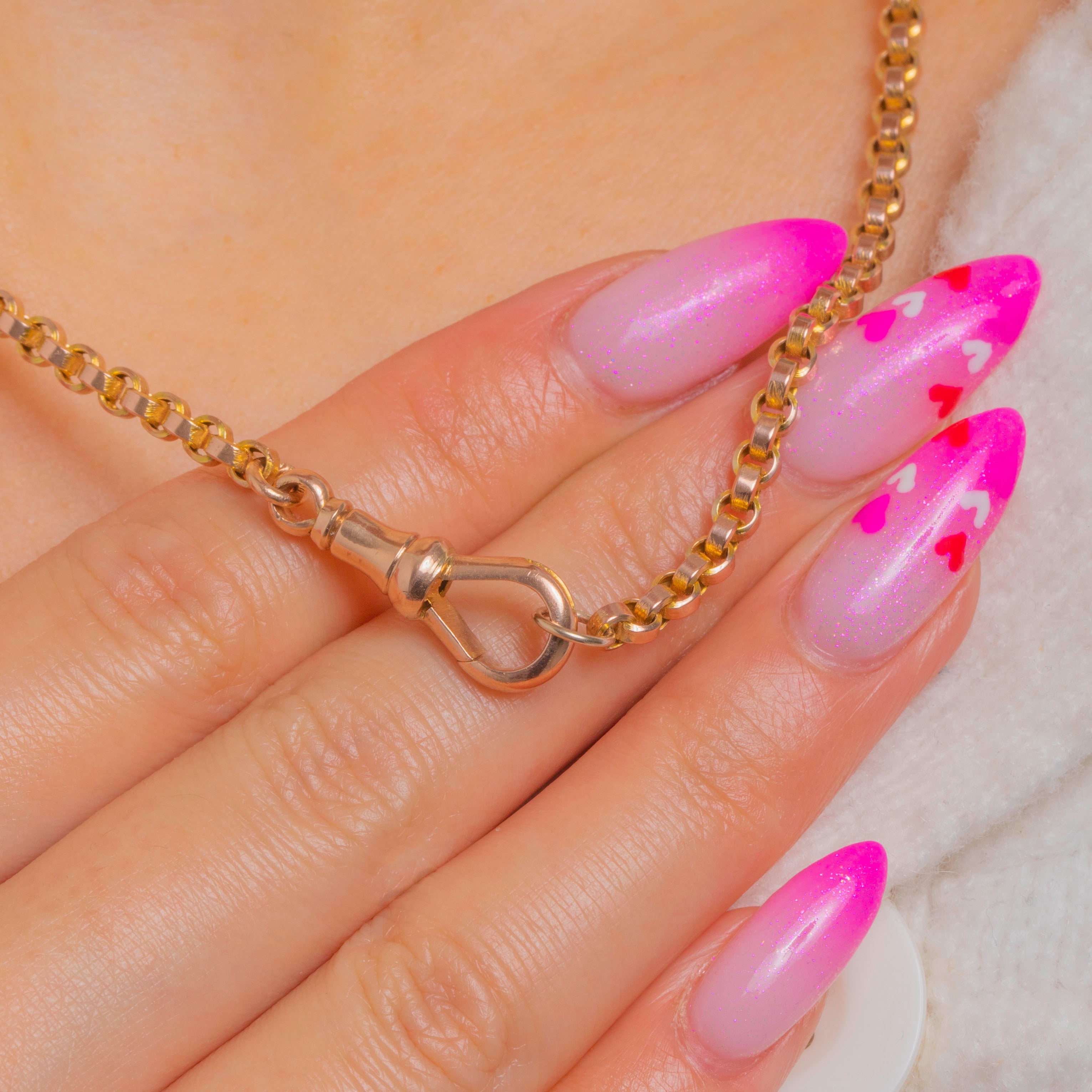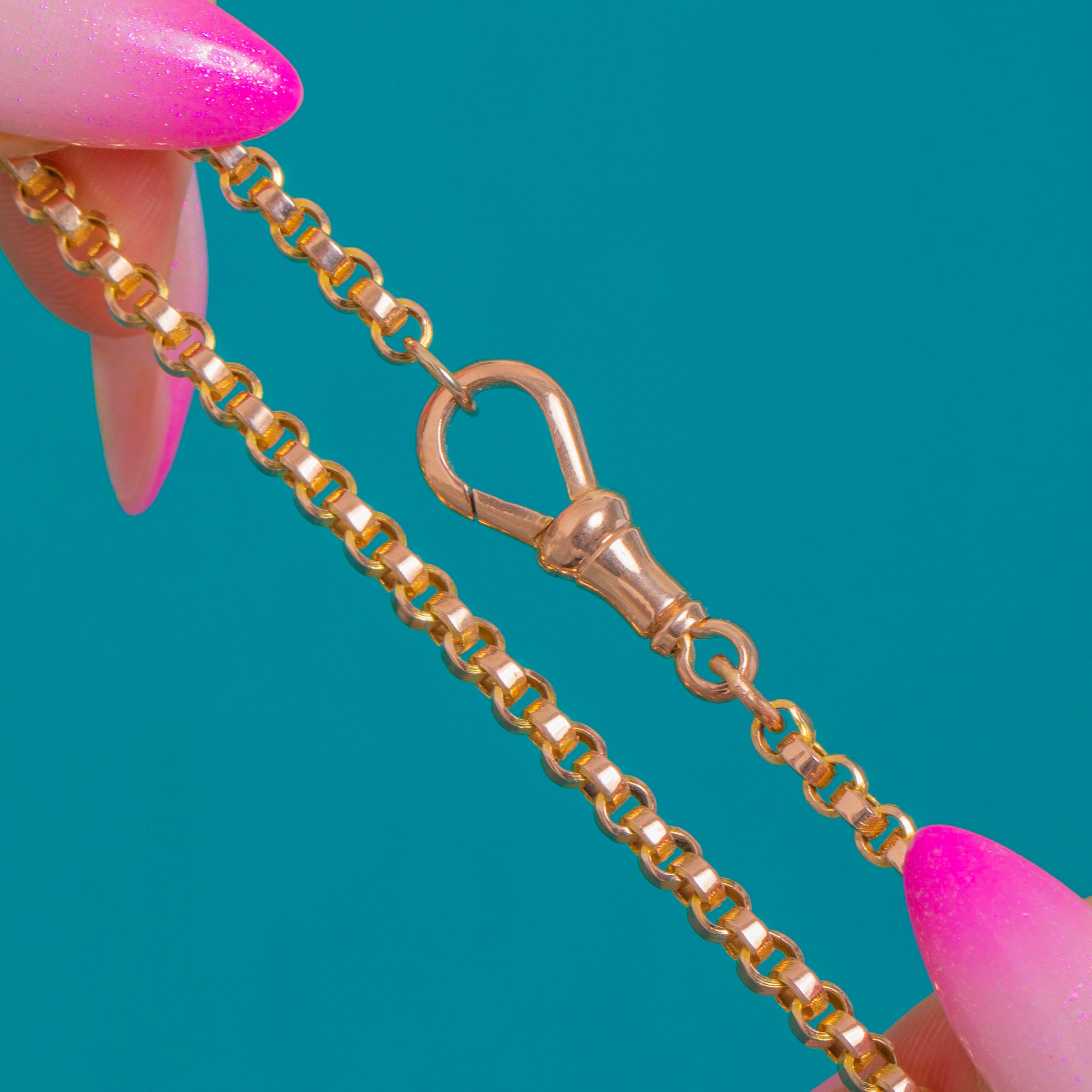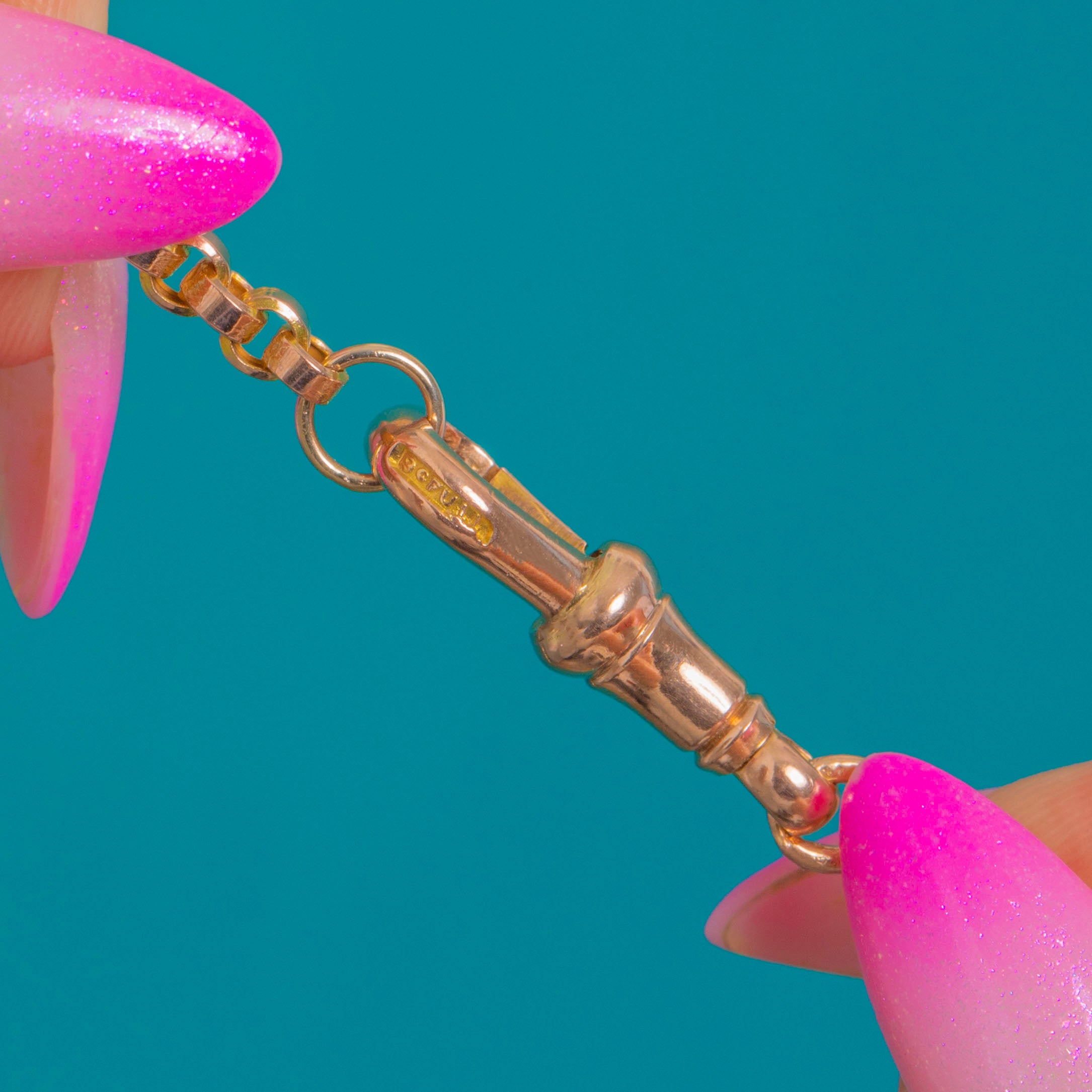 極上:輝きのある美しい金色で、時代相応のごくわずかな表面の擦れのみが見られます。輪はすべて良好な状態で滑らかに連なり、ドッグクリップには拡大してわかる程度の微細な擦り傷がございます。