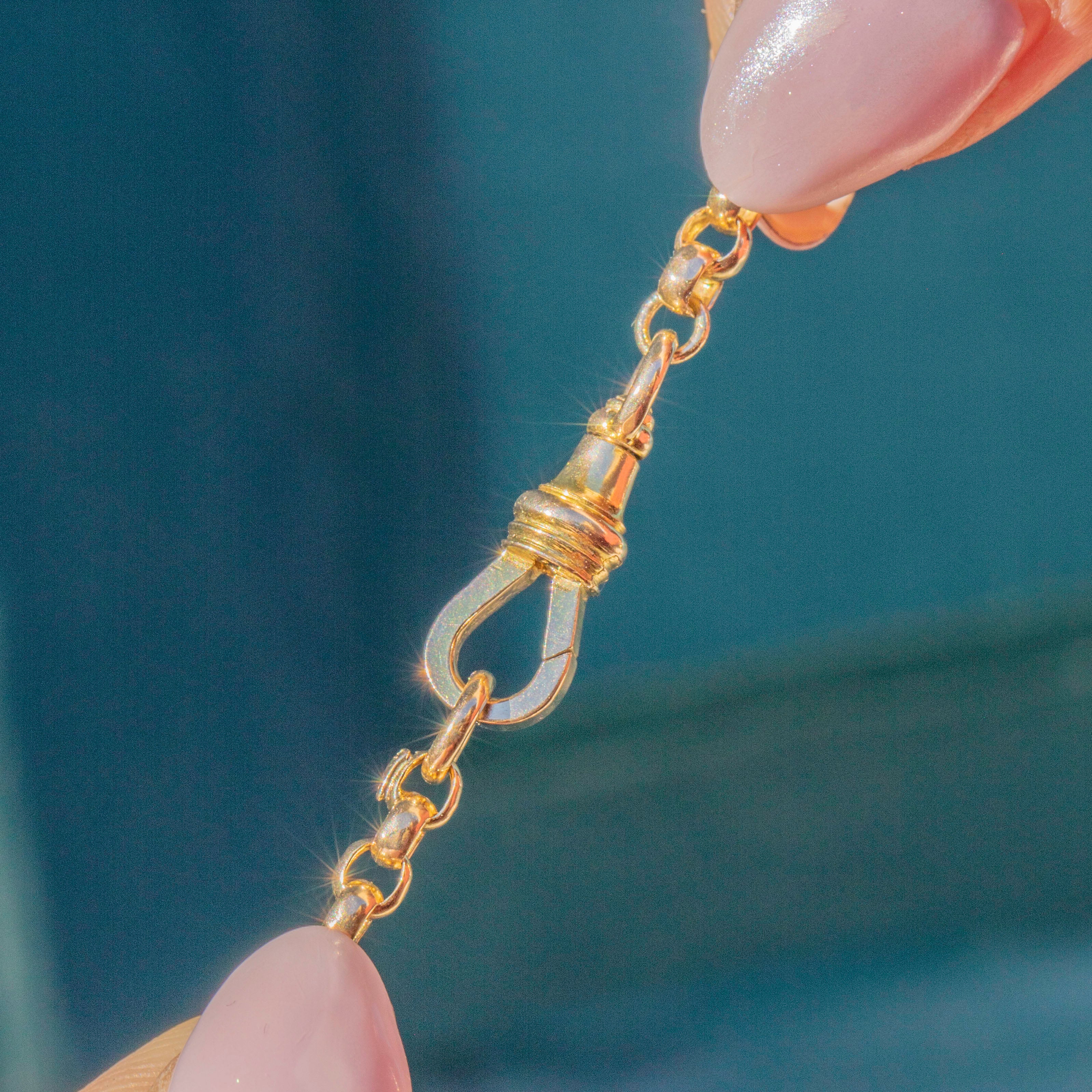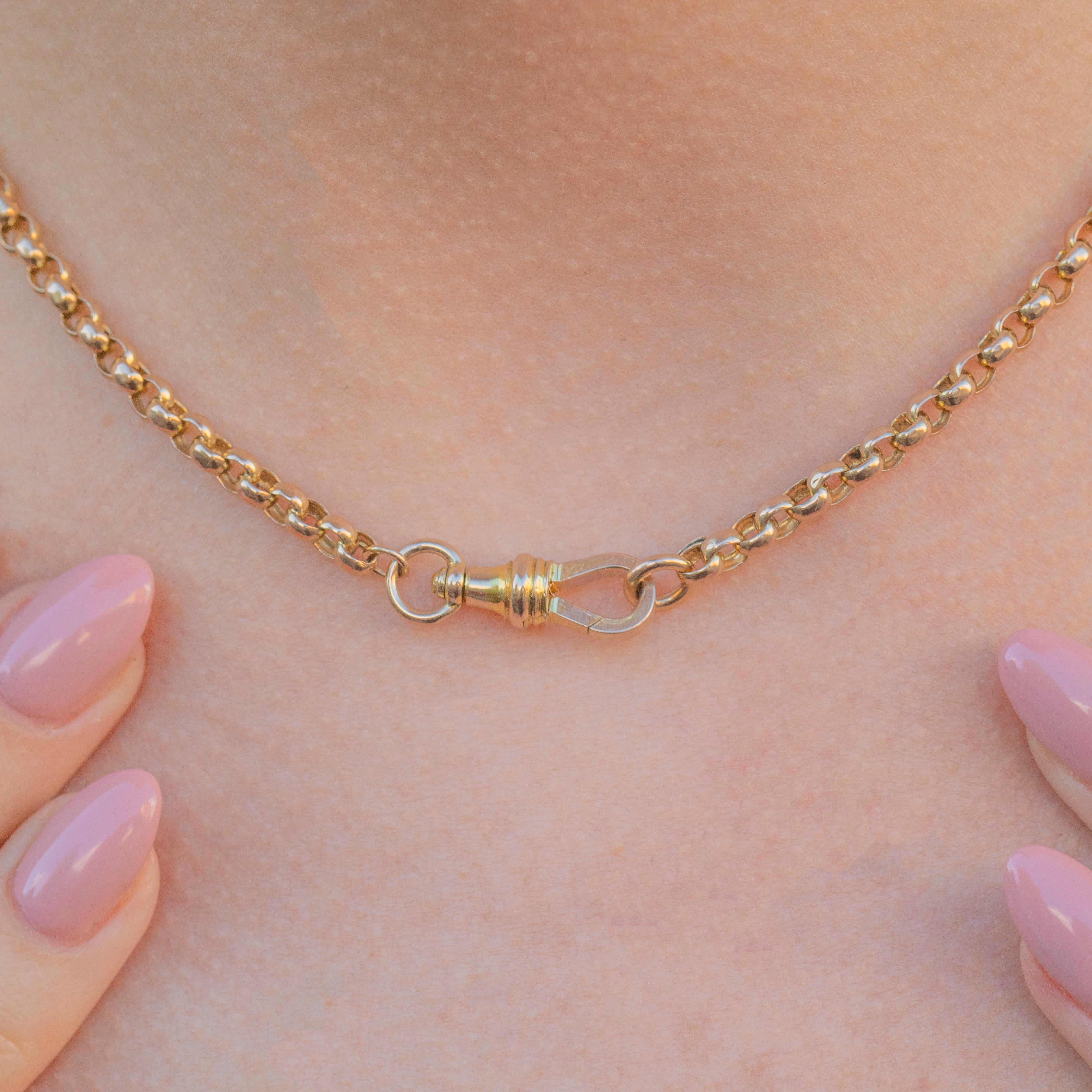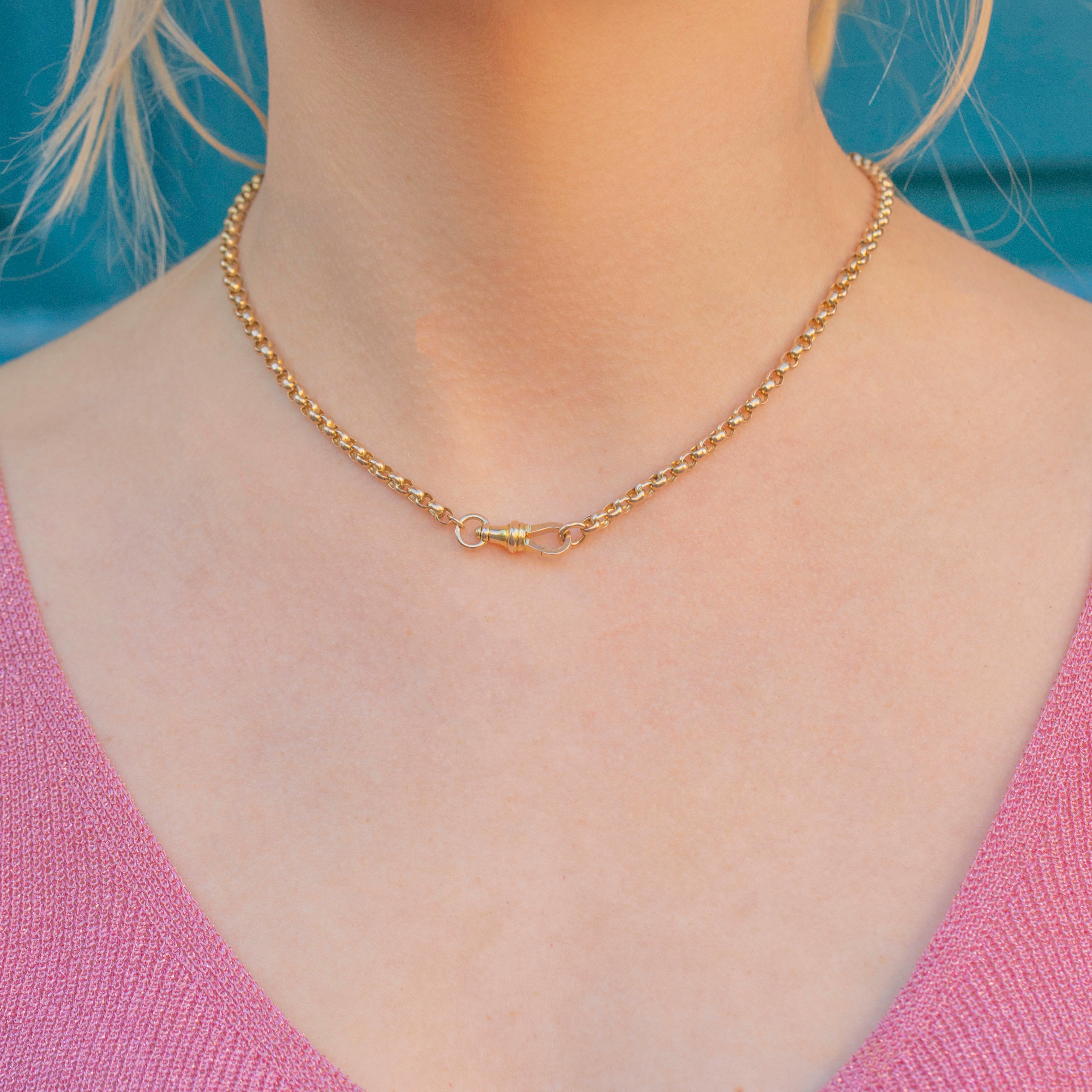 Victorian Gold chains are known for their versatility, and she is no exception. With a traditional belcher style and at a desirable length of 16", this antique chain is ideal to pair with pendants, for layering, or to be worn alone bringing a statement flash of Gold to your décolletage.