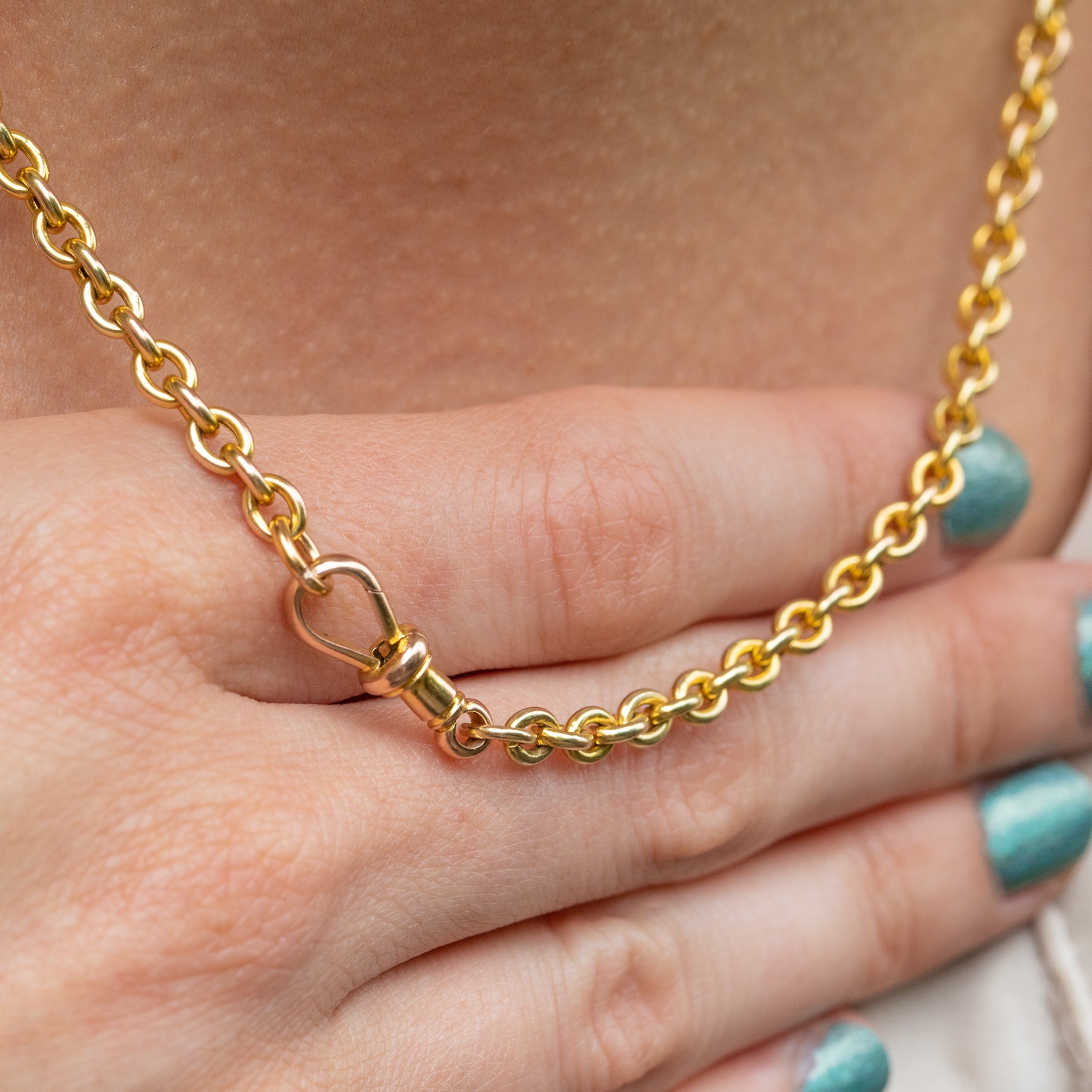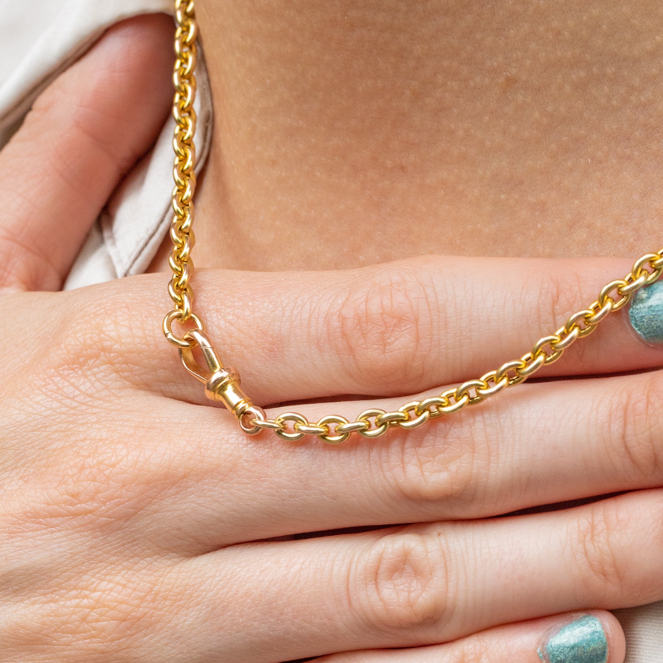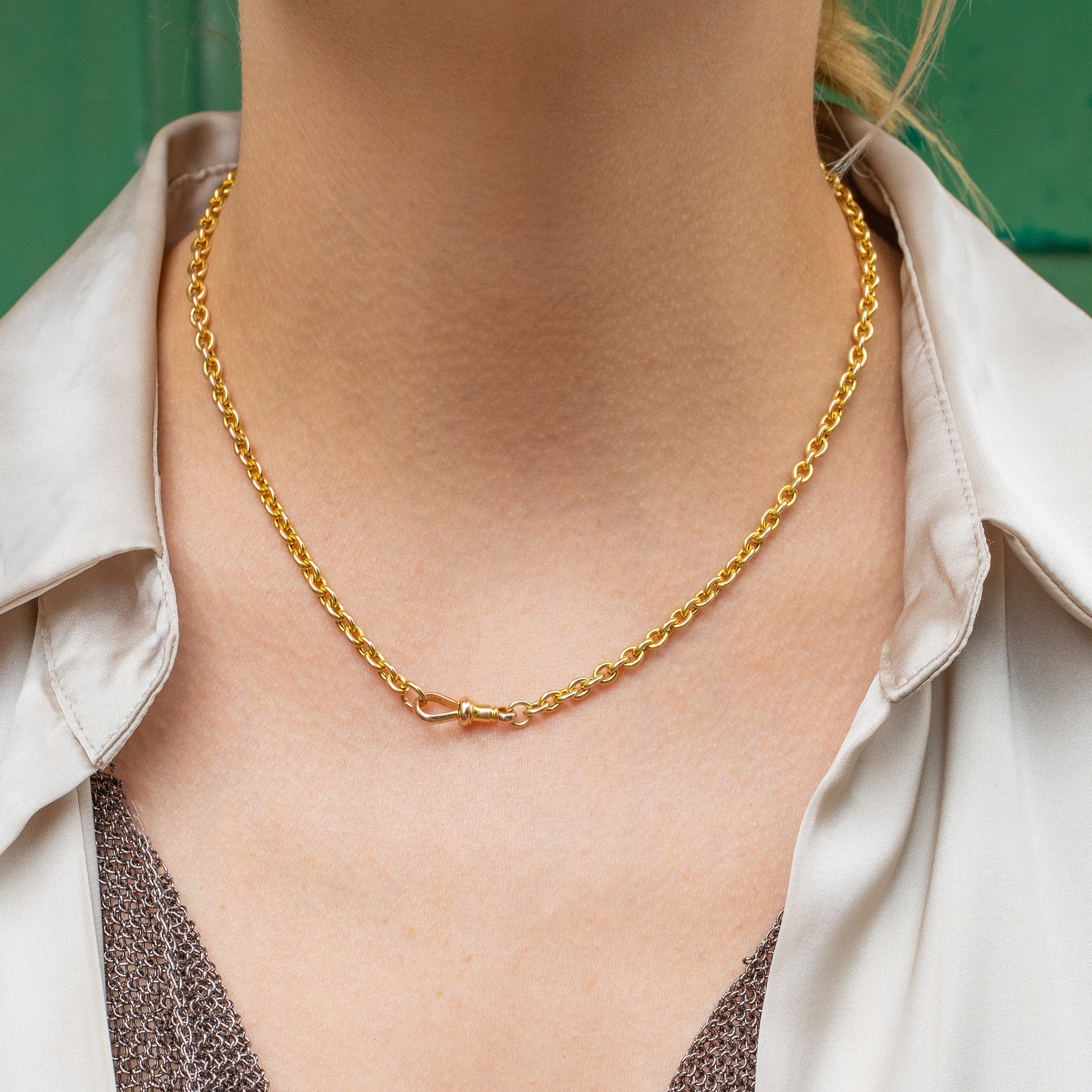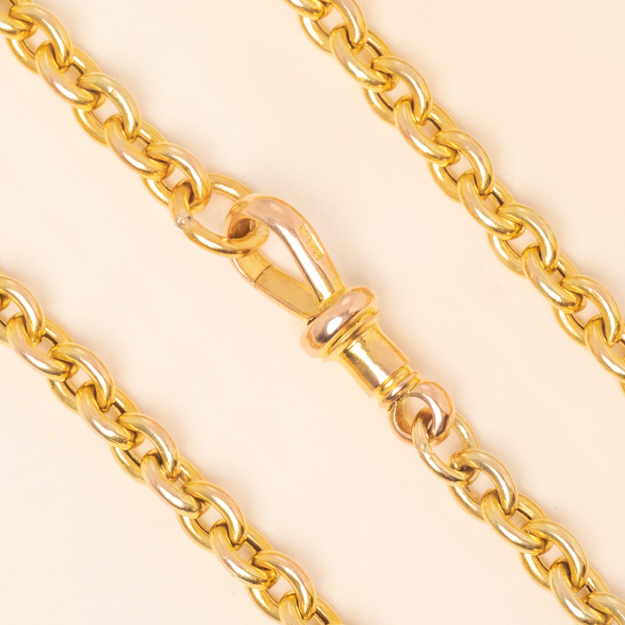 EXCELLENT: This 16" antique 9ct Gold chunky belcher chain is in excellent condition throughout. The tone of the 9ct Gold is sublime, a sought-after resplendent shade of Yellow Gold that will glow with every outfit. Additionally, the 9ct Gold dog-clip ring is in perfect working condition allowing you to wear it with utmost confidence!