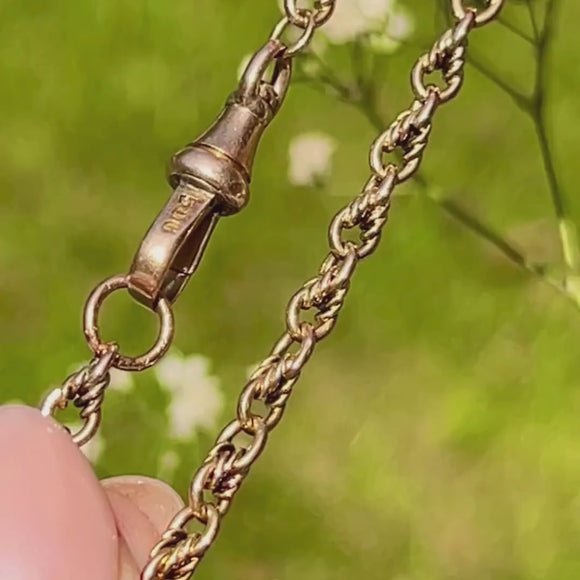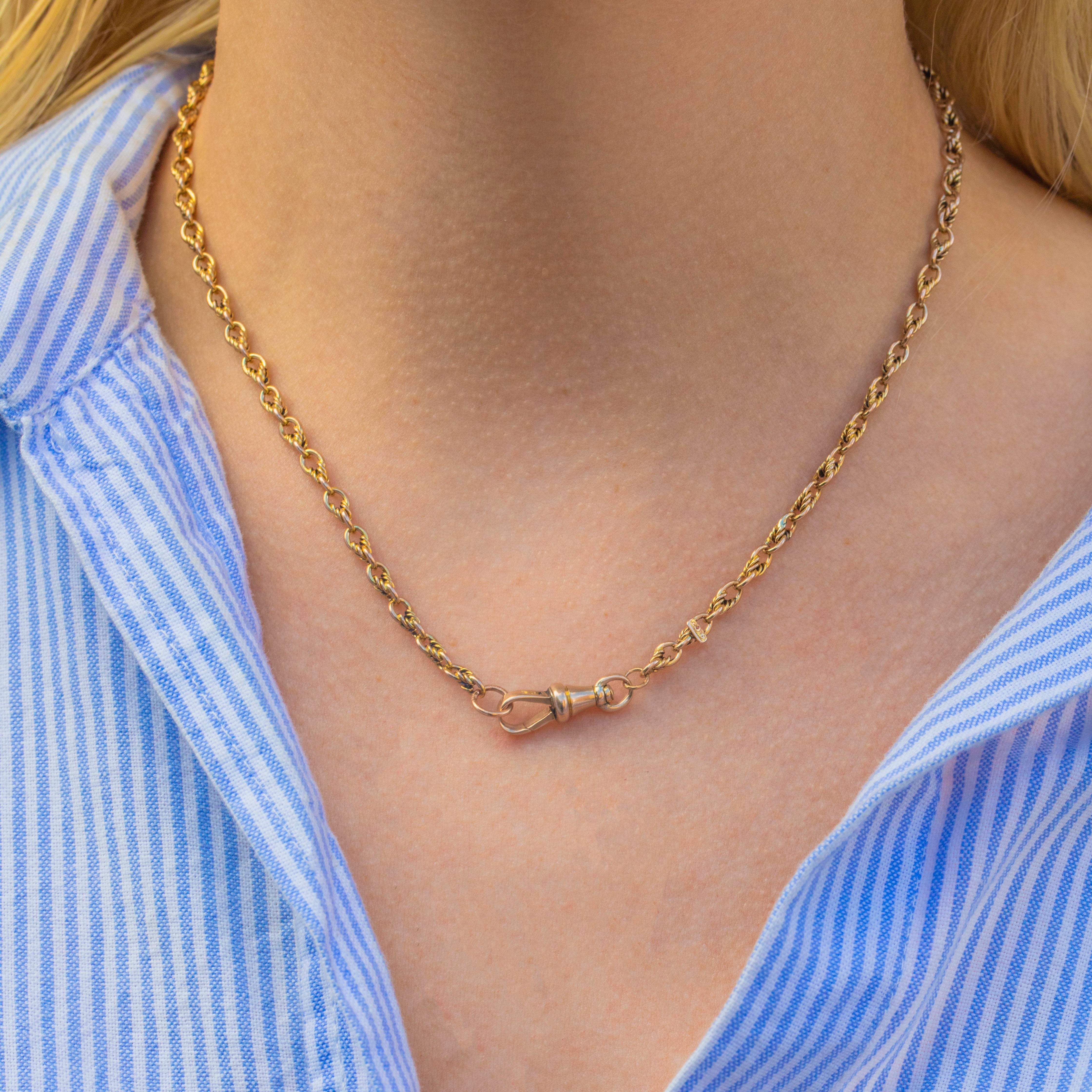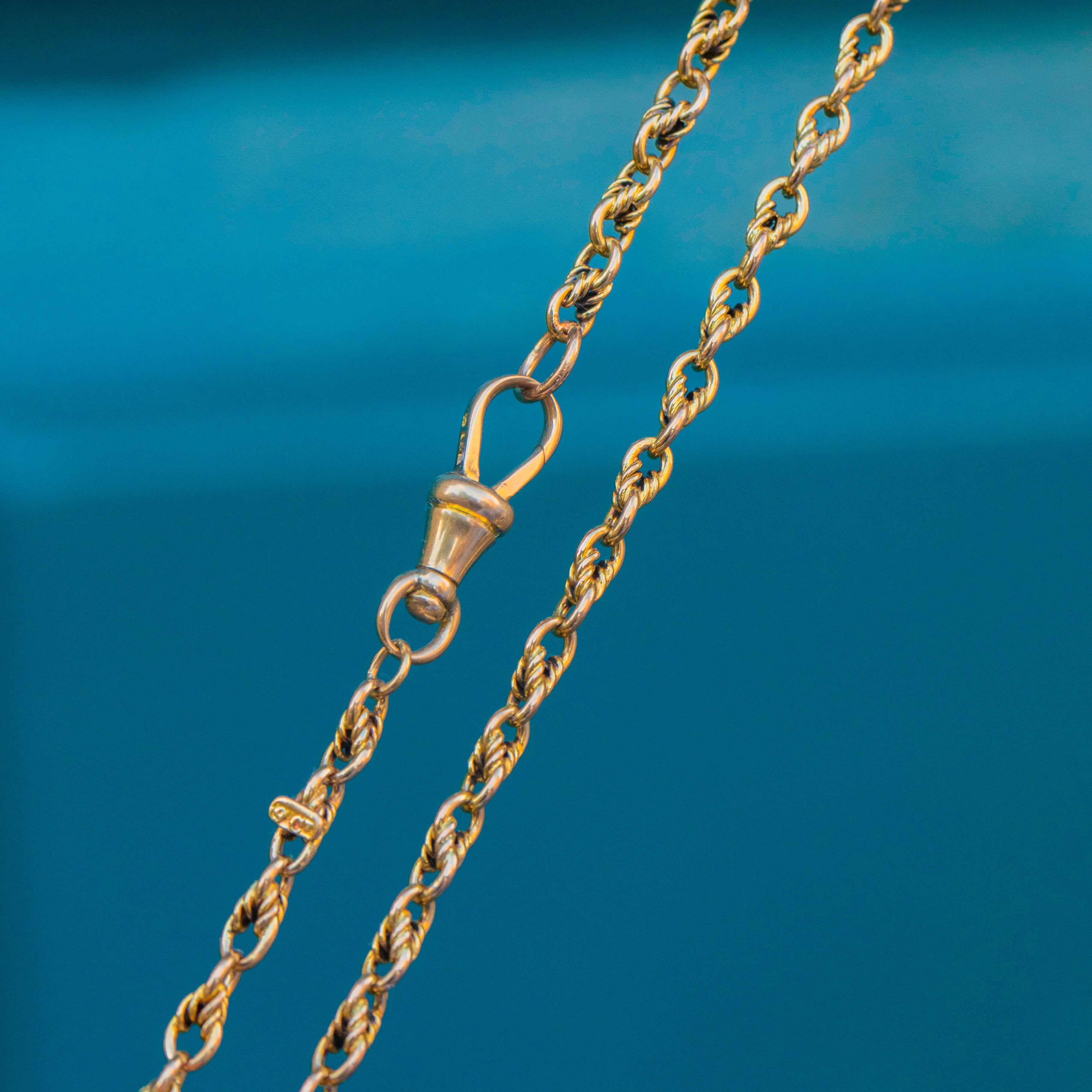 EXCELLENT. This antique 9ct Gold lover's knot link chain is in sublime condition throughout. The links are securely connected and robust promising you years of wear and enjoyment, and the dog-clip is in perfect working condition allowing you to wear this spectacular Victorian chain with absolute confidence!