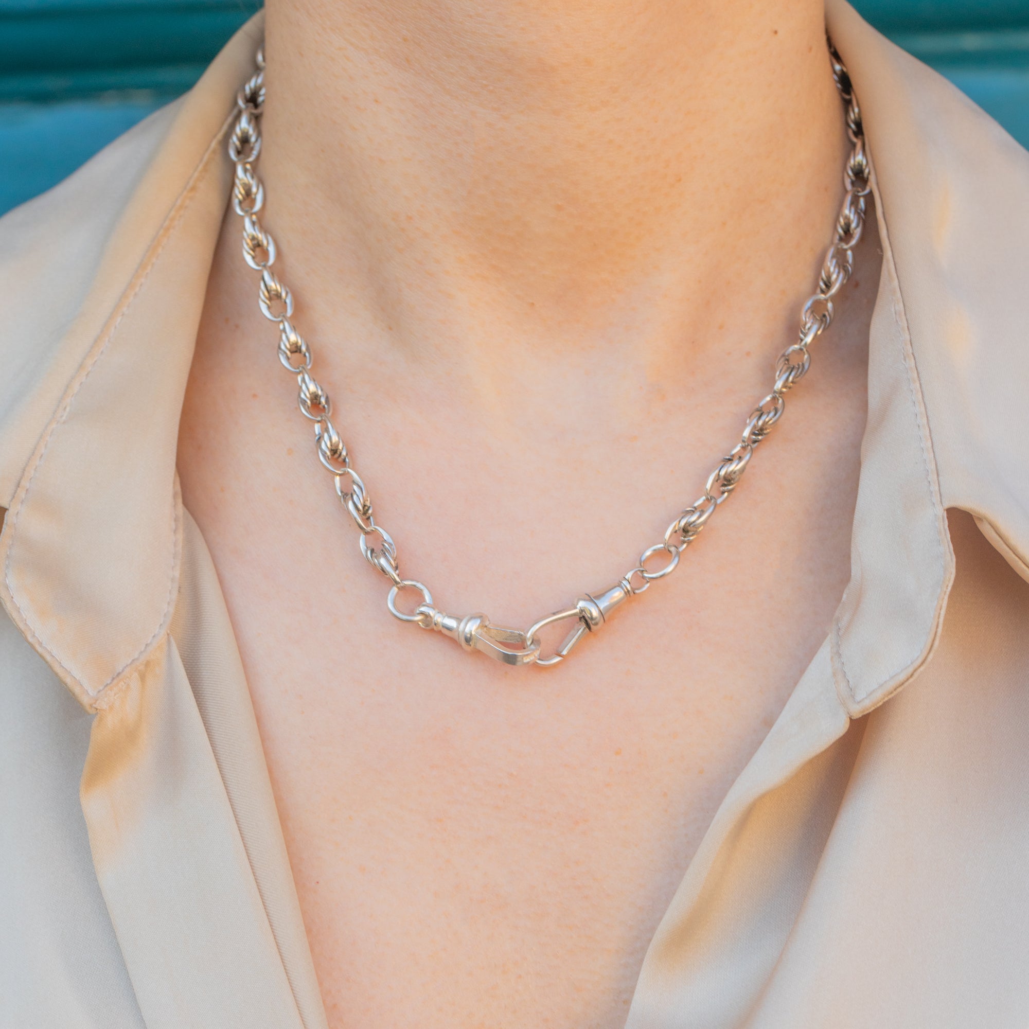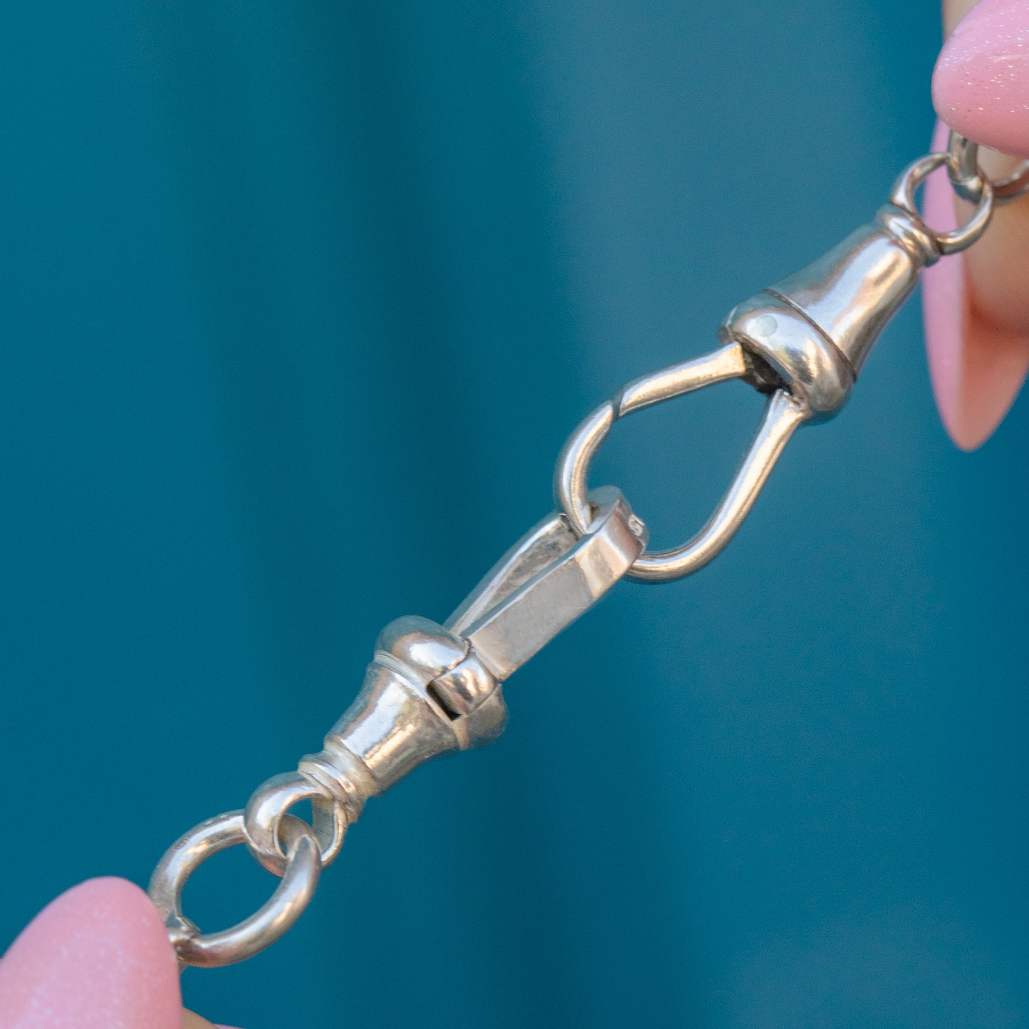 VERY GOOD-EXCELLENT: This antique Silver lover's knot Albert chain is in wonderful condition and looks just as superb today as when she was first created over a century ago! Each link is perfectly formed with no signs of wear. Being handmade, the links all vary slightly in size but we feel this just adds to her antique charm. The dog clips are in fine working order keeping this antique necklace securely attached for your peace of mind! One dog clip is new, indicated by the stamp of 'STERLING' on her, but the other is authentic antique.