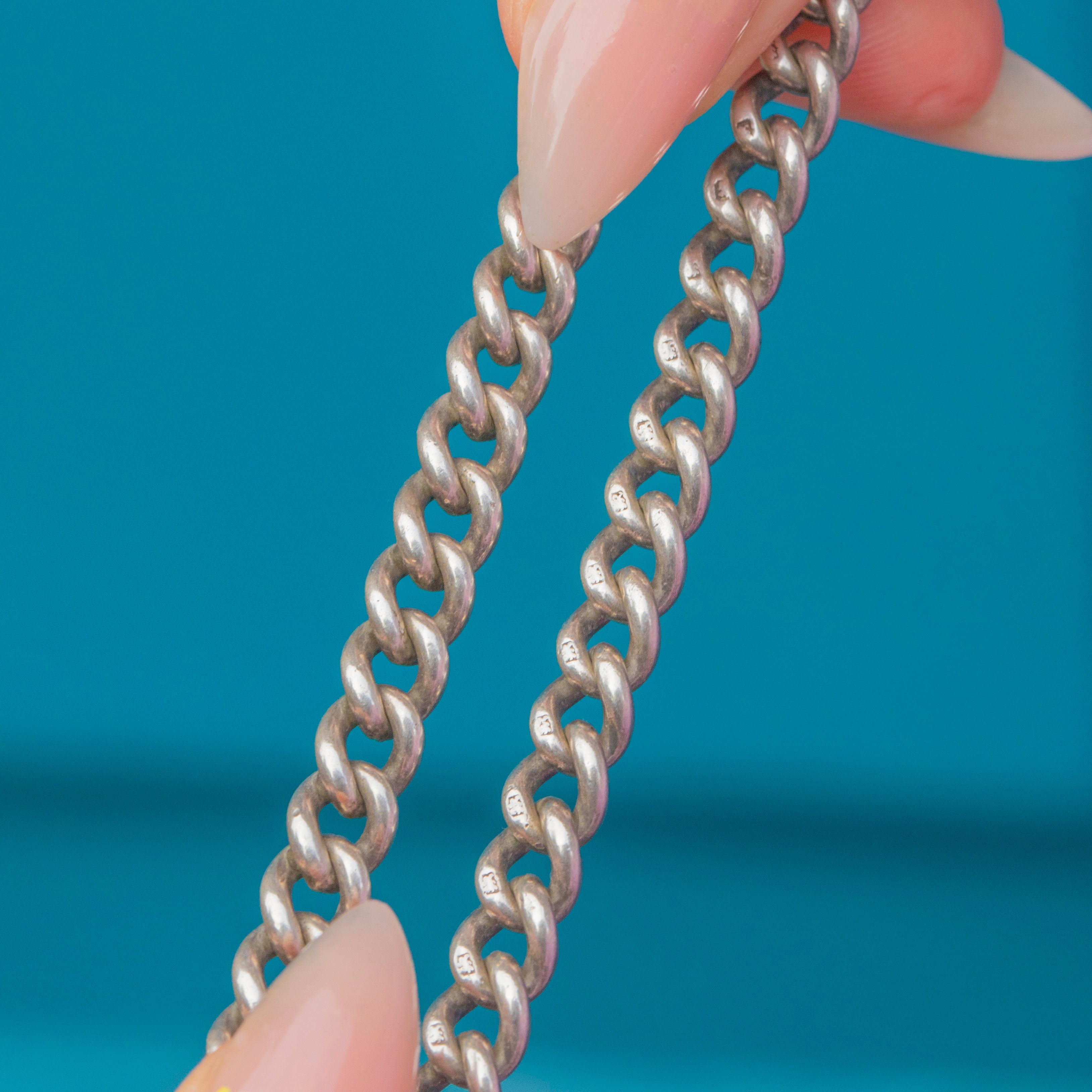 The chain is beautifully made, 39 grams! With every link stamped with the Lion Passant for Sterling Silver. Both dog-clips and the T-bar carry the maker’s mark “HB&S”, along with further hallmarks including a date letter “X” for the year. Substantial and stylish, this chain is a timeless antique that will remain versatile and wearable for years to come.