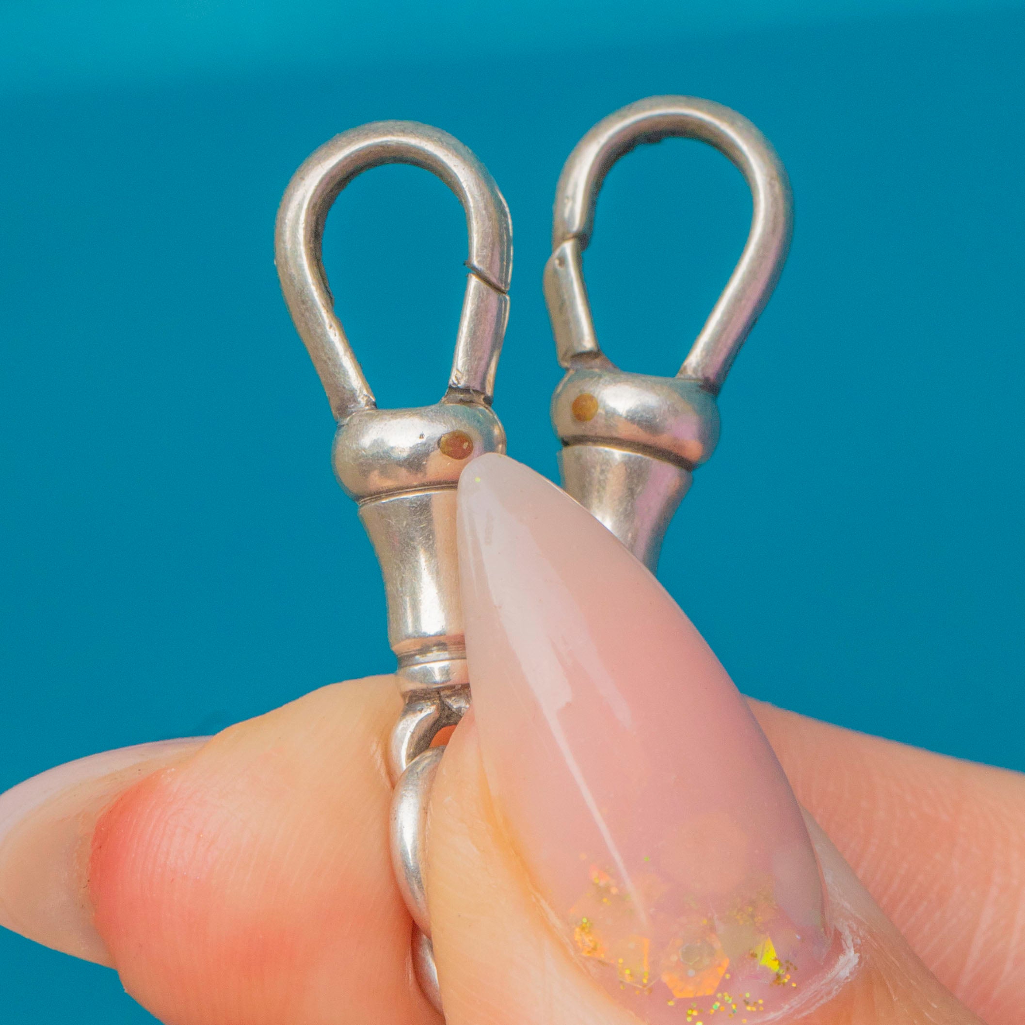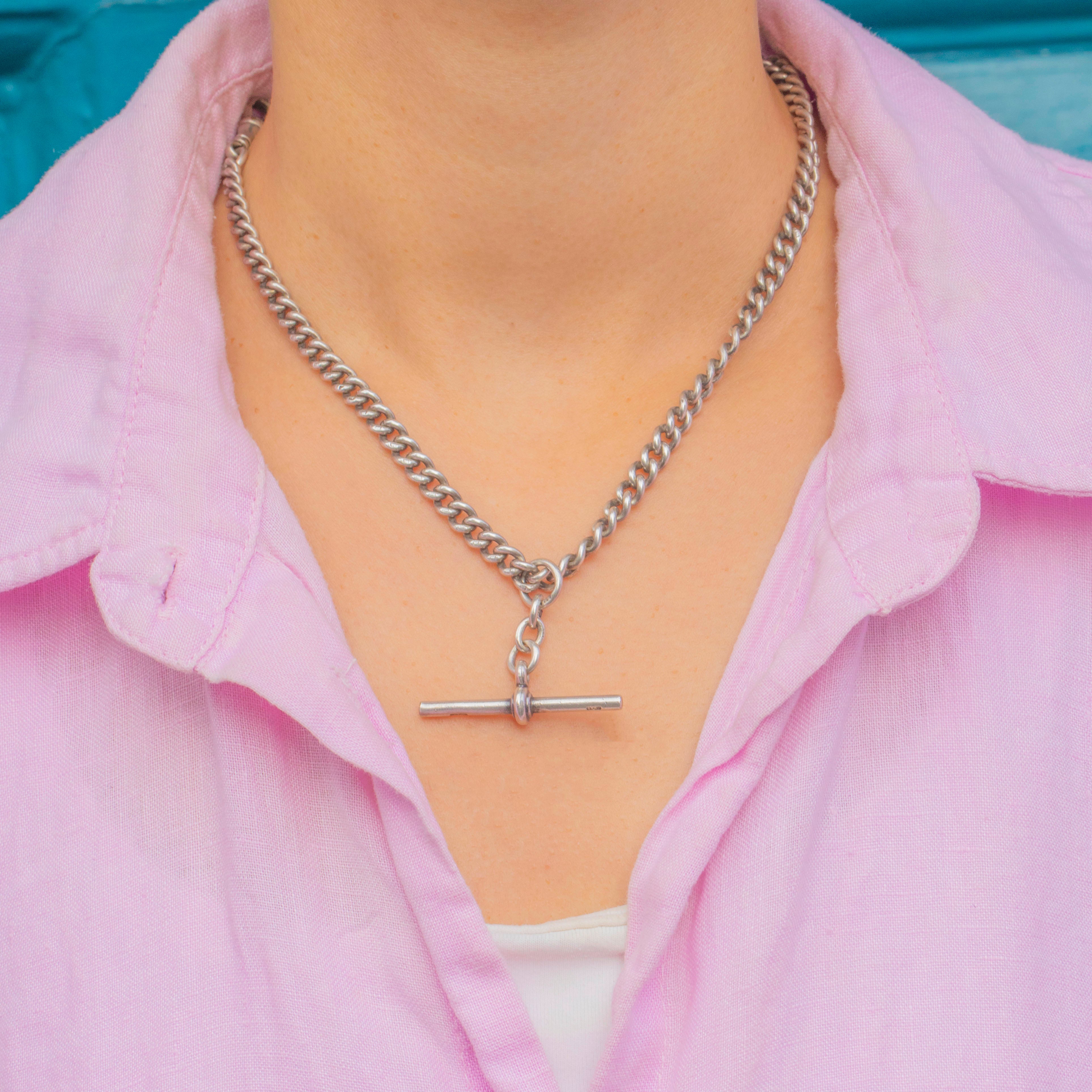 This handsome Edwardian Albert chain is crafted in solid Sterling Silver, dating to c.1900. Measuring 17.5" long, it features classic curb links with a mobile T-bar and a pair of matching dog-clips, making it ideal for wear as a necklace or as a traditional watch chain.