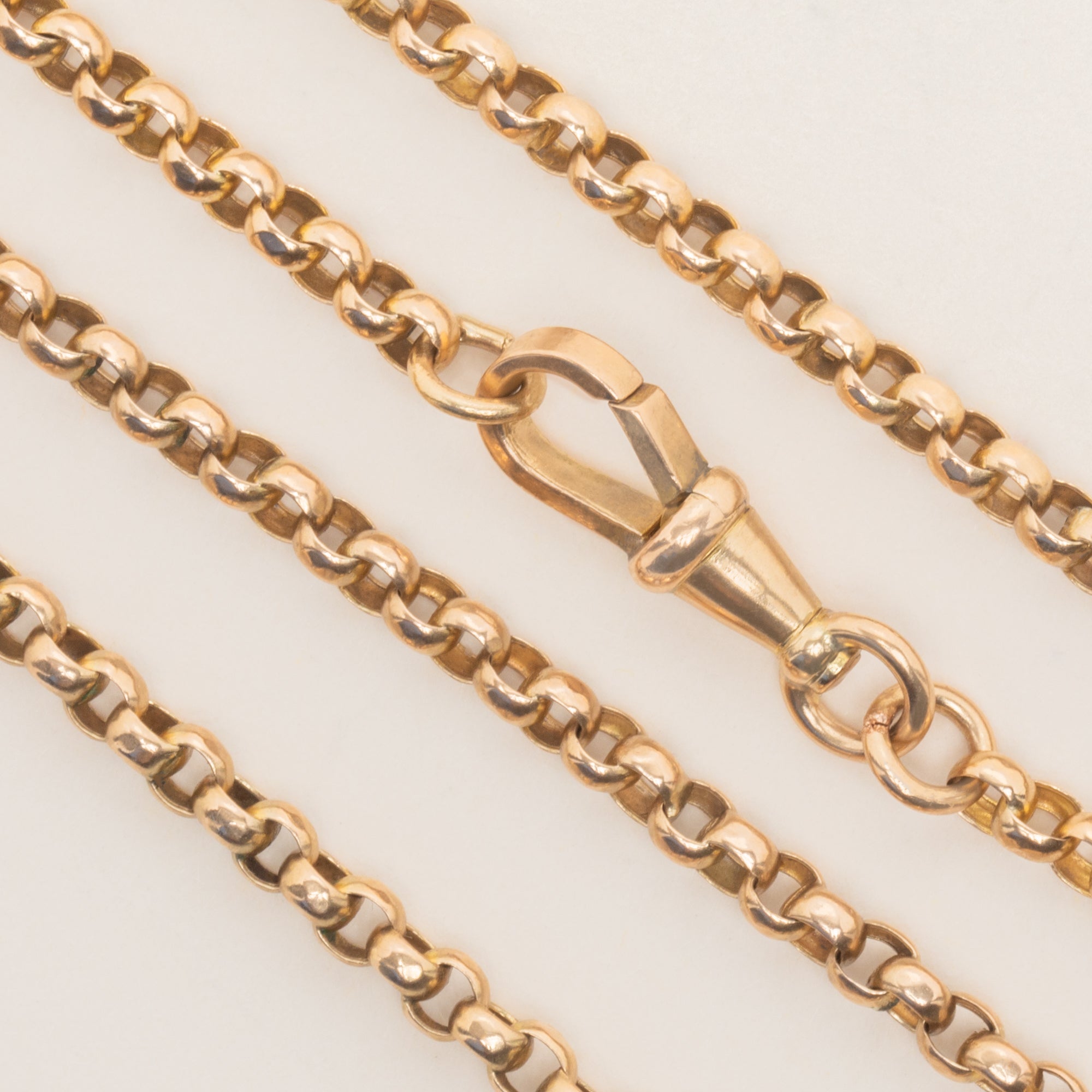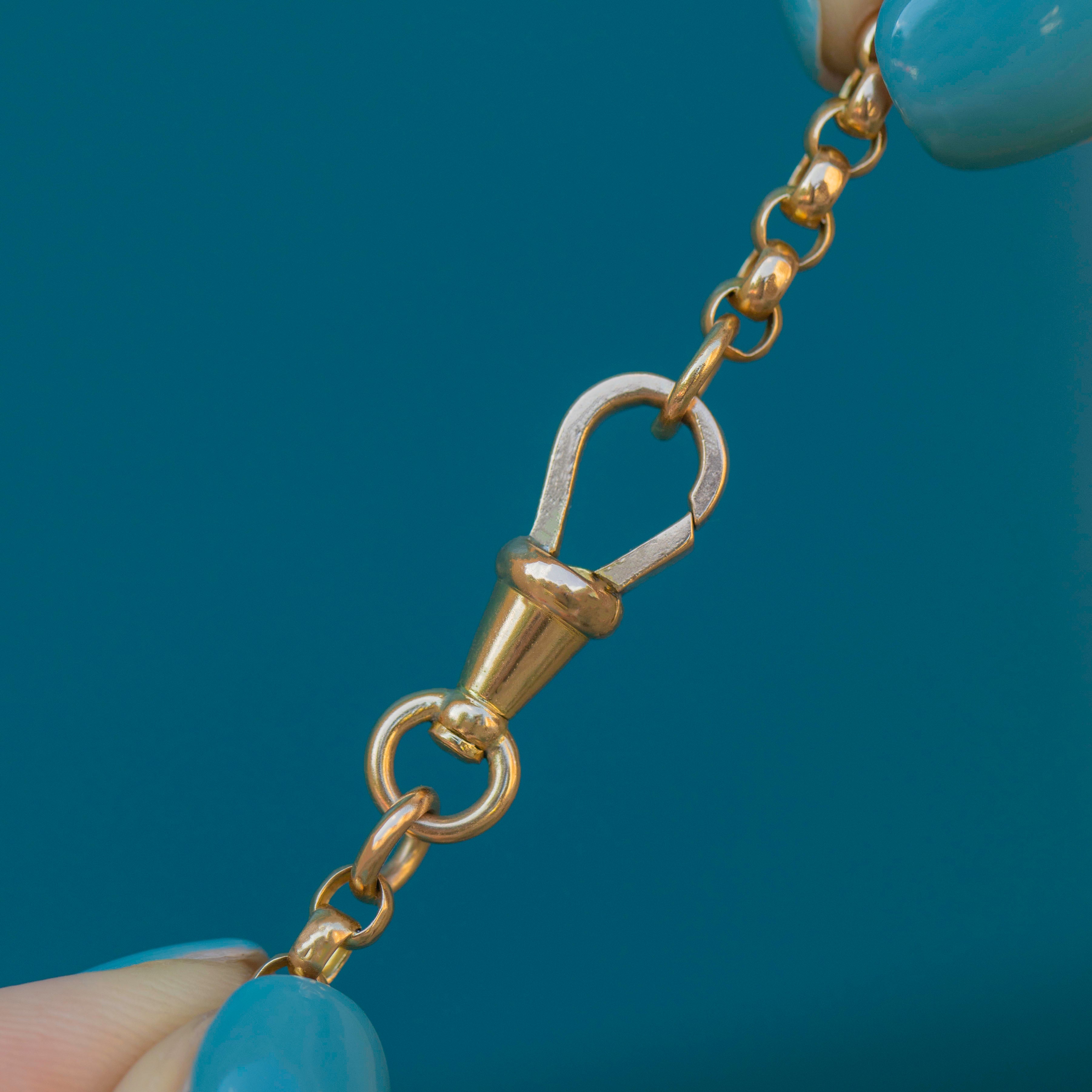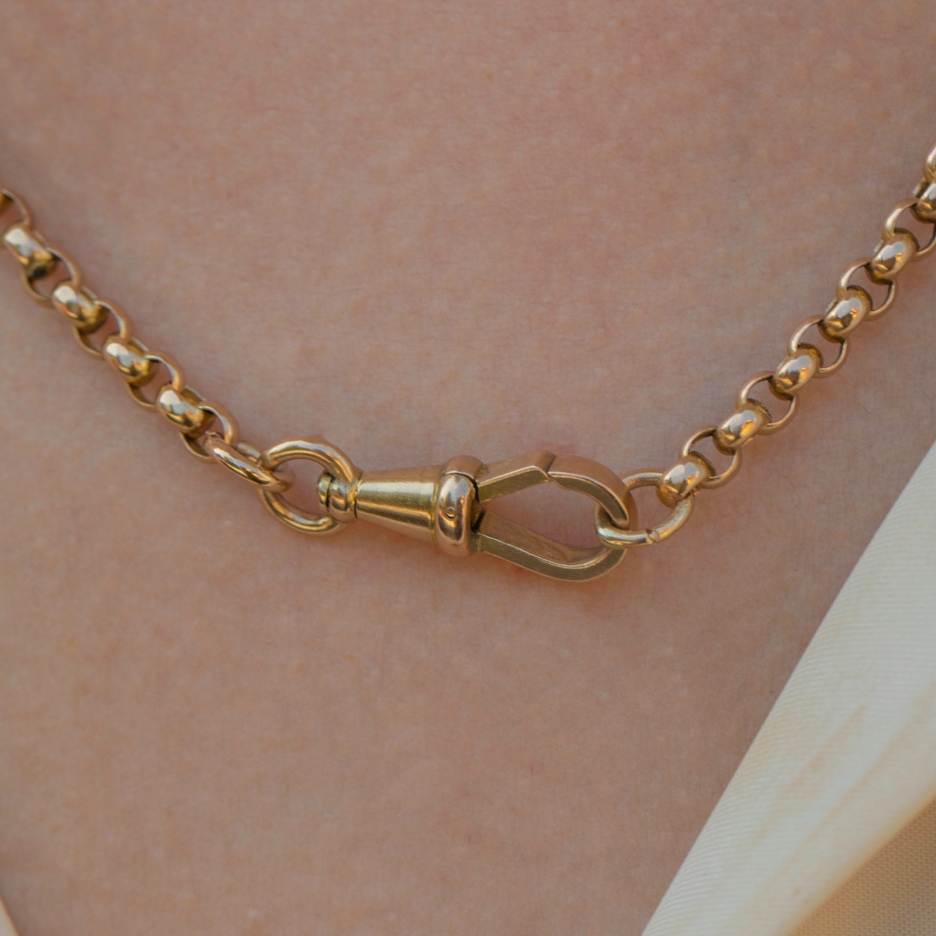 EXCELLENT. This antique 9ct Gold belcher chain is in gorgeous condition. Her 9ct Gold belcher links have kept perfect shape over the years and are securely linked, with an evenly saturated hue throughout. The antique dog clip can be easily opened and fastened allowing for secure and confident wear. What a dream!