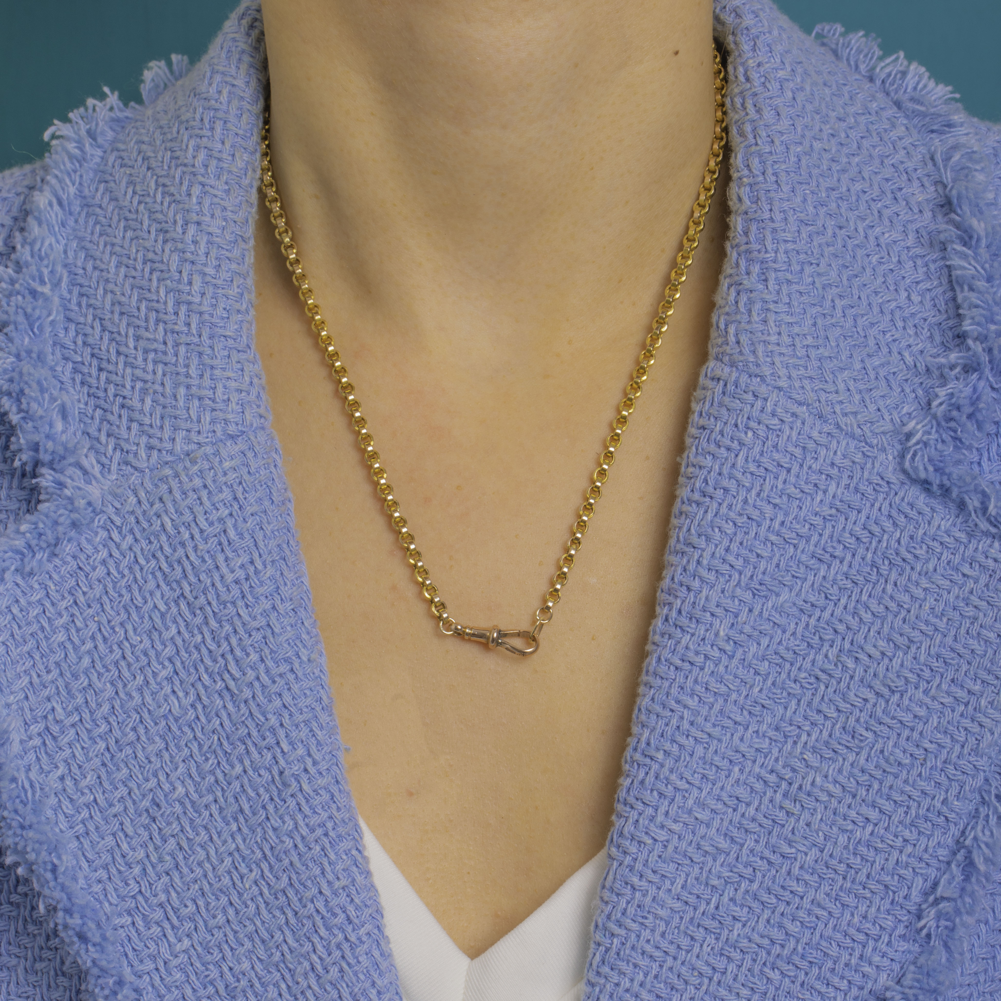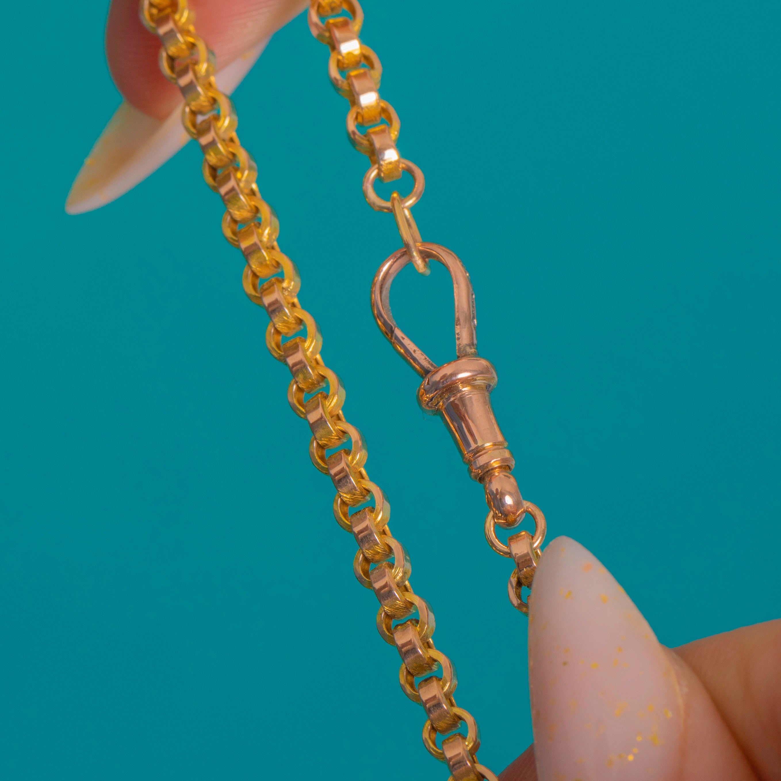 A timeless Victorian belcher chain in glowing 9ct Gold, styled with a classic spring dog-clip for that coveted watch-chain look. The uniform round links have a satisfyingly sturdy feel and a bright polish, offering clean geometry and effortless elegance.