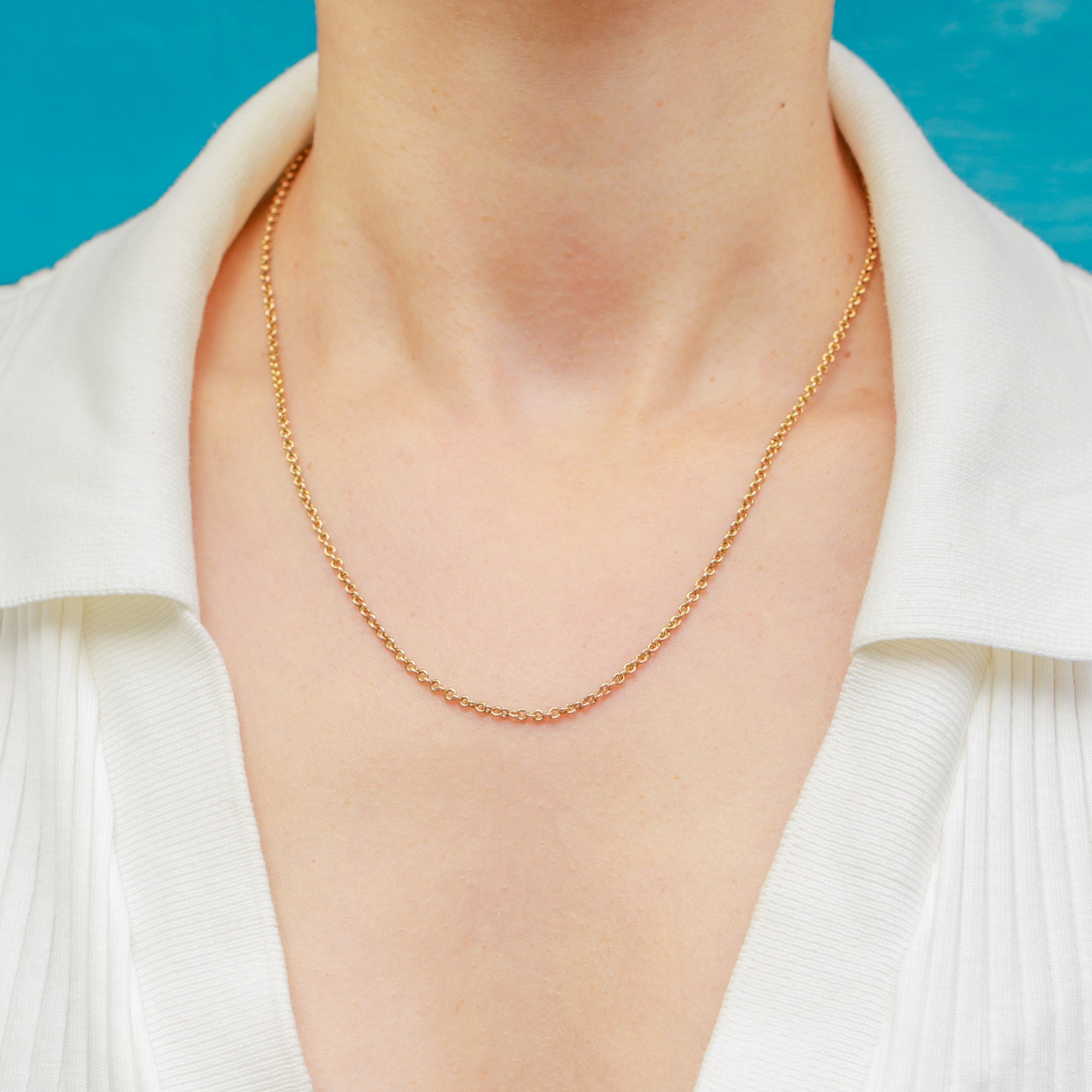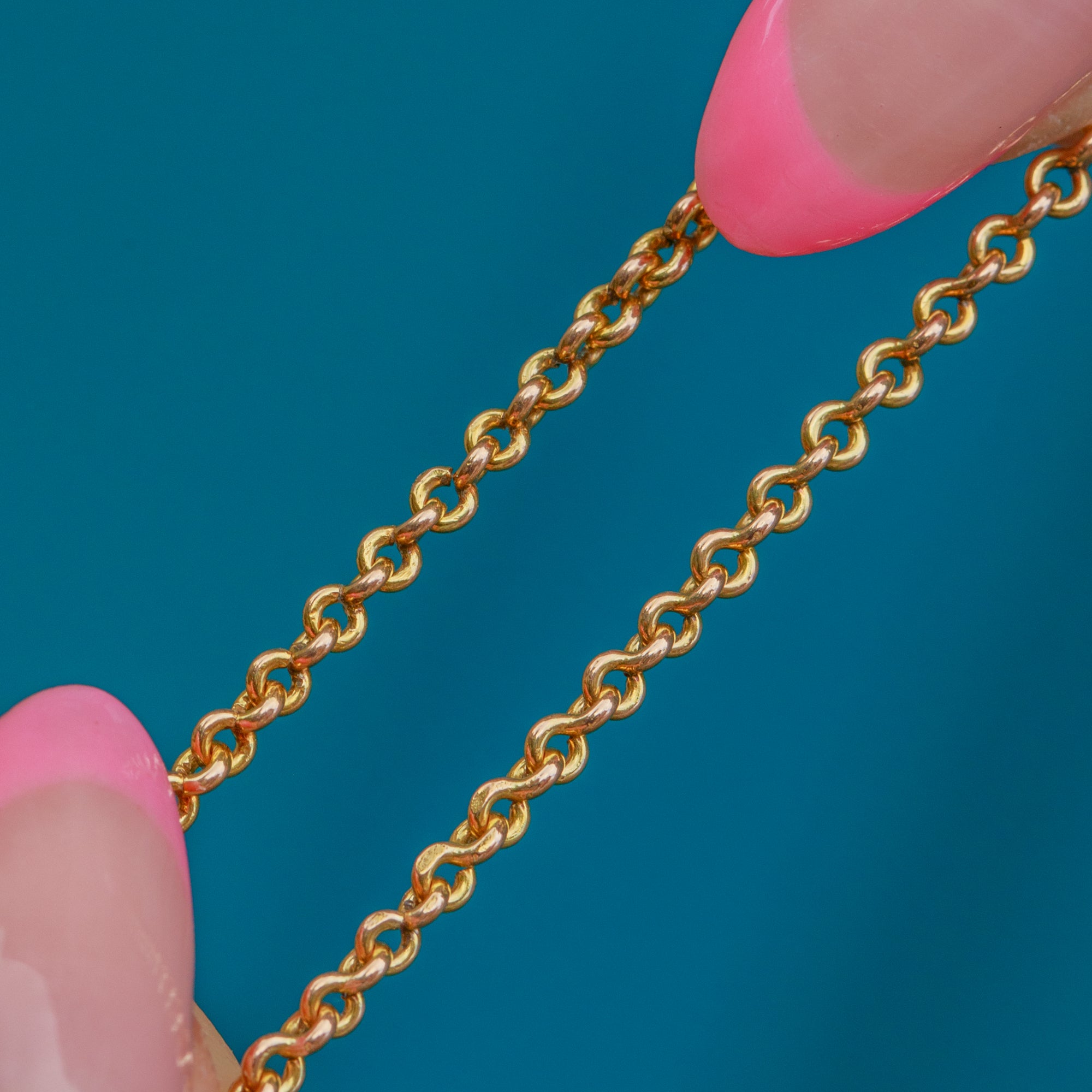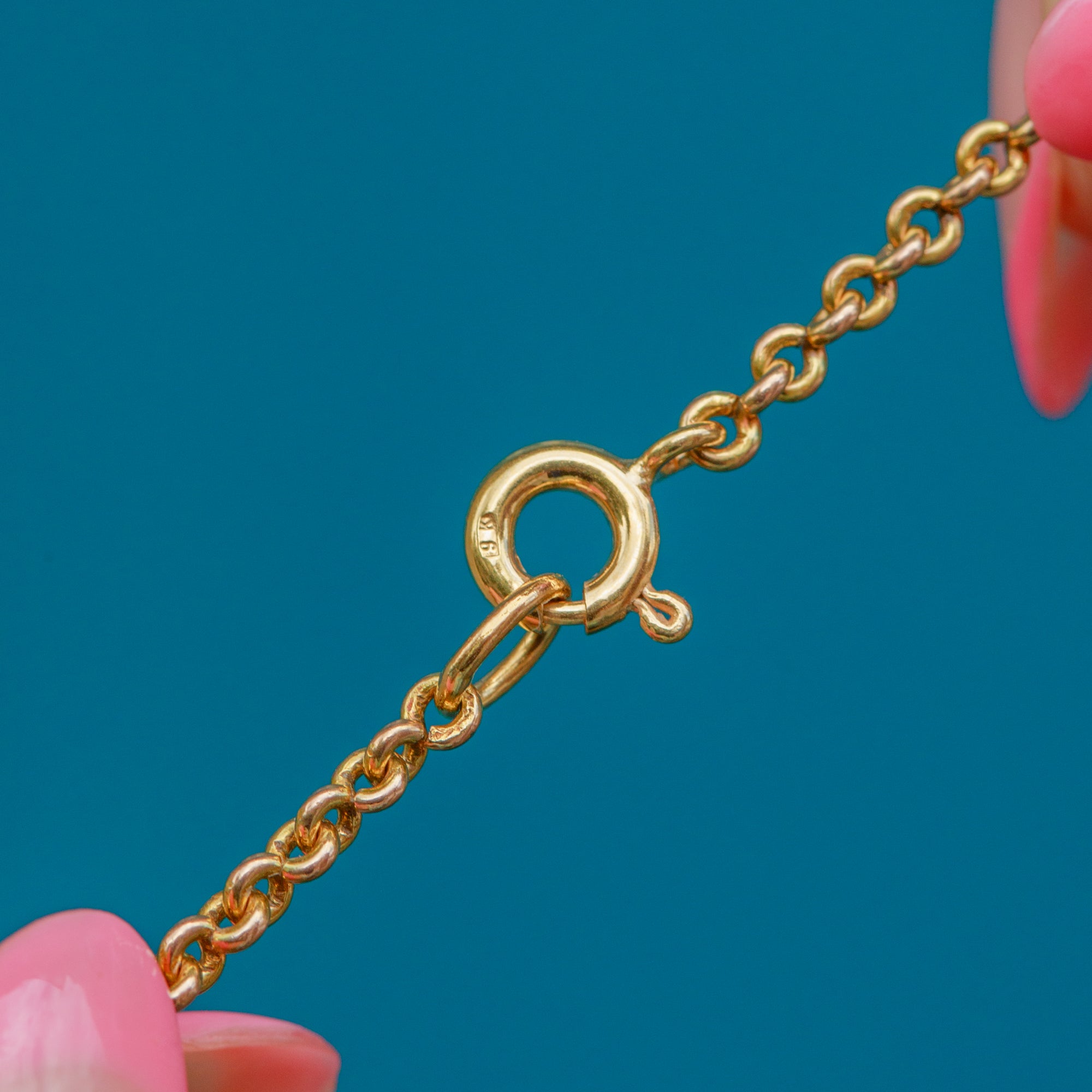 VERY GOOD: This 9ct Gold pendant chain is in very good condition. There is little to say about this chain; each link is securely connected, and the Gold is buttery, shining decadently under the sun. The bolt ring is slightly stiff, meaning you will sometimes need to push it shut. This Vintage pendant chain will make a timeless addition to any collection!