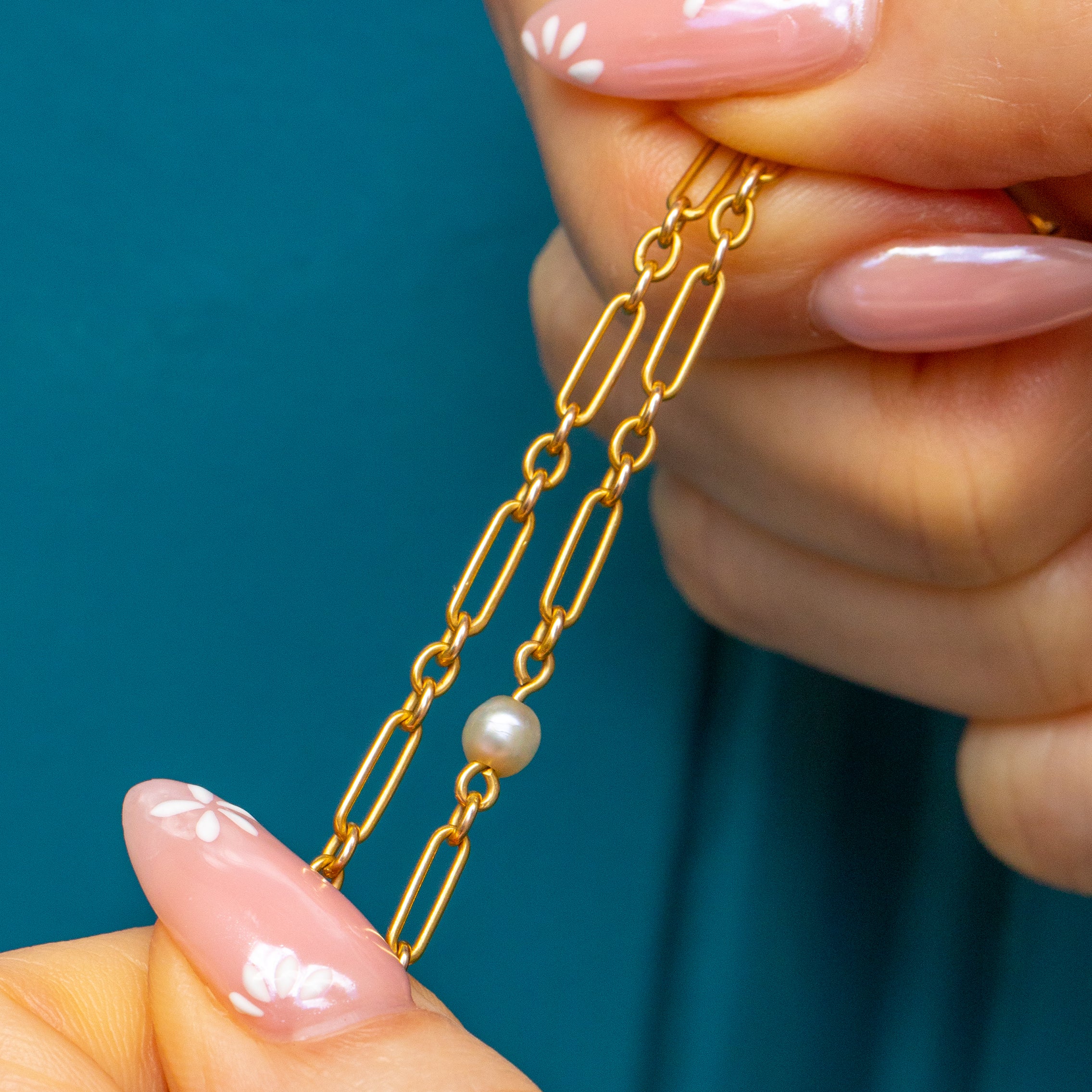 Let's take a moment to appreciate the sheer beauty of this antique 15ct Gold mini trombone link chain! Richly saturated 15ct Gold forms her slender trombone links, intertwined with three shimmering Pearls for an elegant finish.