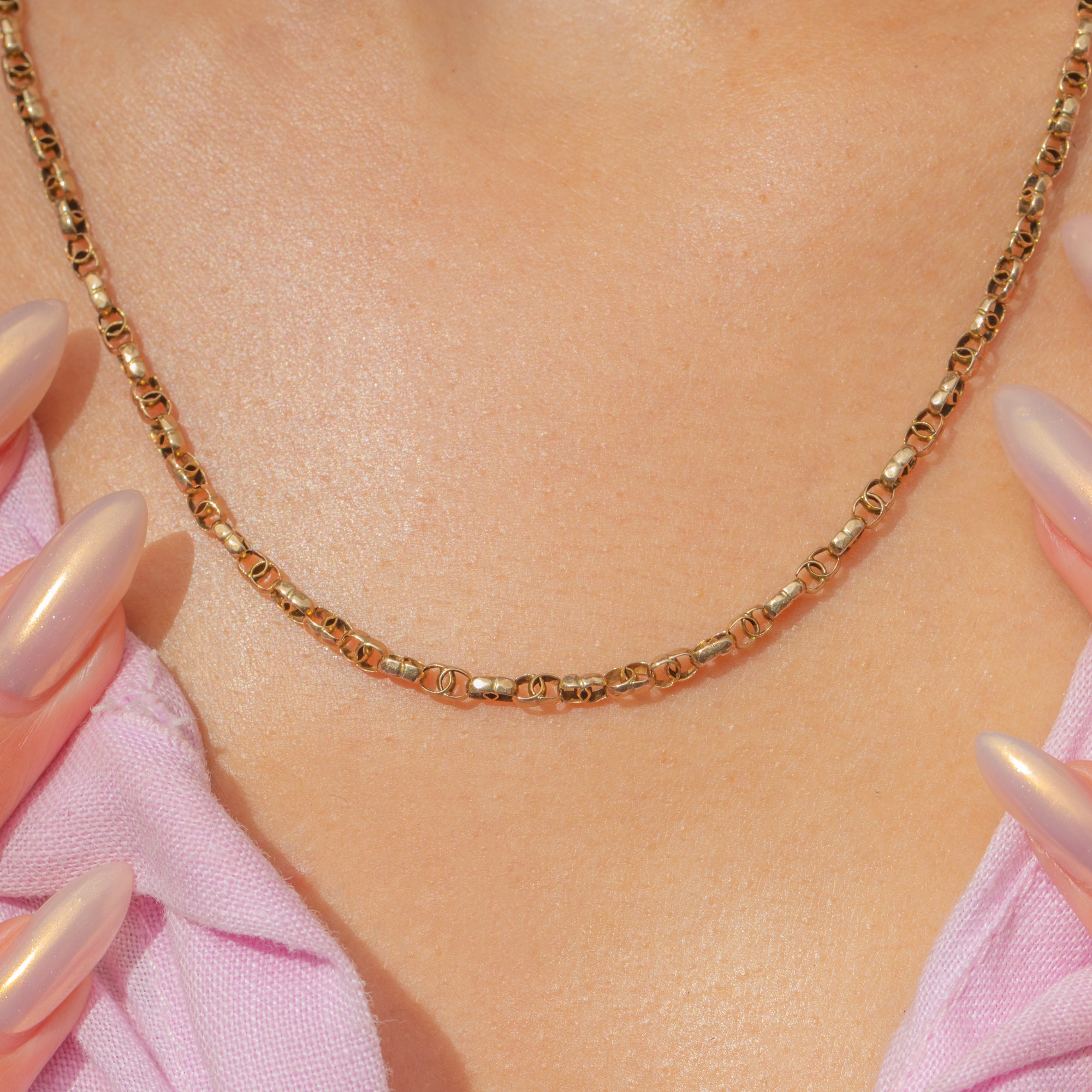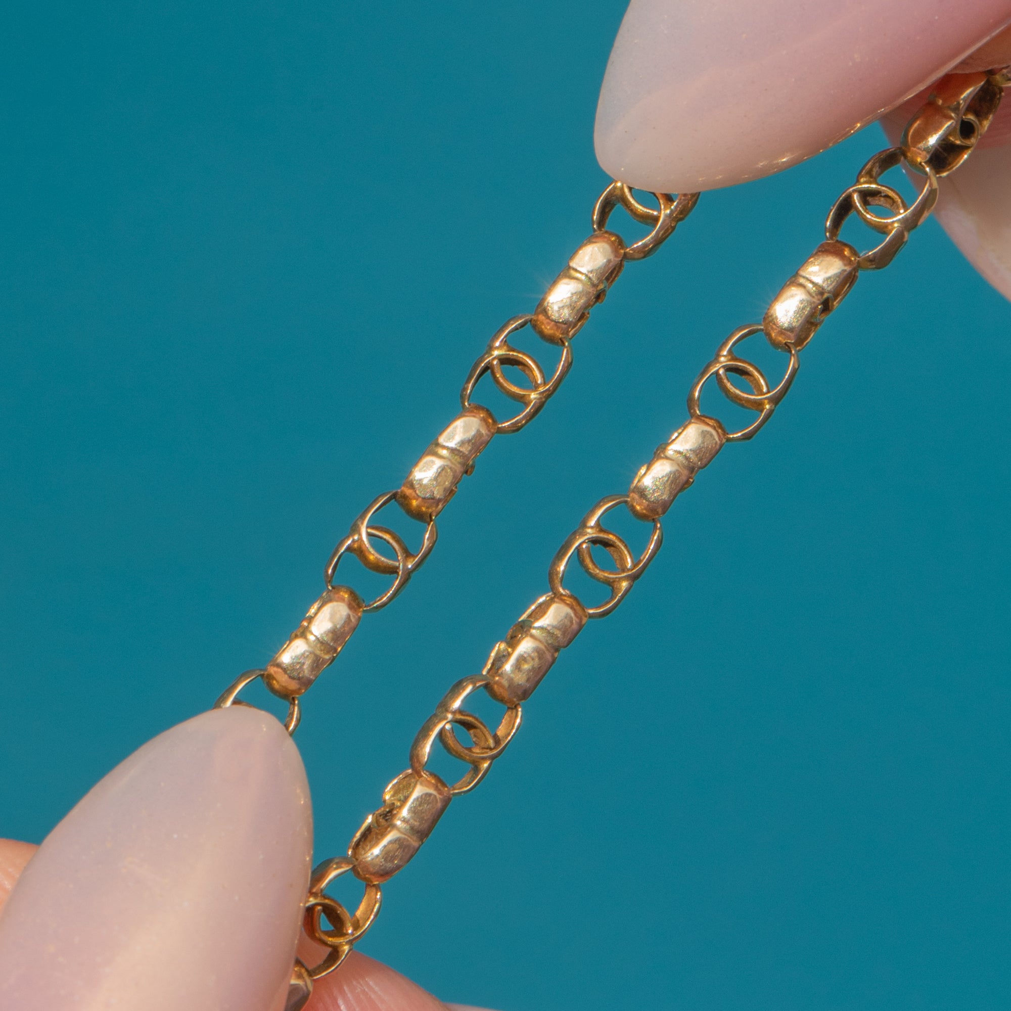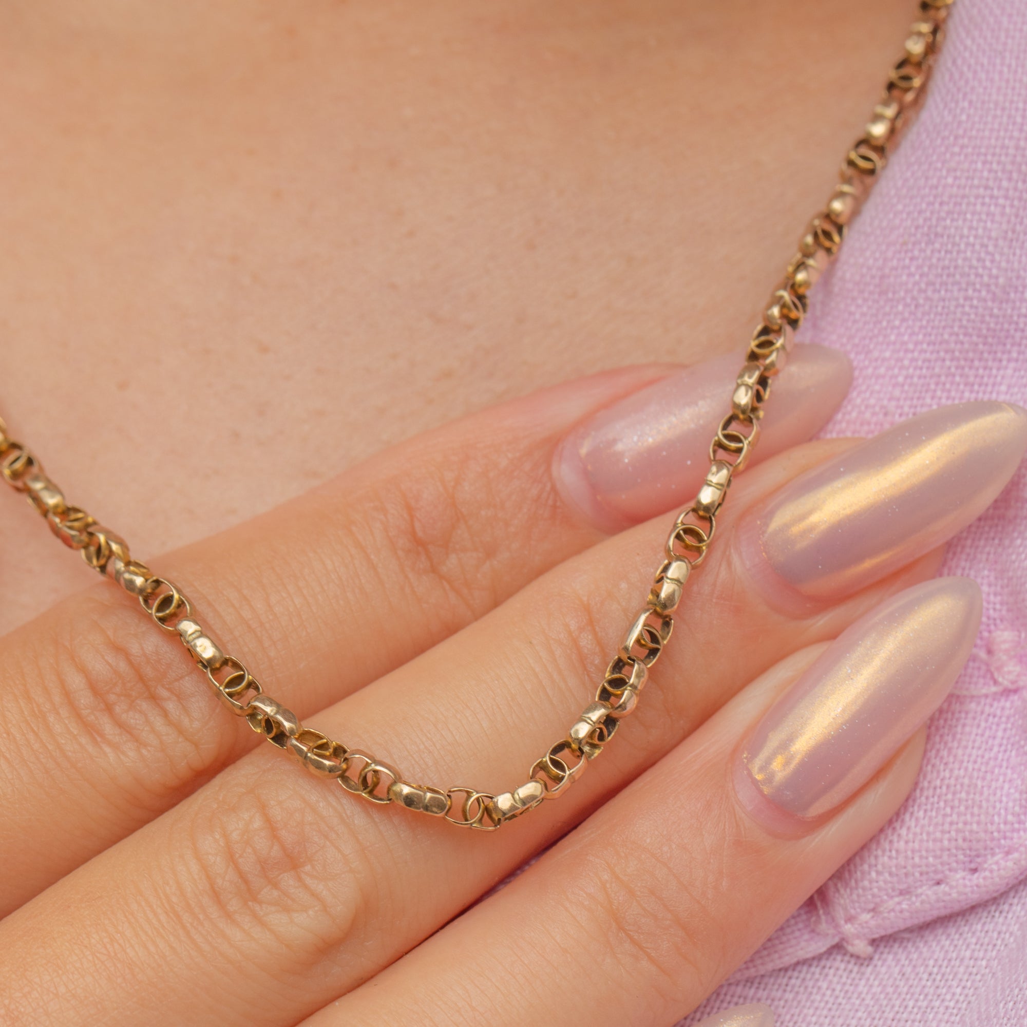 This Victorian chain necklace is crafted in 9ct Gold with decorative fancy links, creating a distinctive texture and rhythm across its length. The warm antique Gold and delicate design give it a subtle yet elegant character, perfect for wearing alone or layered with other chains.