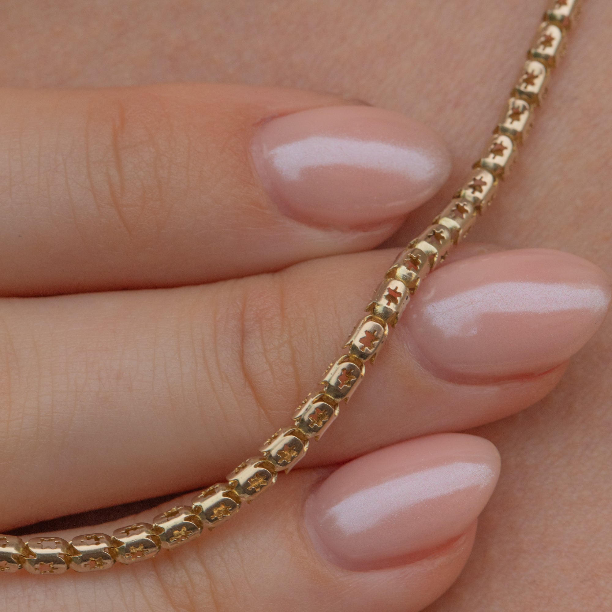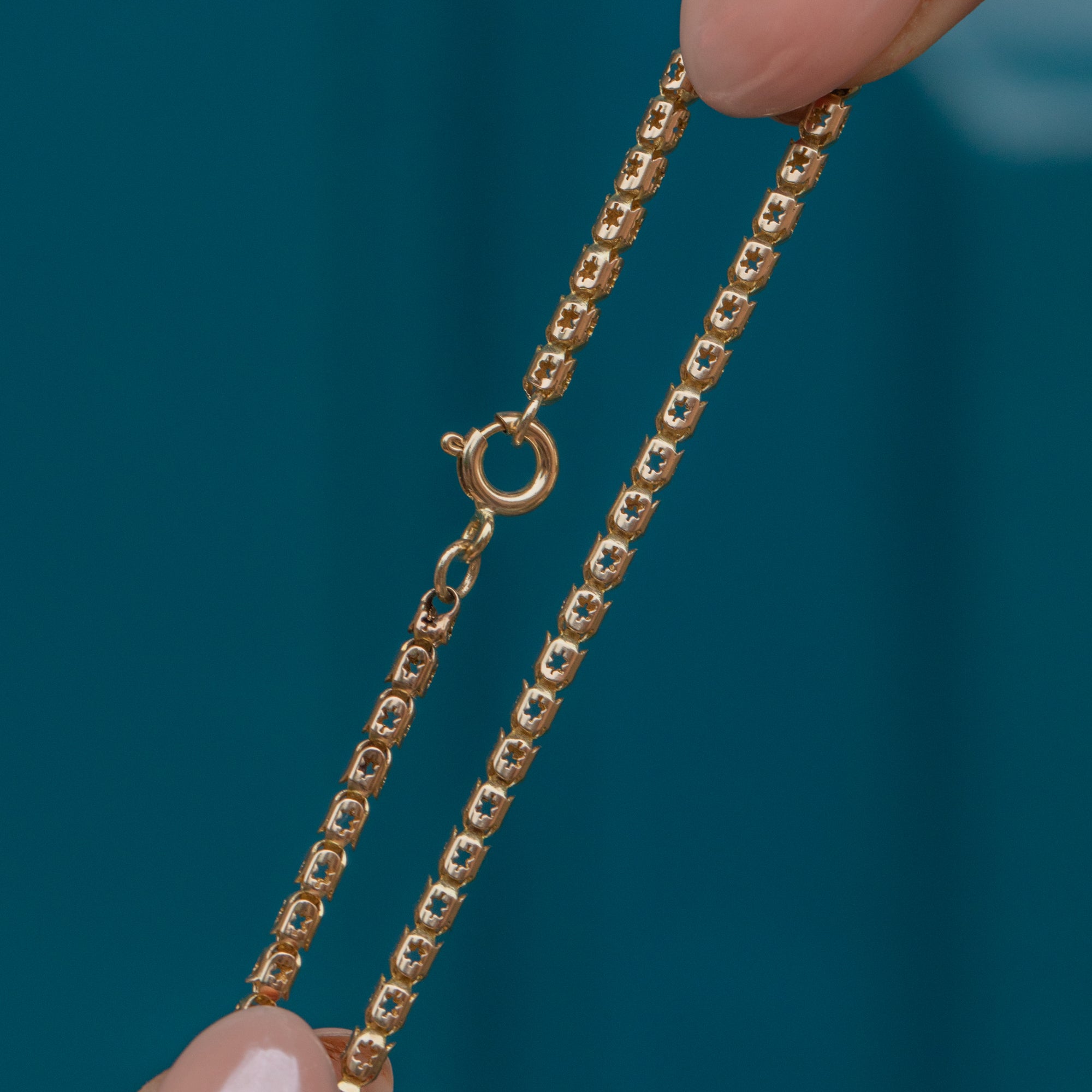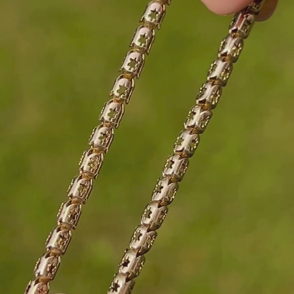 EXCELLENT. This Antique 9ct Gold pierced star chain is in amazing condition throughout! The chain possesses great movement and fluidity, and all of the pierced details are intact. Plus, the tone of the 9ct Gold is exceptionally bright, a rare tone of antique Gold which indicates that this piece has been perfectly preserved.