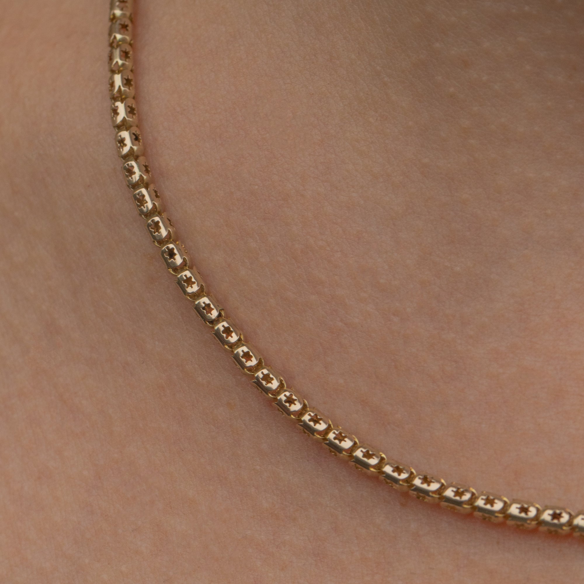 This 17" Antique 9ct Gold pierced star chain is so fabulous! A collectable and stylish antique chain with tiny star-shaped piercings dotted along the box links, making this the perfect find for any celestial jewellery lover.