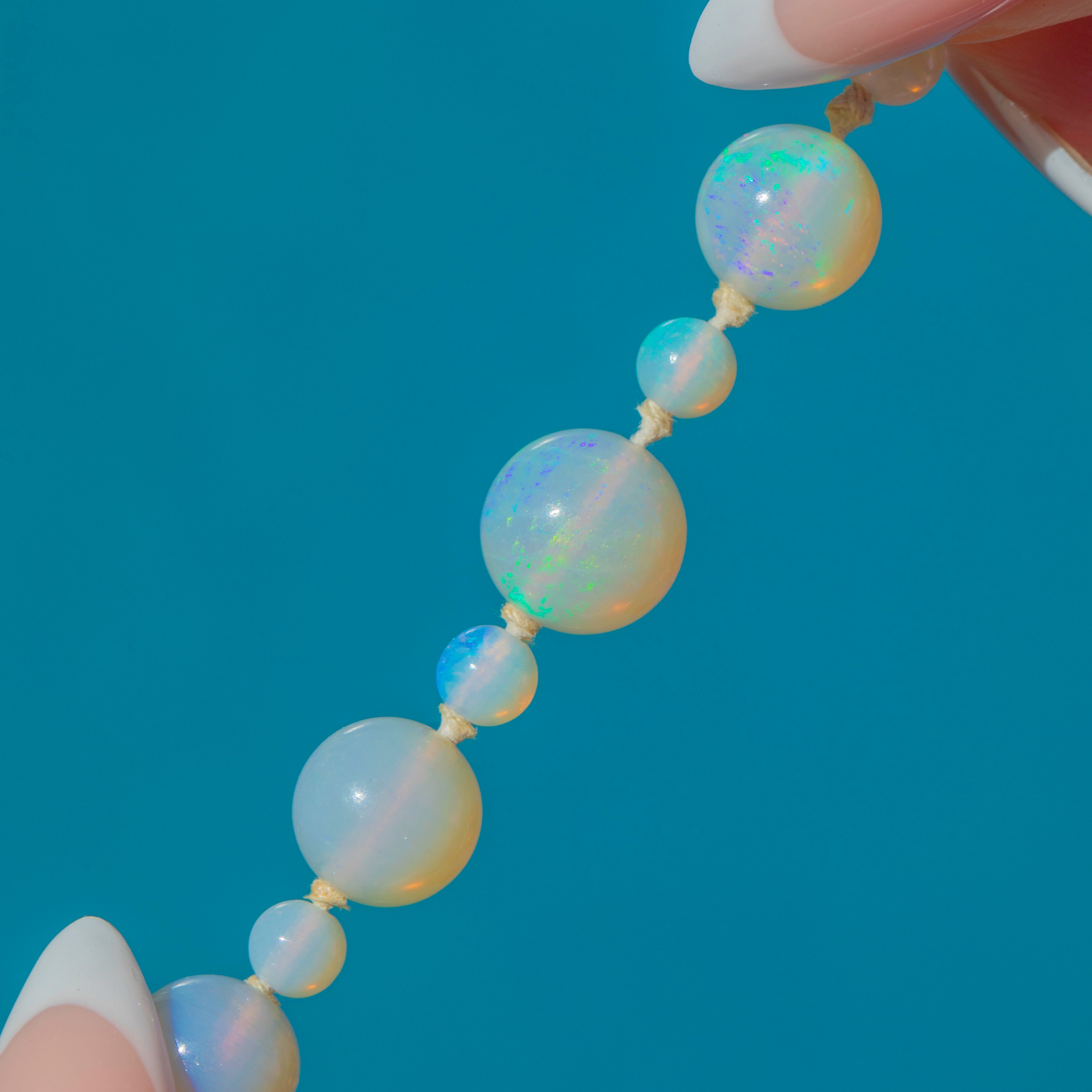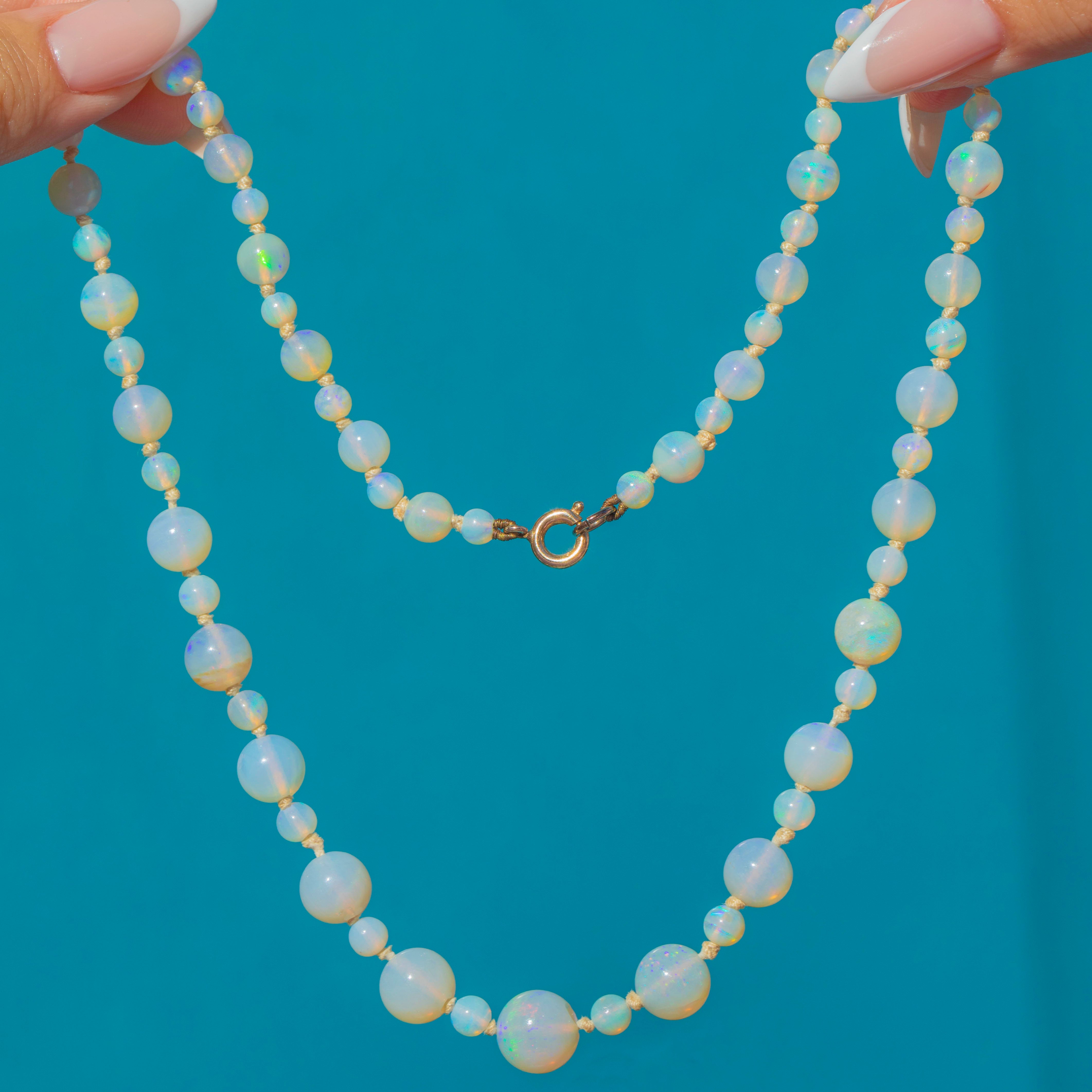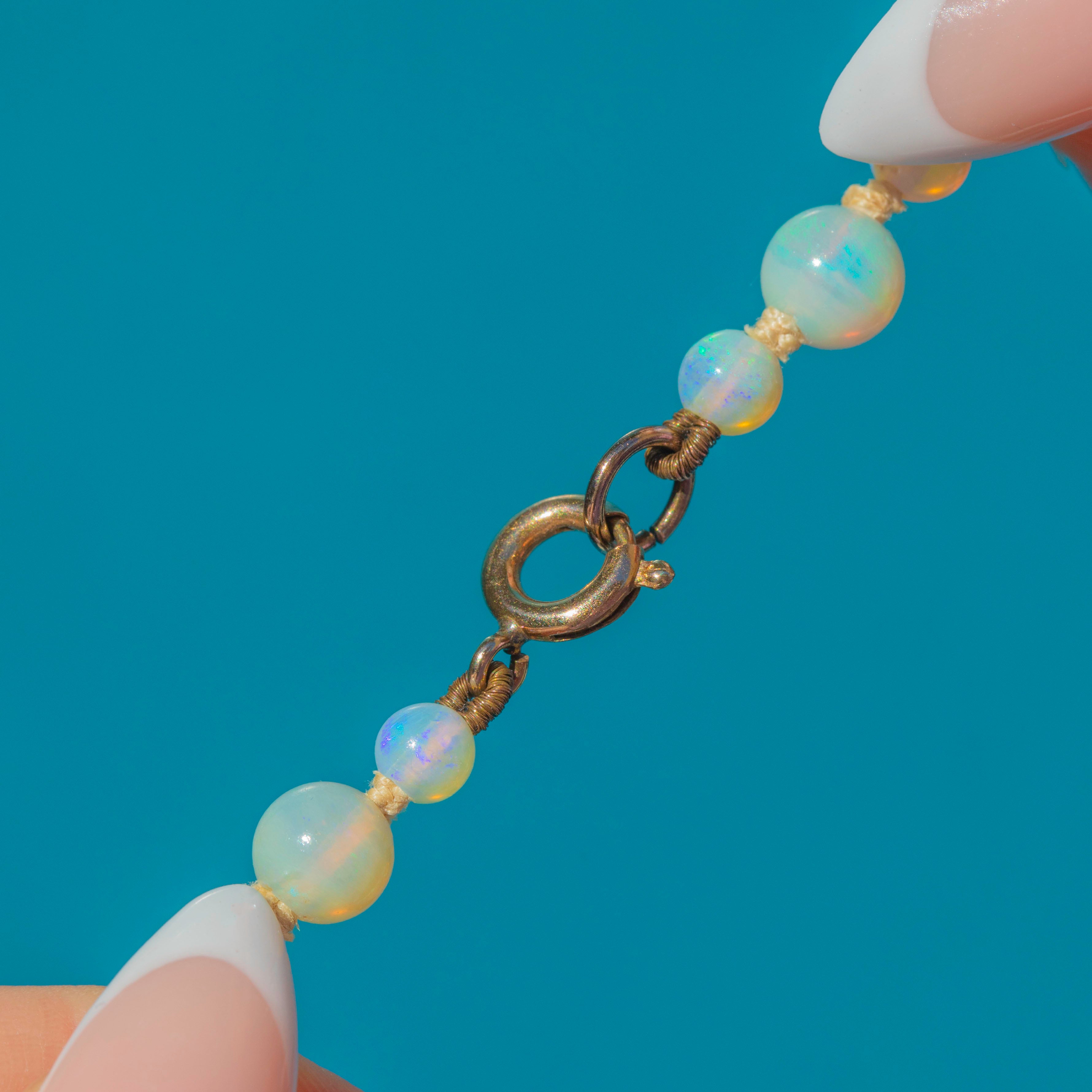 A glowing Art Deco Opal bead necklace strung with 63 beautifully matched gems. The Opals range from delicate 4mm to impressive 10mm beads, each one shimmering with a kaleidoscope of pastel colours and flashes of green, blue and orange. The graduated design gives the strand an elegant flow, making it a refined yet eye-catching statement piece.
