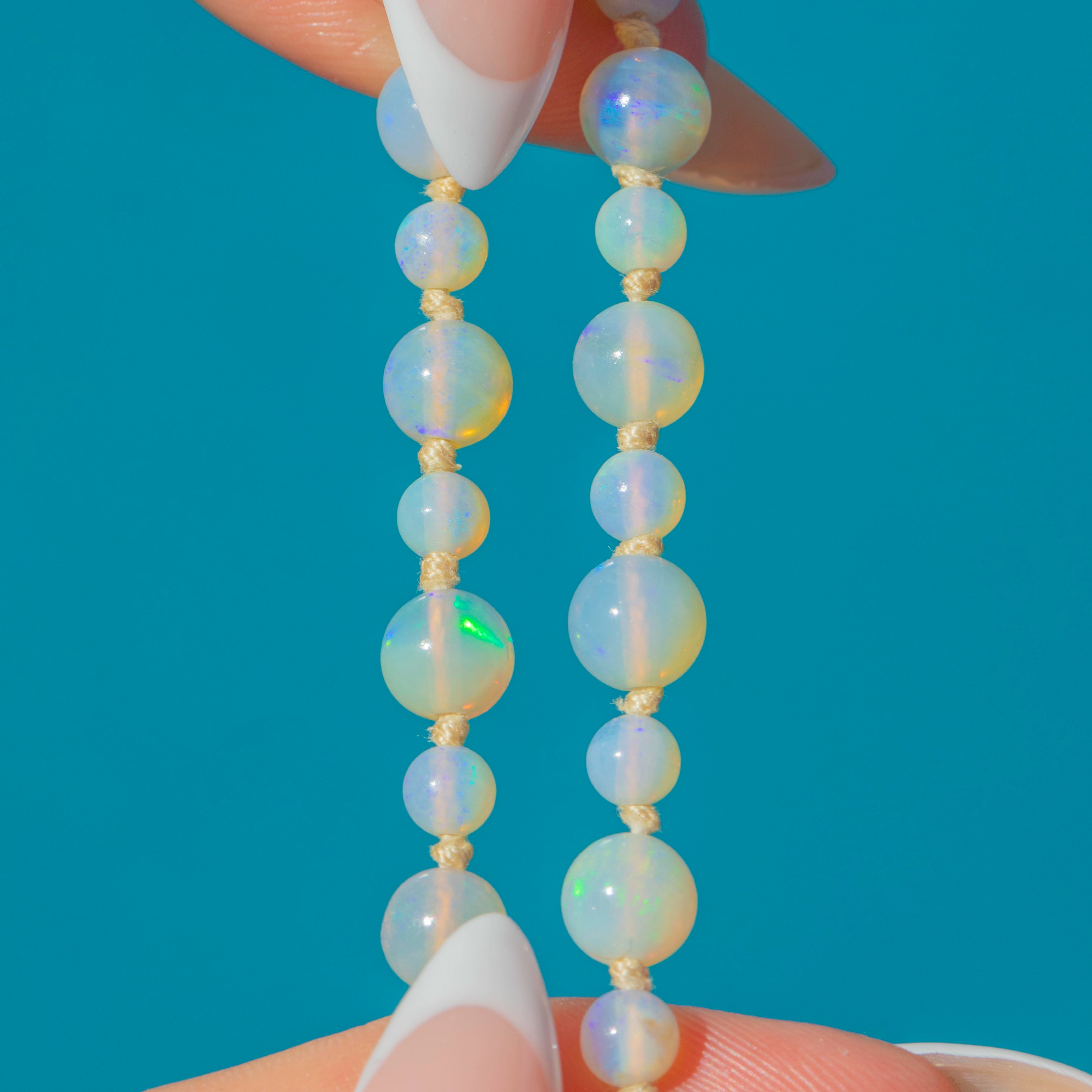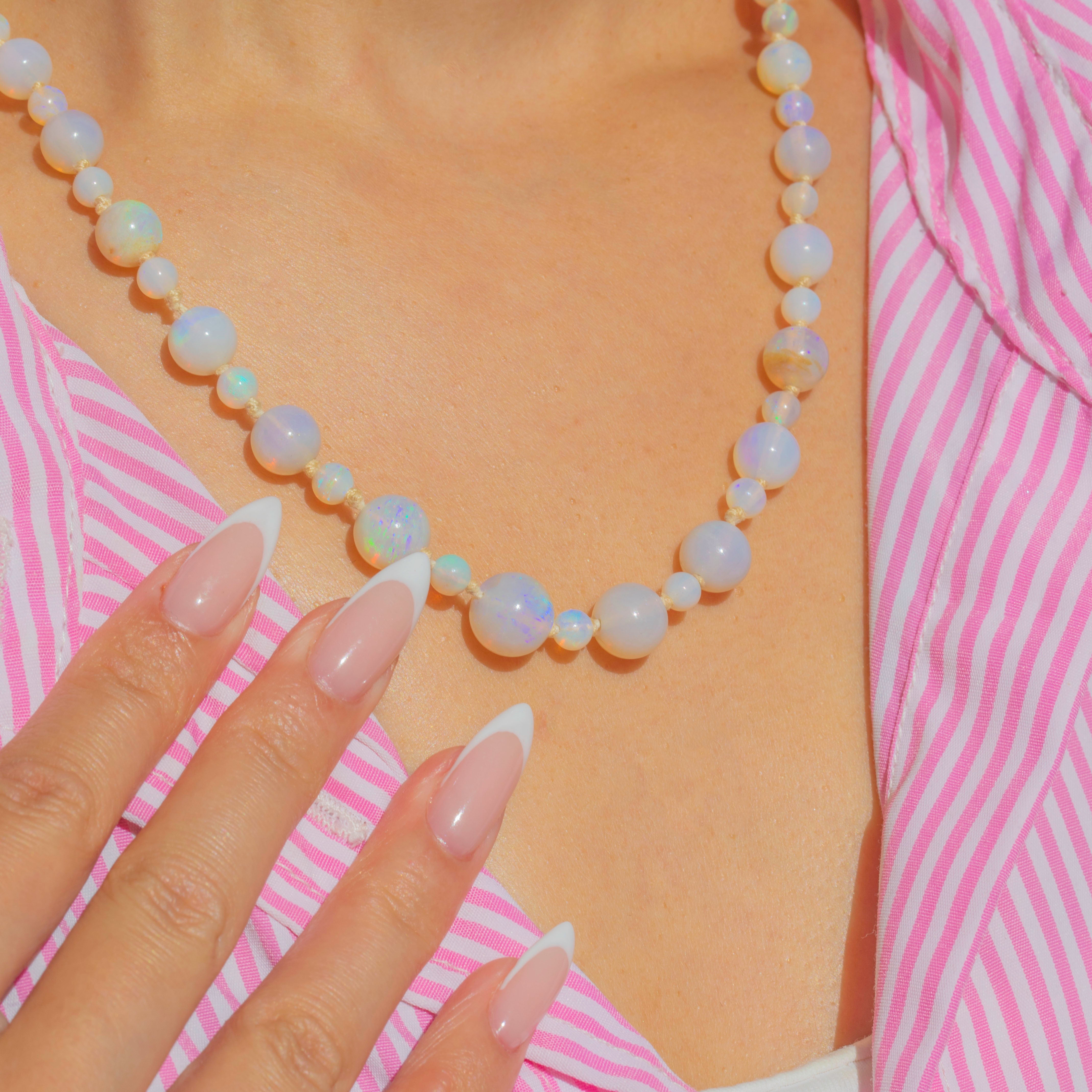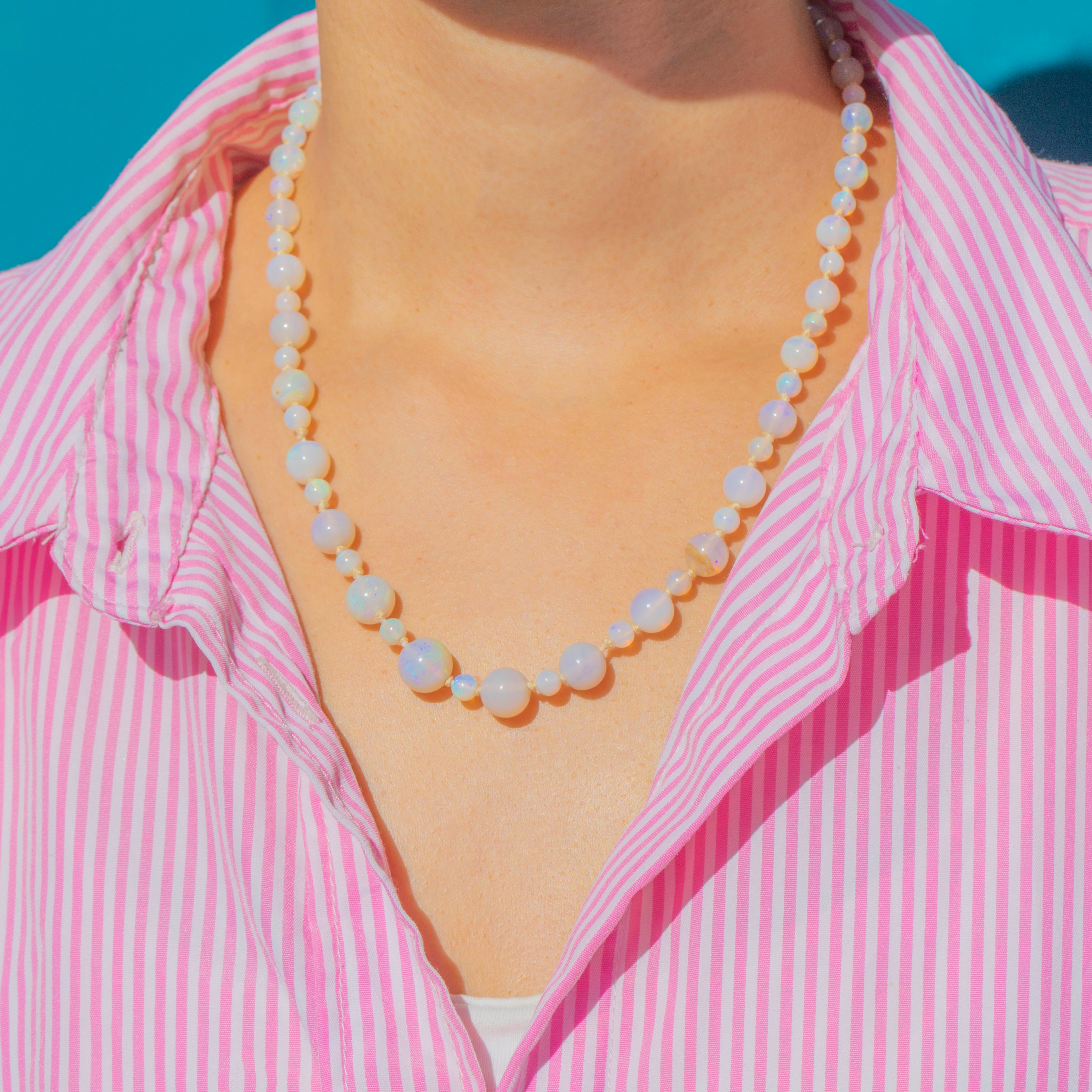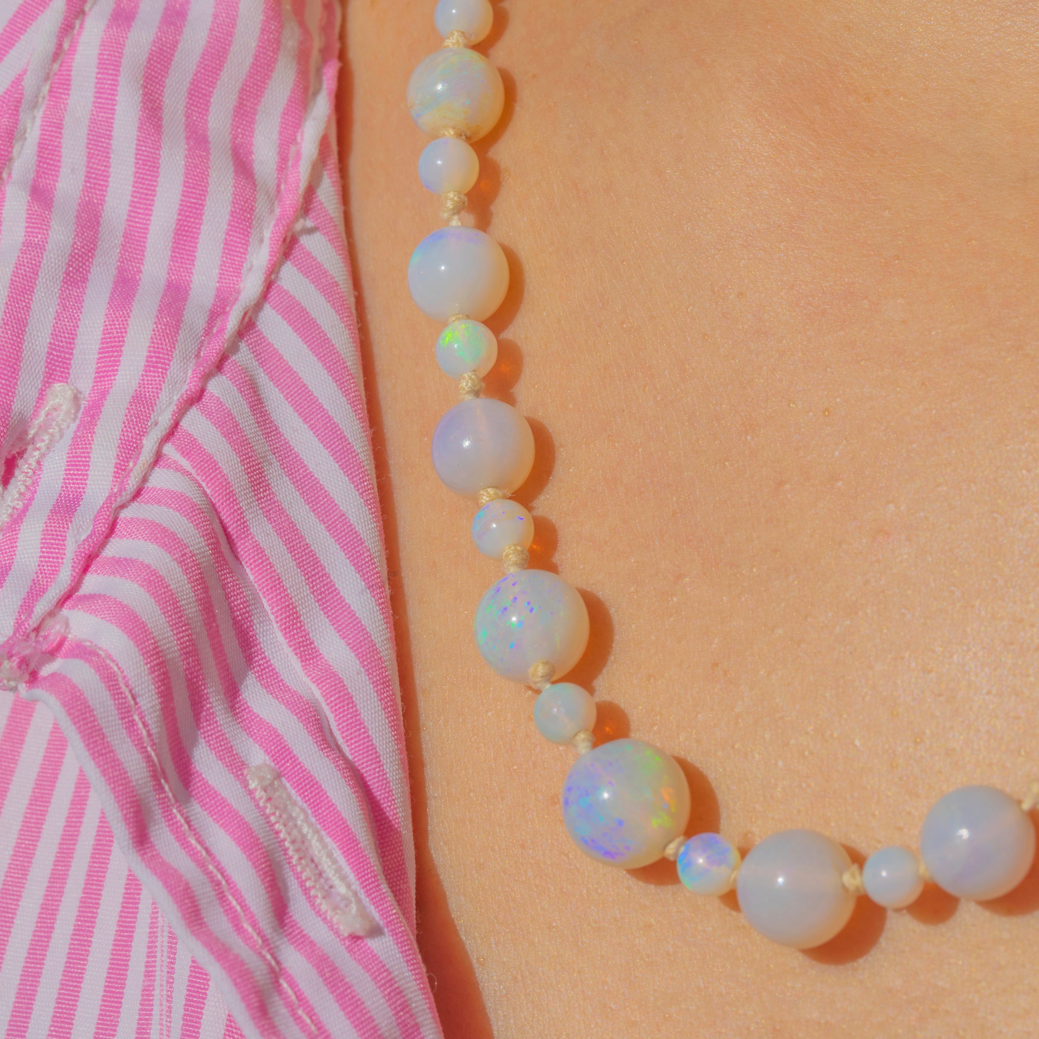 A glowing Art Deco Opal bead necklace strung with 63 beautifully matched gems. The Opals range from delicate 4mm to impressive 10mm beads, each one shimmering with a kaleidoscope of pastel colours and flashes of green, blue and orange. The graduated design gives the strand an elegant flow, making it a refined yet eye-catching statement piece.