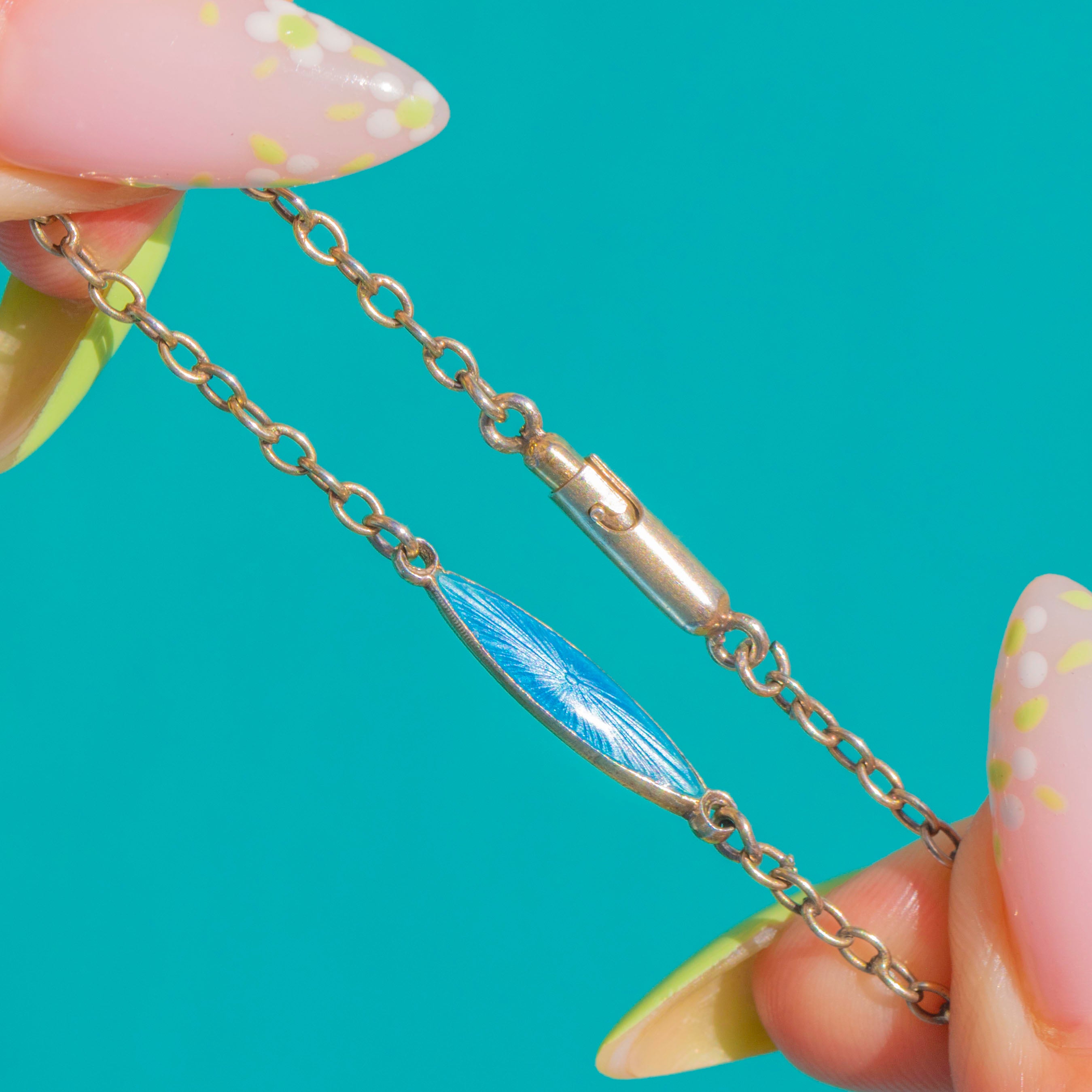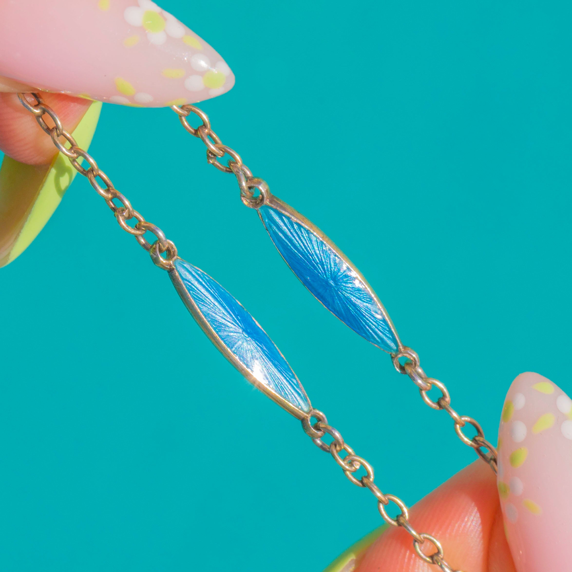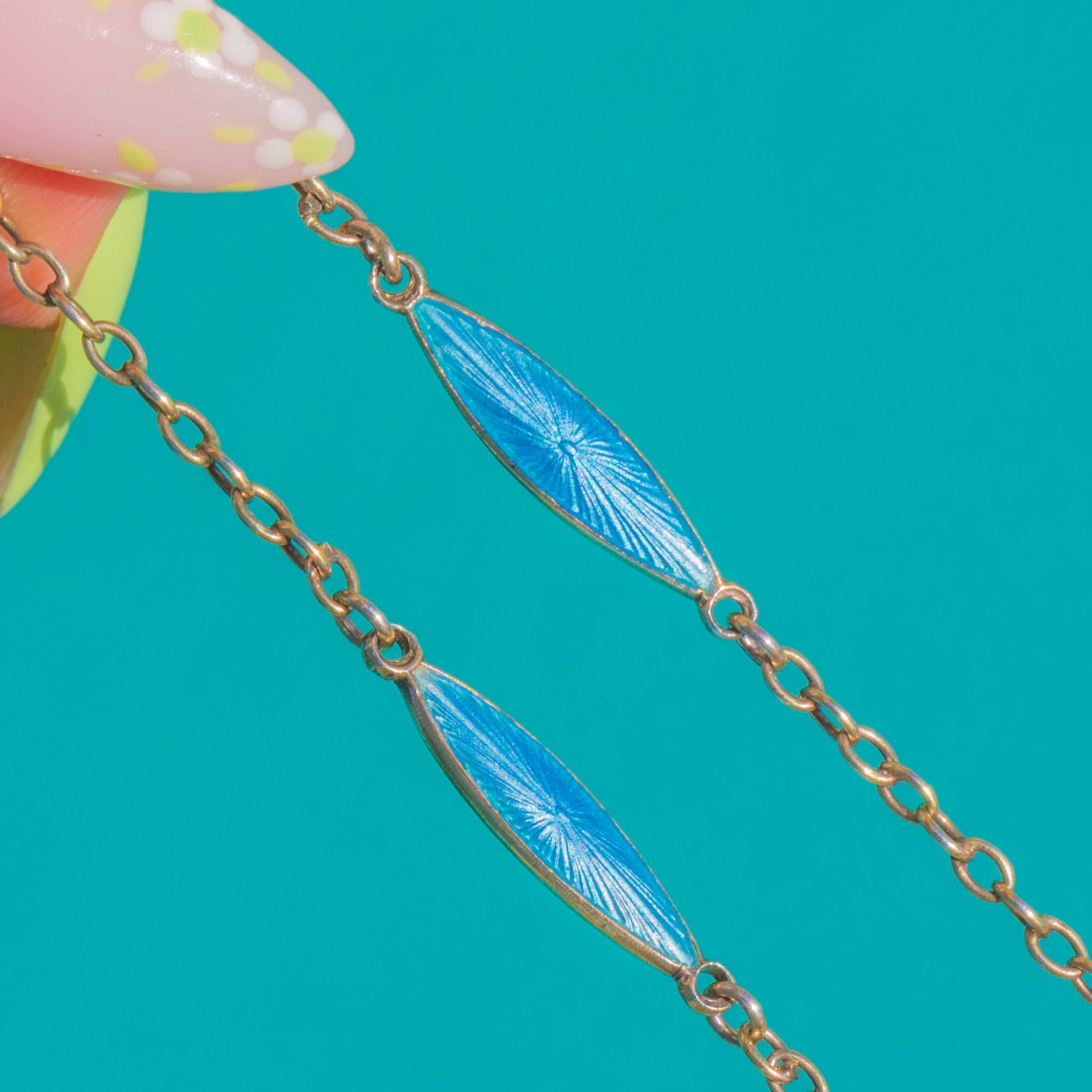 ひと目でわかるArt Decoの魅力を湛えたこちらのシルバーチェーンは、透き通るブルーのギヨシェエナメルが施された細長いロザンジュプレートが連なっています。それぞれのプレートには、ガラスのようなエナメルの下に繊細な放射状のスター バースト模様がエンジンターンで刻まれ、動くたびに光がきらめく美しい表情を見せます。