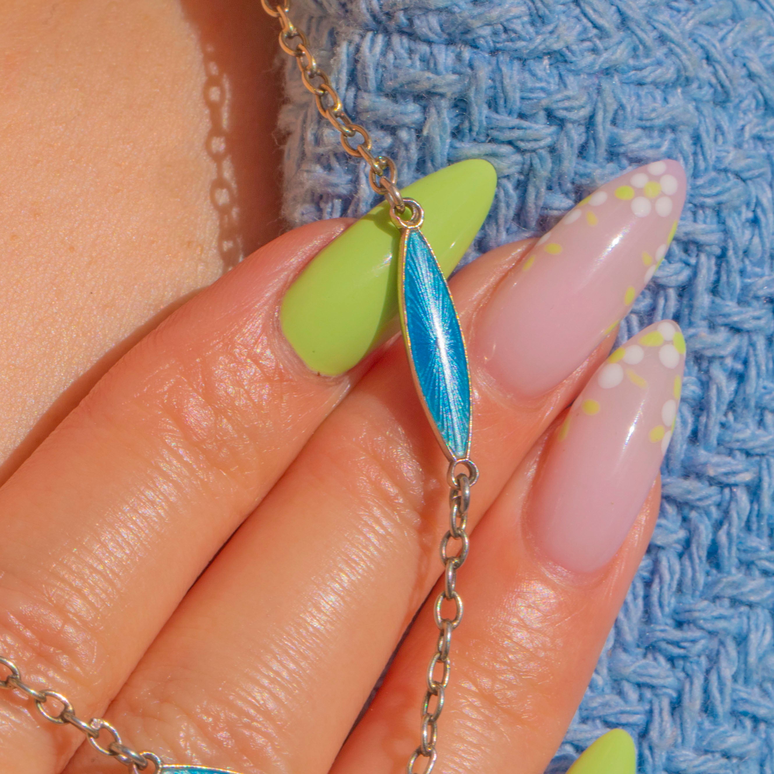可動式の構造と繊細なチェーンリンクがしなやかな流れを生み、デコルテに優雅に沿います。繰り返されるナヴェットシルエットが洗練されたグラフィックなリズムを演出。クラシックなバレルクラスプがヴィンテージの趣を完成させ、単独でも重ね付けでも華やかな彩りを添えます。