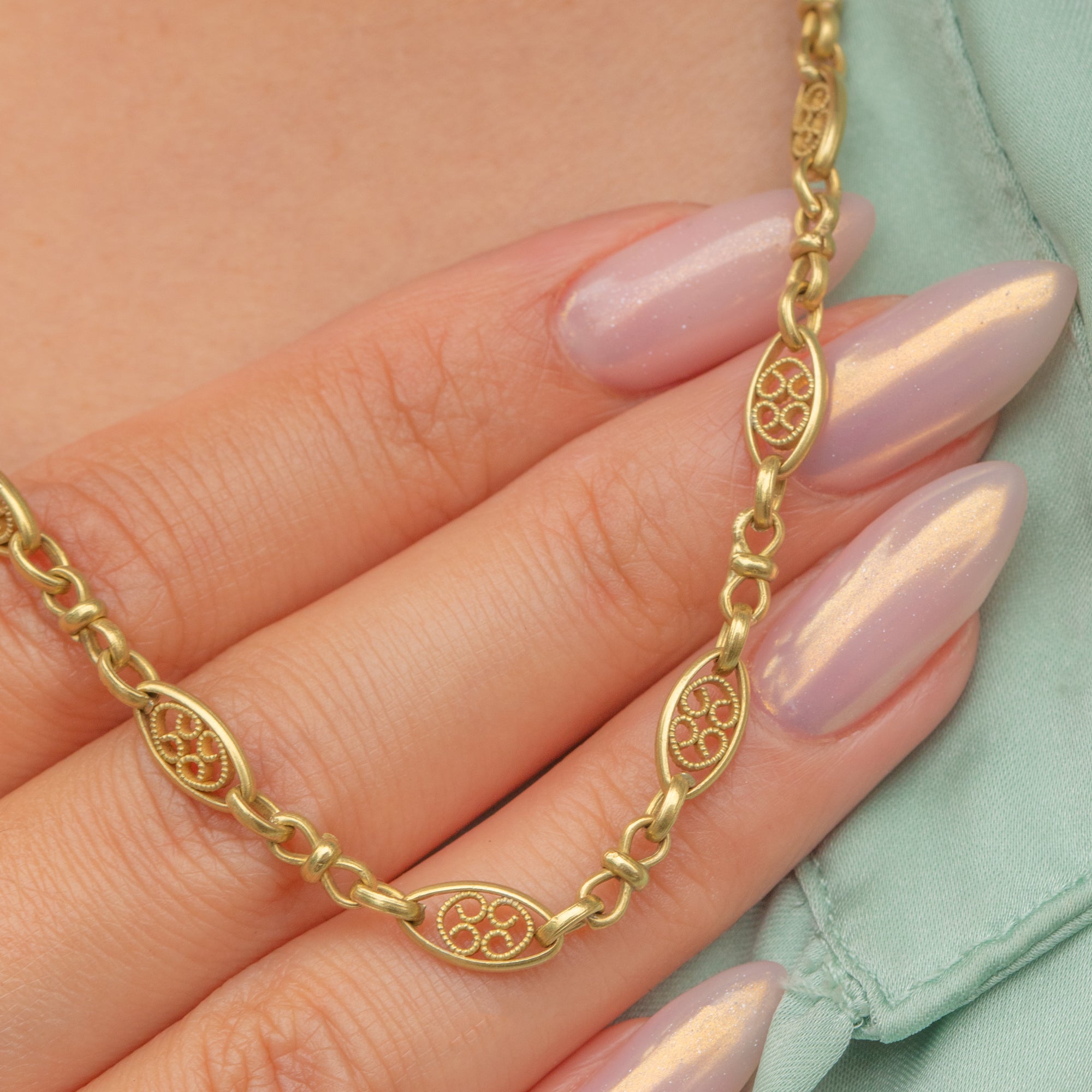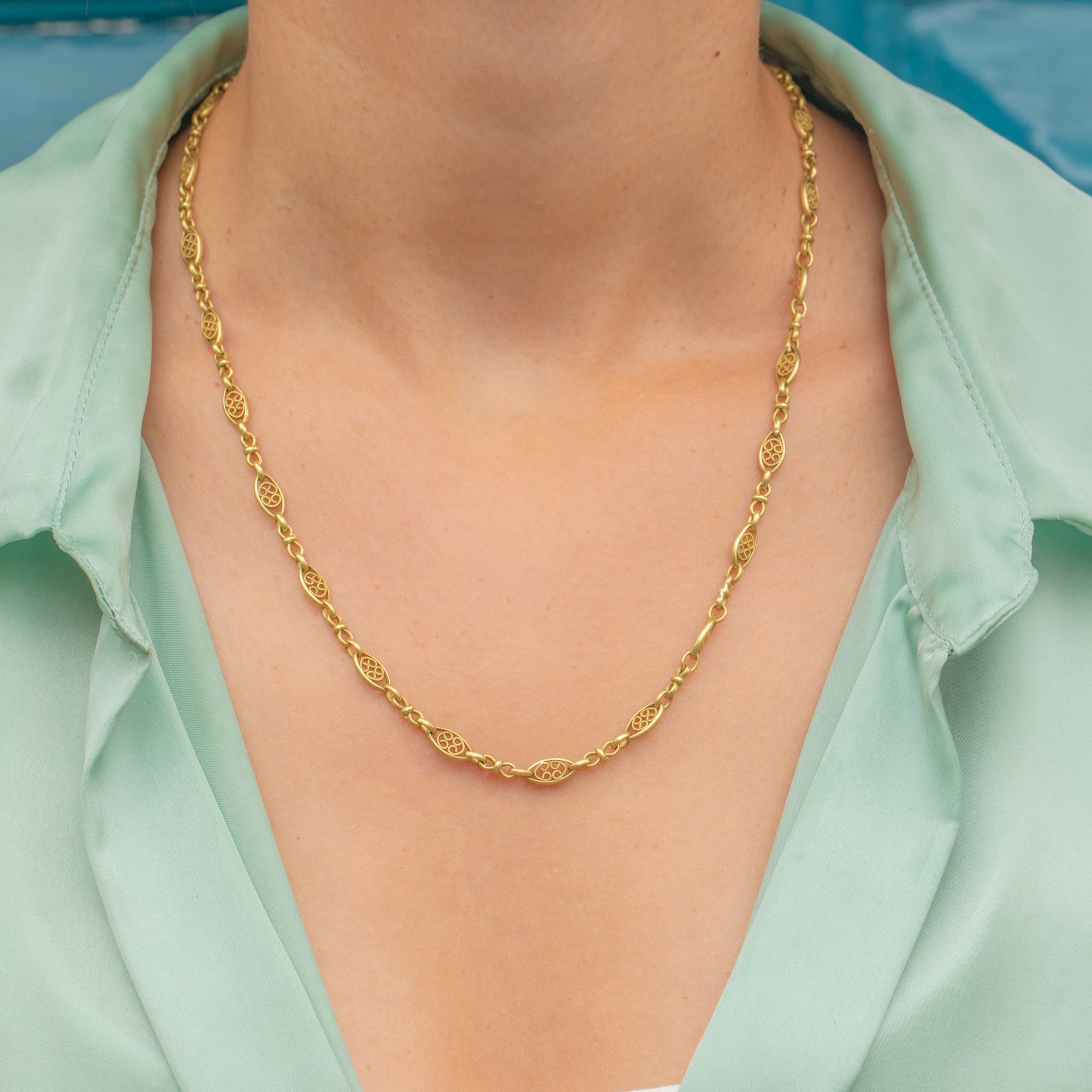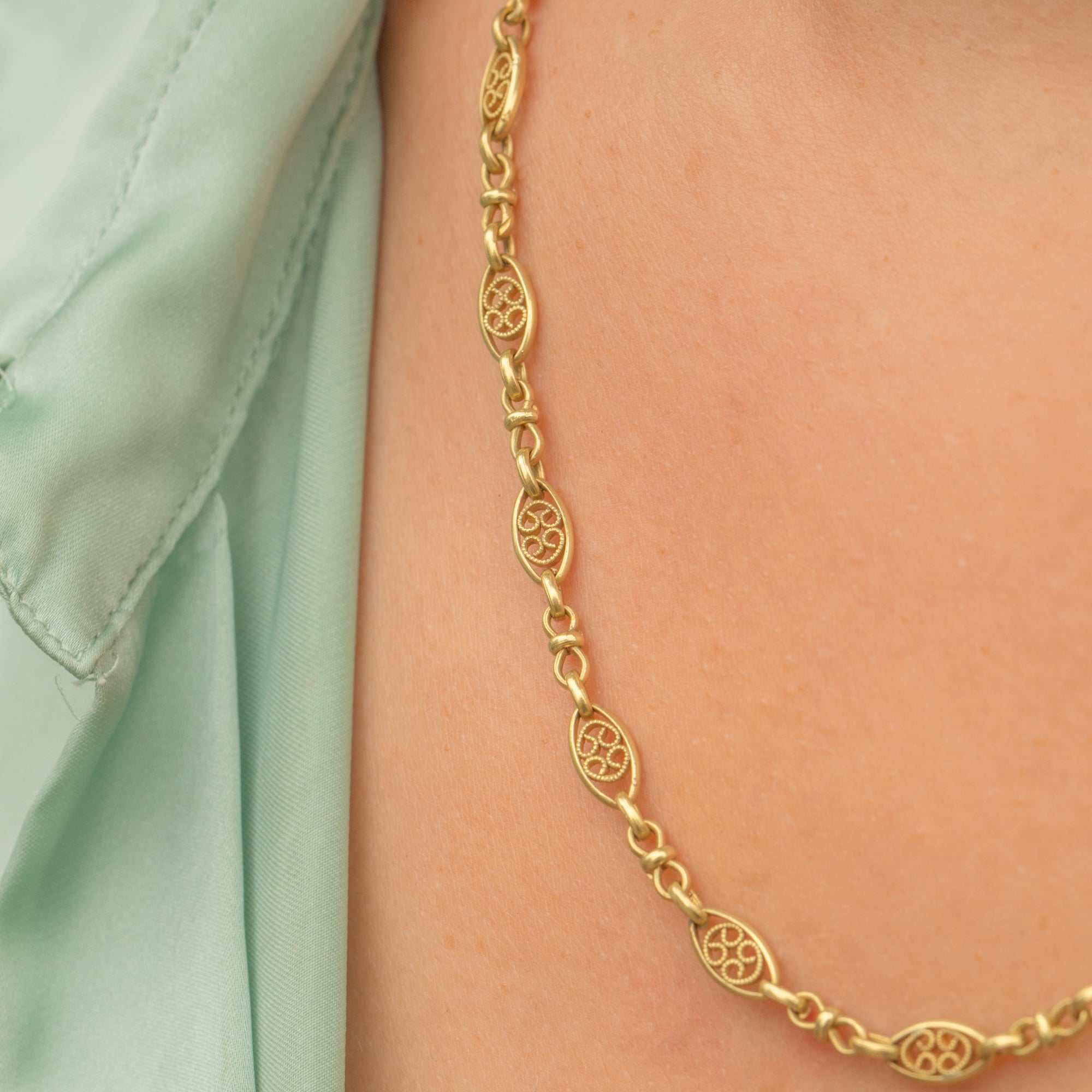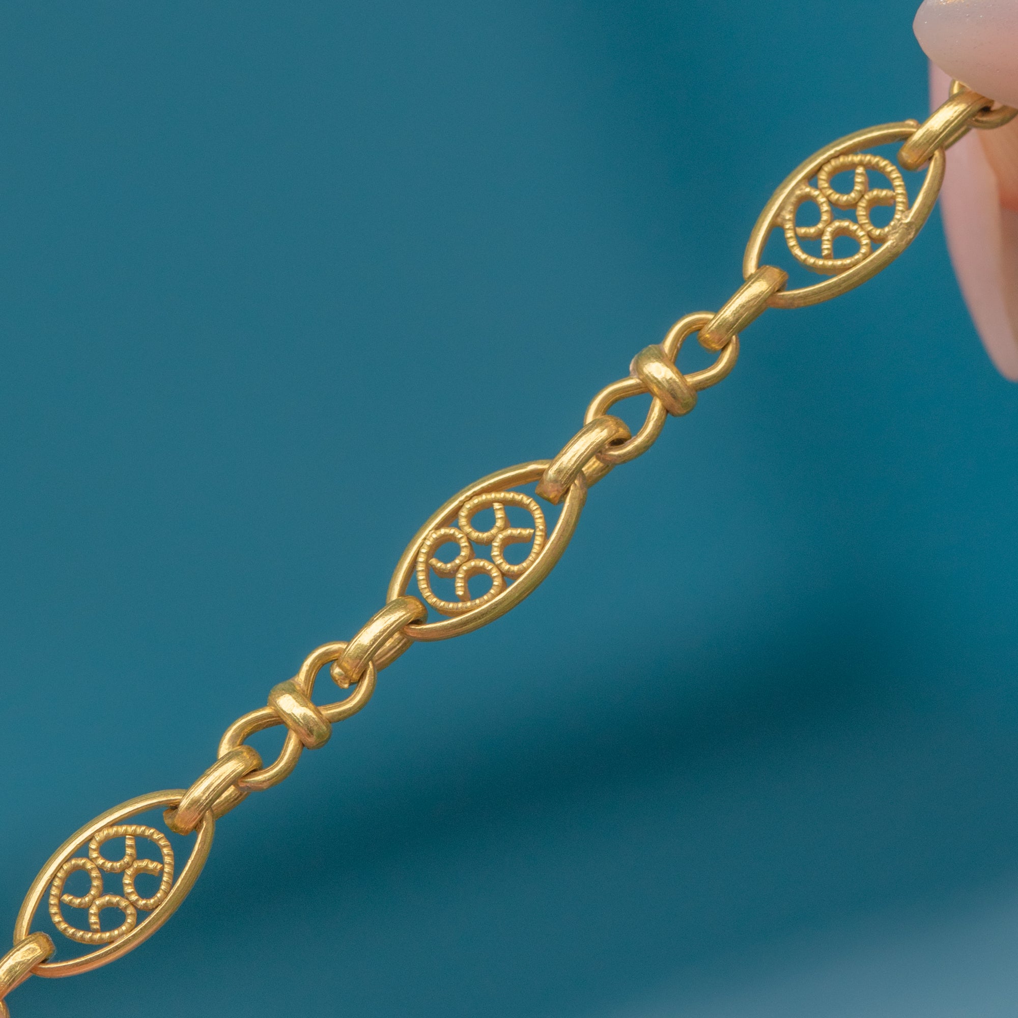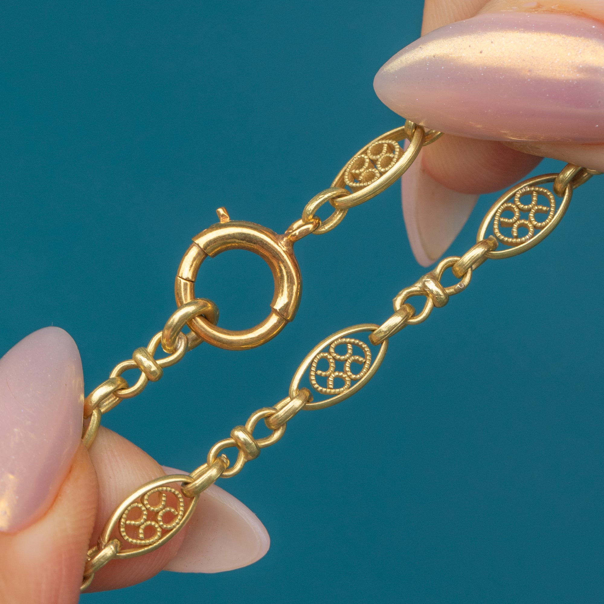 This beautiful French 18ct Gold necklace dates to the Belle Époque era, a period renowned for its elegance and refinement. Exquisitely crafted from buttery yellow 18ct Gold, this chain features ornate, fancy links which provide a lovely texture and depth.