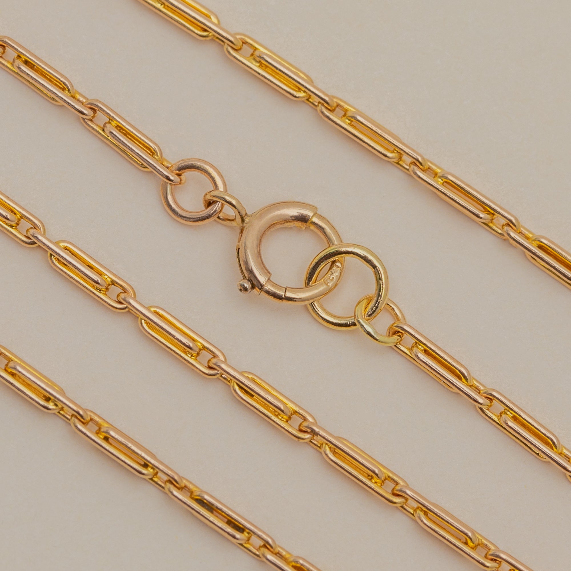 Her Gold bright and buttery and the chain features lovely double belcher links, providing wonderful texture and depth. She is complete with a generously sized dog-clip, a highly sought after feature which gives her a lovely unique quality.