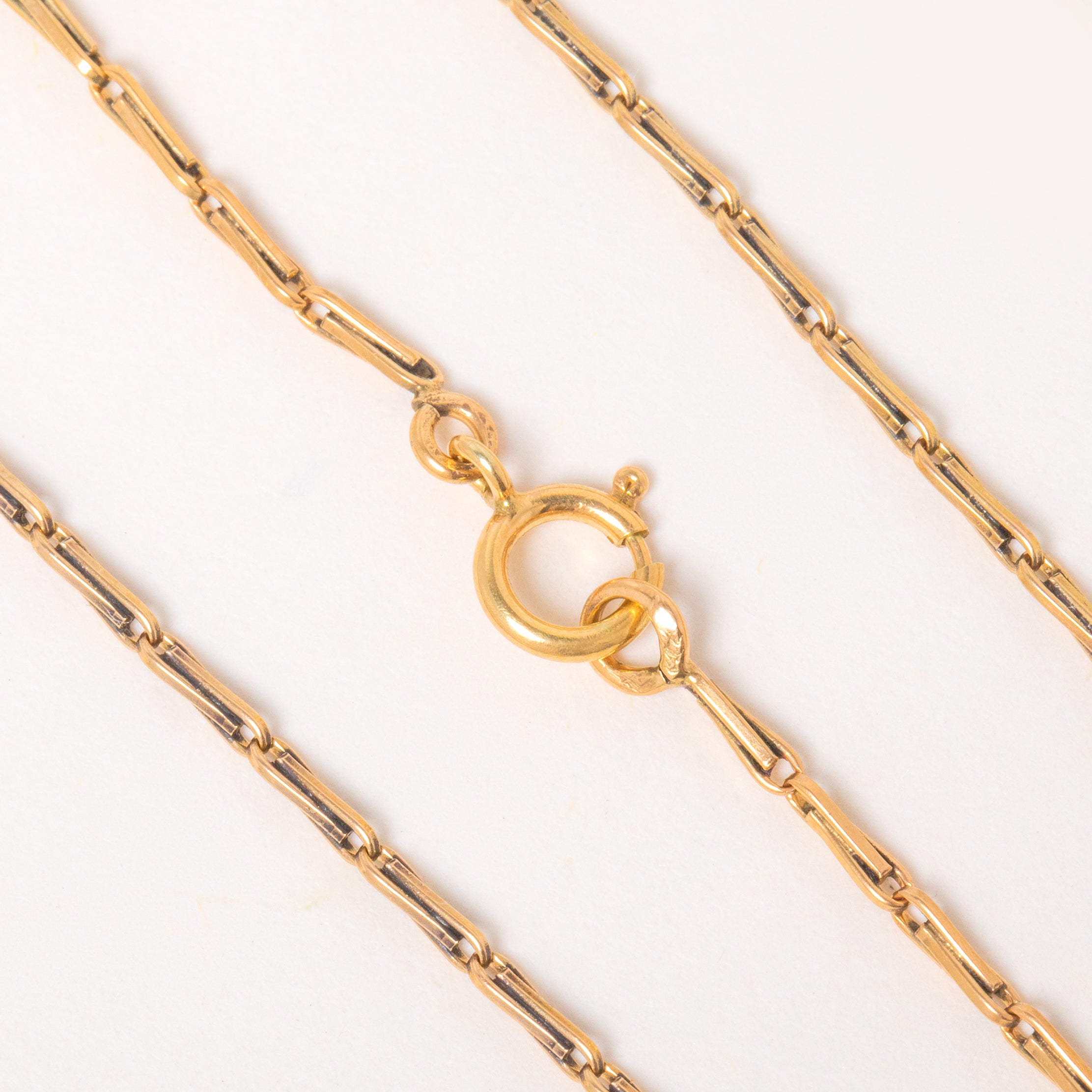 EXCELLENT. This 18.5" French 18ct Gold paperclip link chain is in excellent condition. The links are all secure, and there is a French Eagles head stamp for 18ct Gold, making her a highly collectible piece. The Gold is buttery, and the later added bolt ring allows for secure wear.