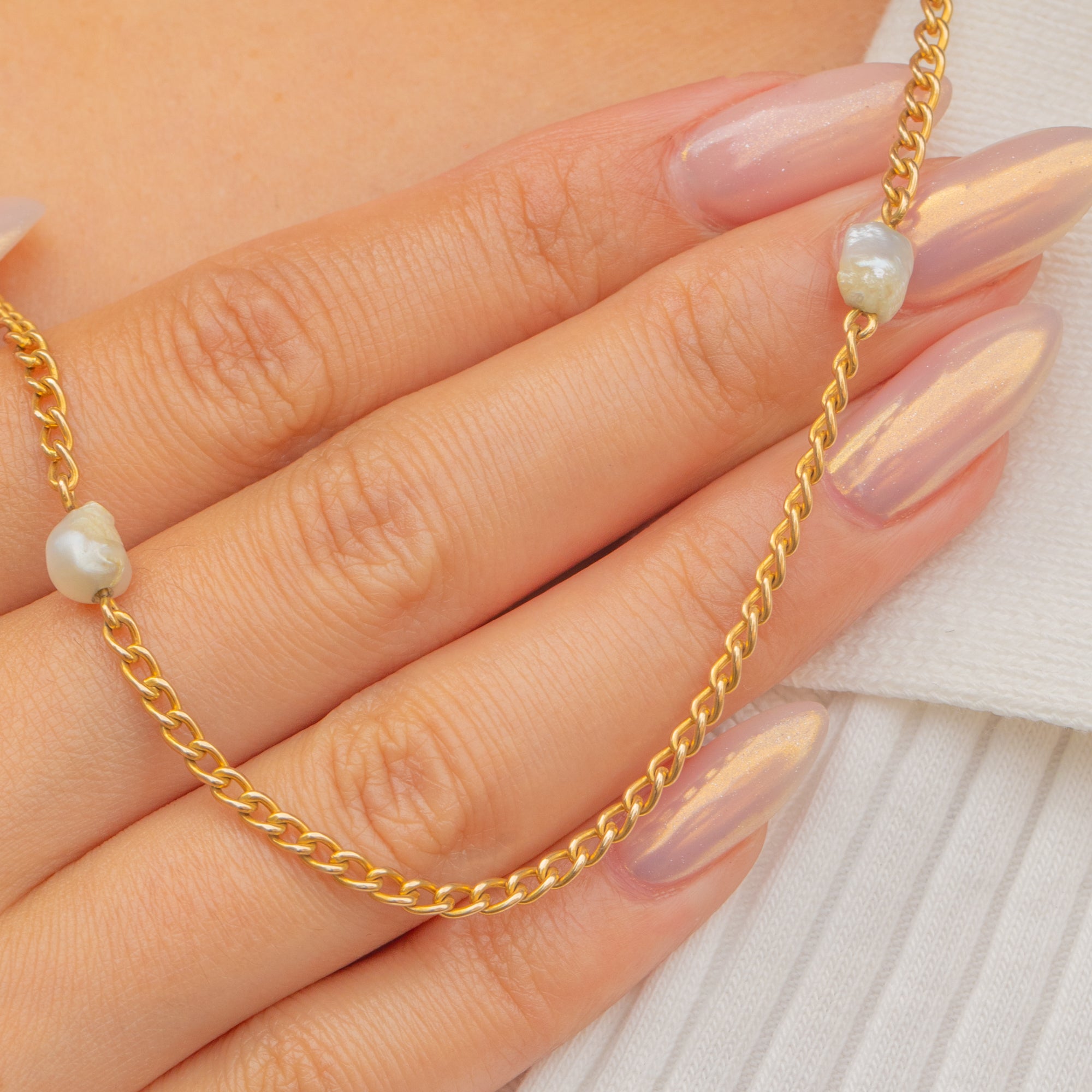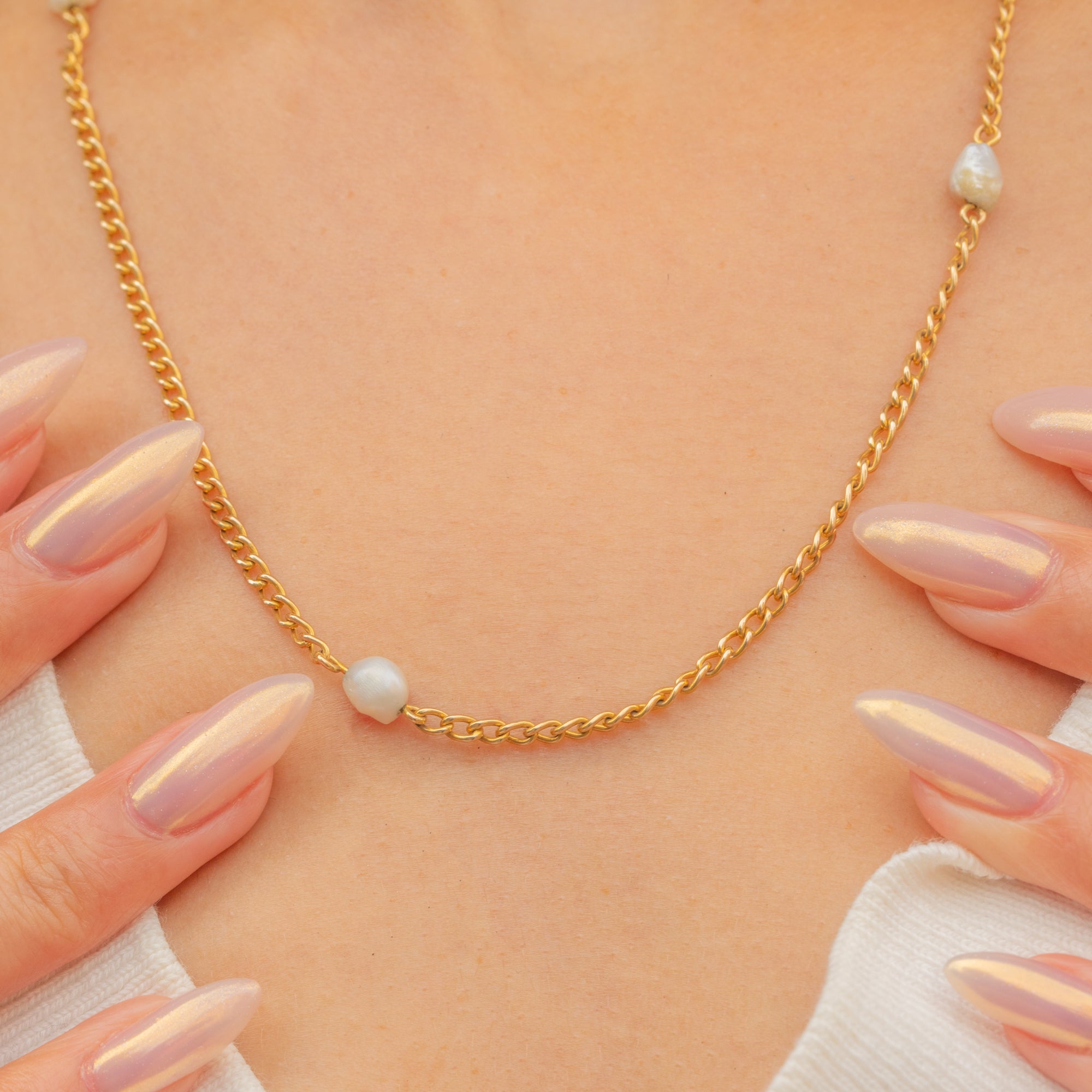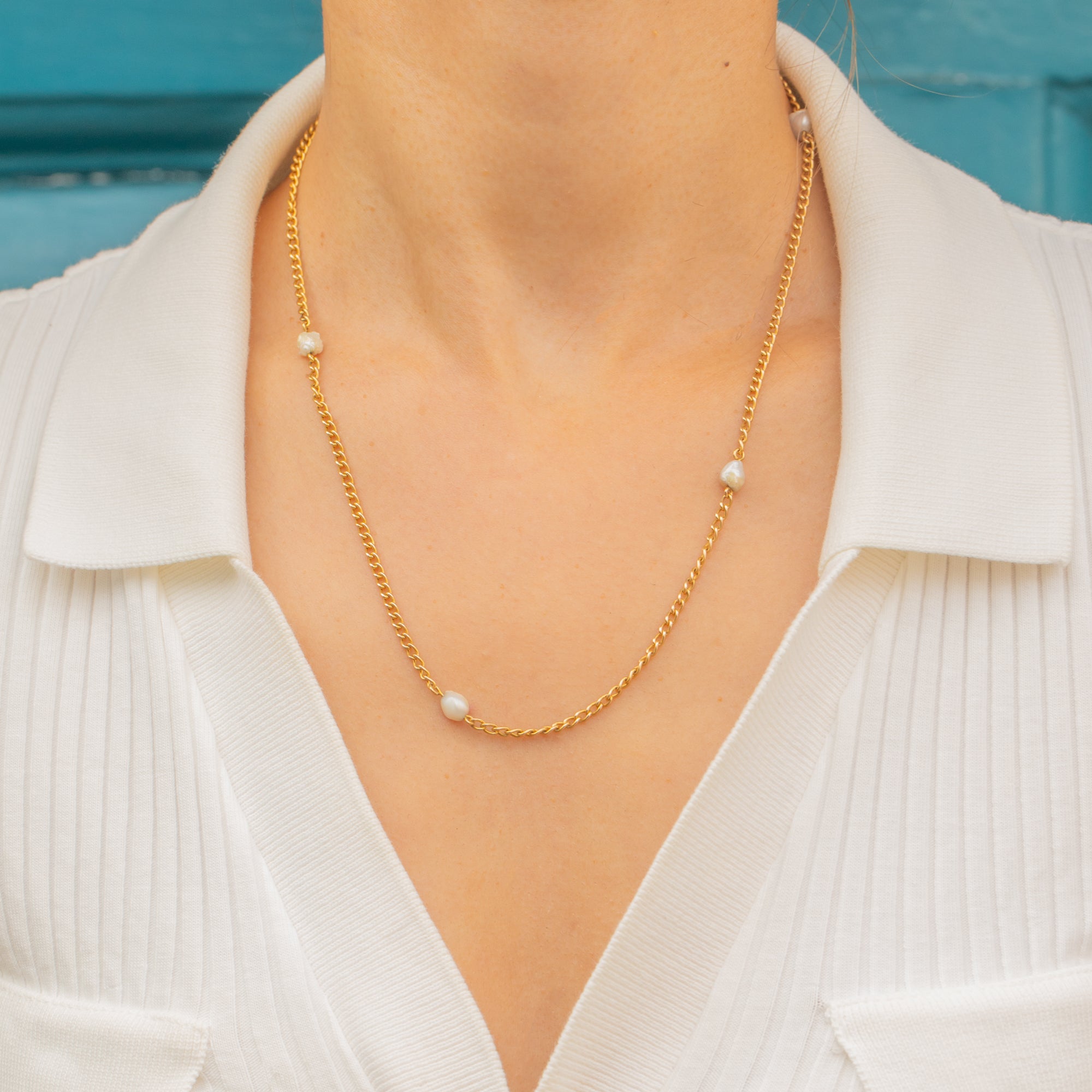 An exquisite Antique Victorian 14ct Gold station chain, featuring delicately spaced Baroque Pearls along its length. Each pearl boasts a charming, organic shape, offering a subtle lustre and individuality to the piece.