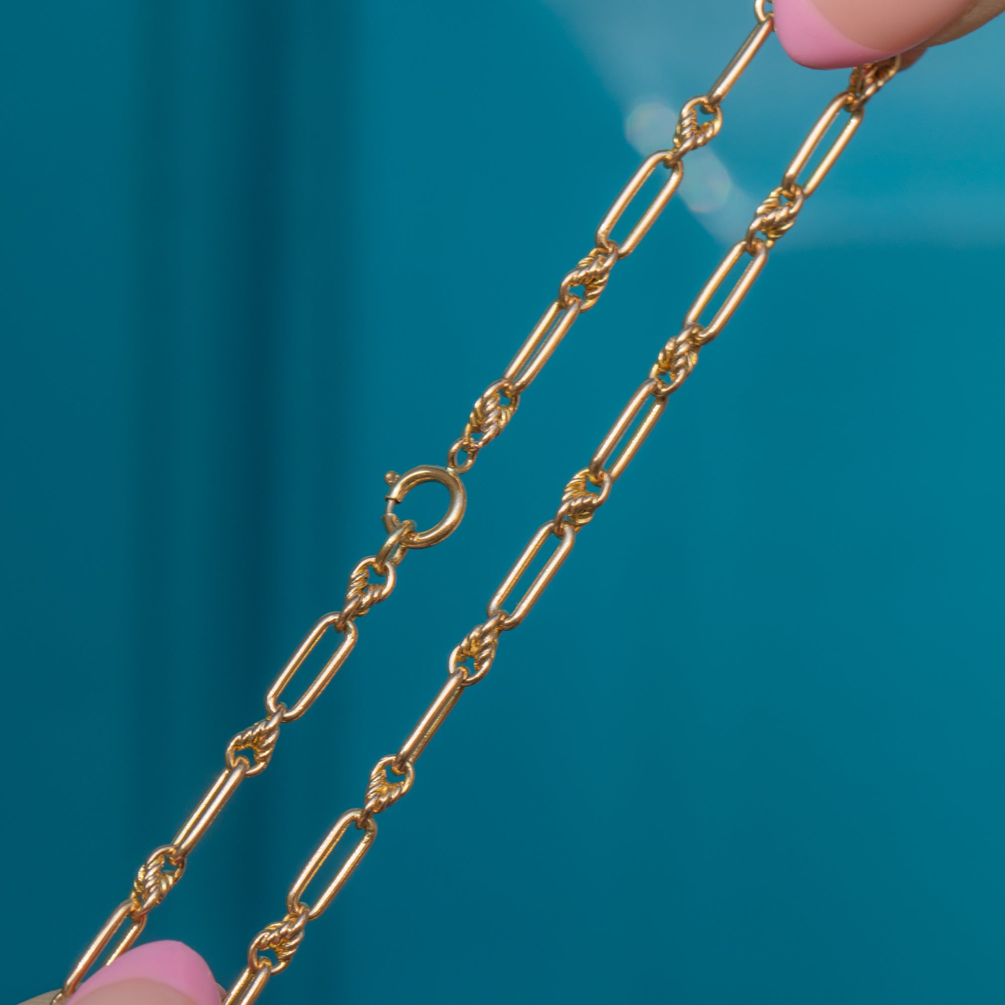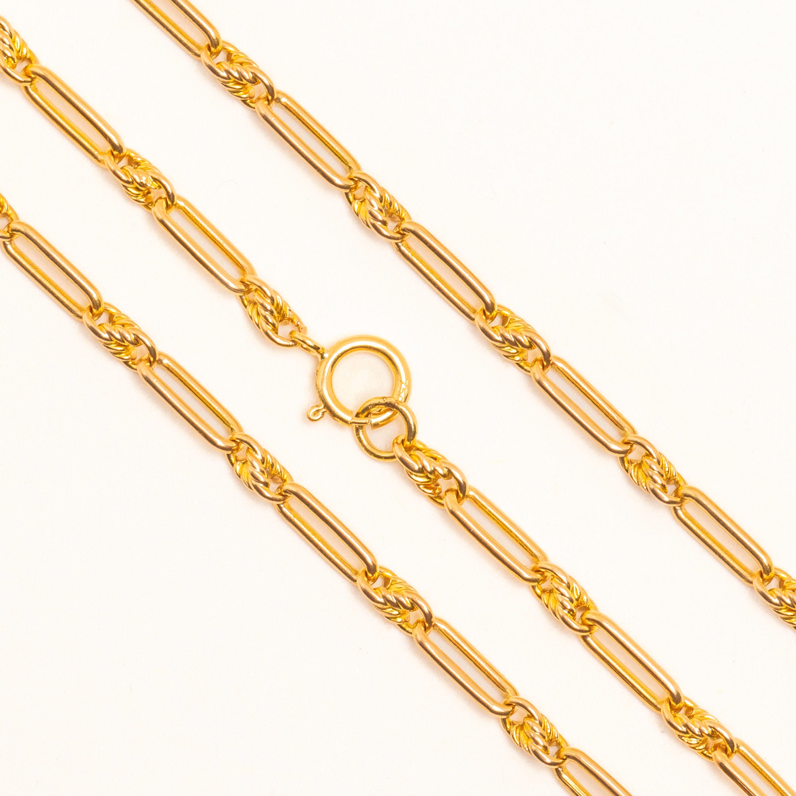 EXCELLENT - With perfectly connected links, a fully functioning bolt-ring and mouth-watering 15ct Gold, this 18" antique 15ct Gold lover's knot chain is in excellent condition! The links are smooth and have the most wonderful bright yellow hue. No damage or wear to note. She's beautiful!