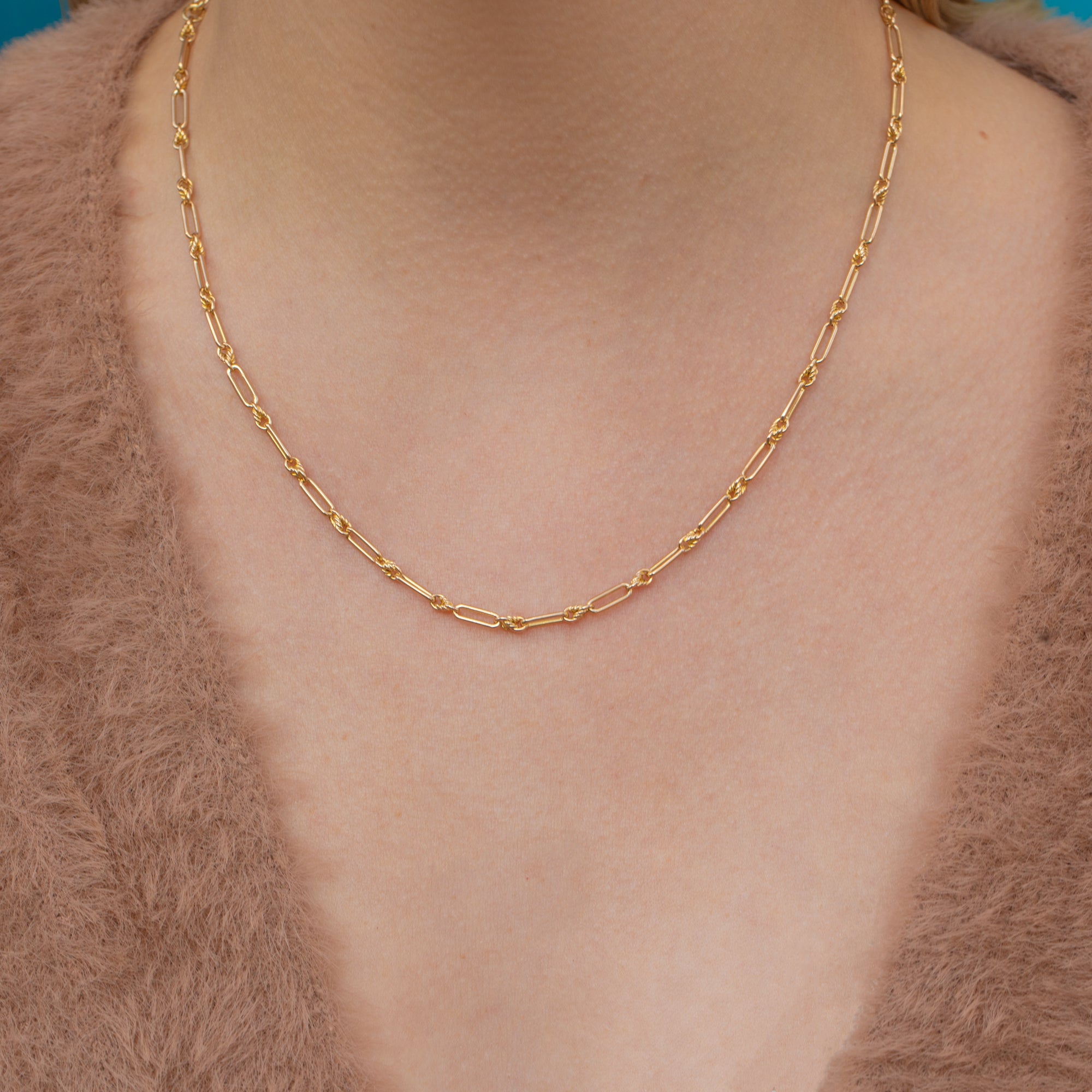 Crafted from sumptuous 15ct Gold, her trombone links are intertwined with smooth and buttery lover's knots, creating an effortless drape across your décolletage.