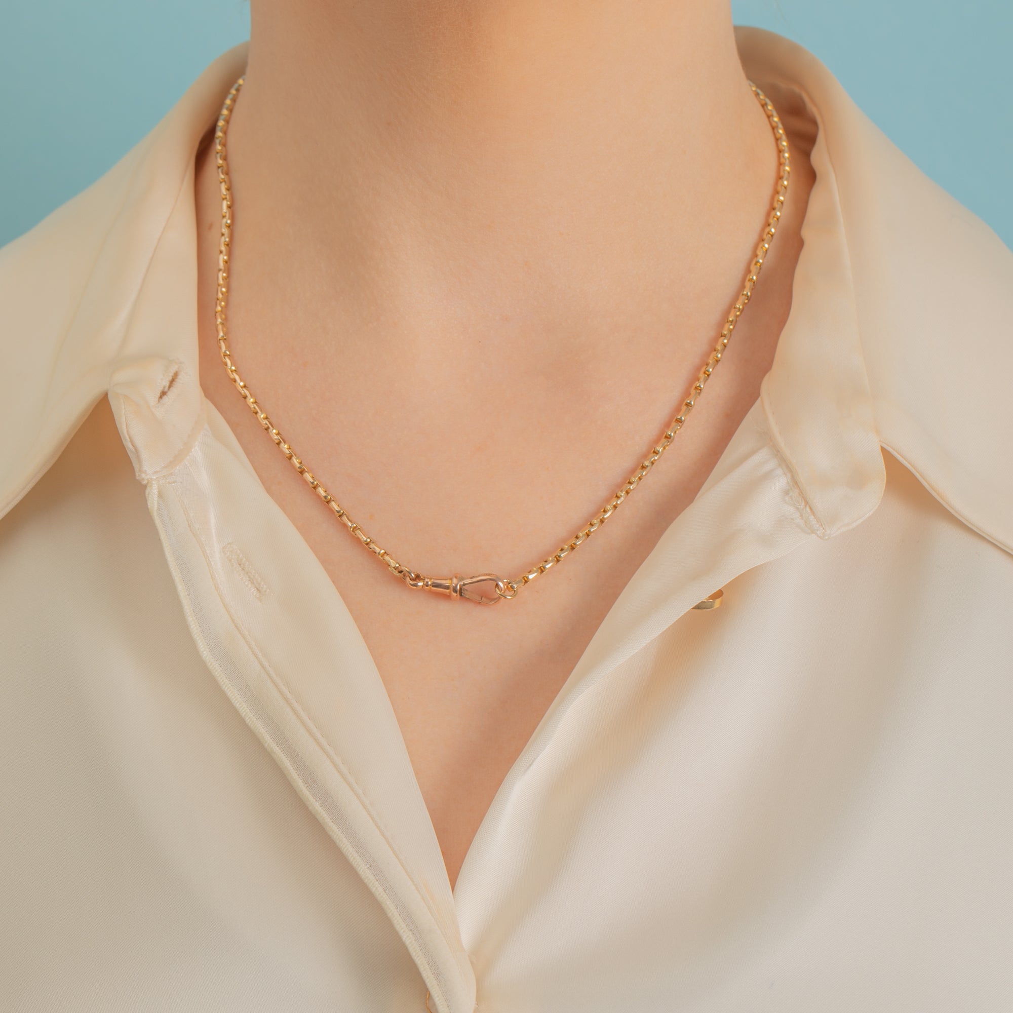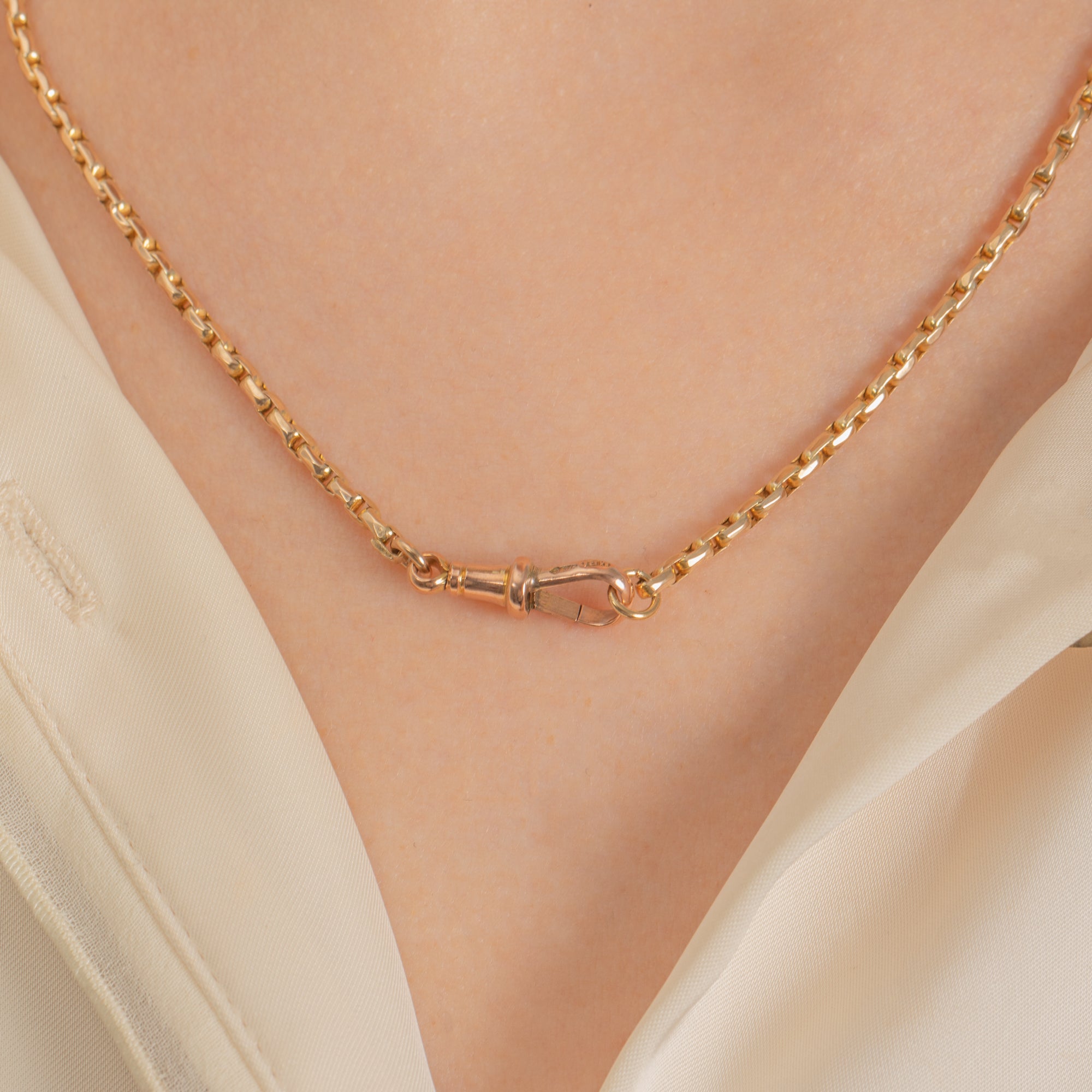 One can never have too many antique Gold chains, and the beauty of this piece is that her chunky belcher links are slightly square in shape, giving you texture and depth. She is complete with an adorable antique dog clip, a highly sought-after addition to any Victorian Gold chain!